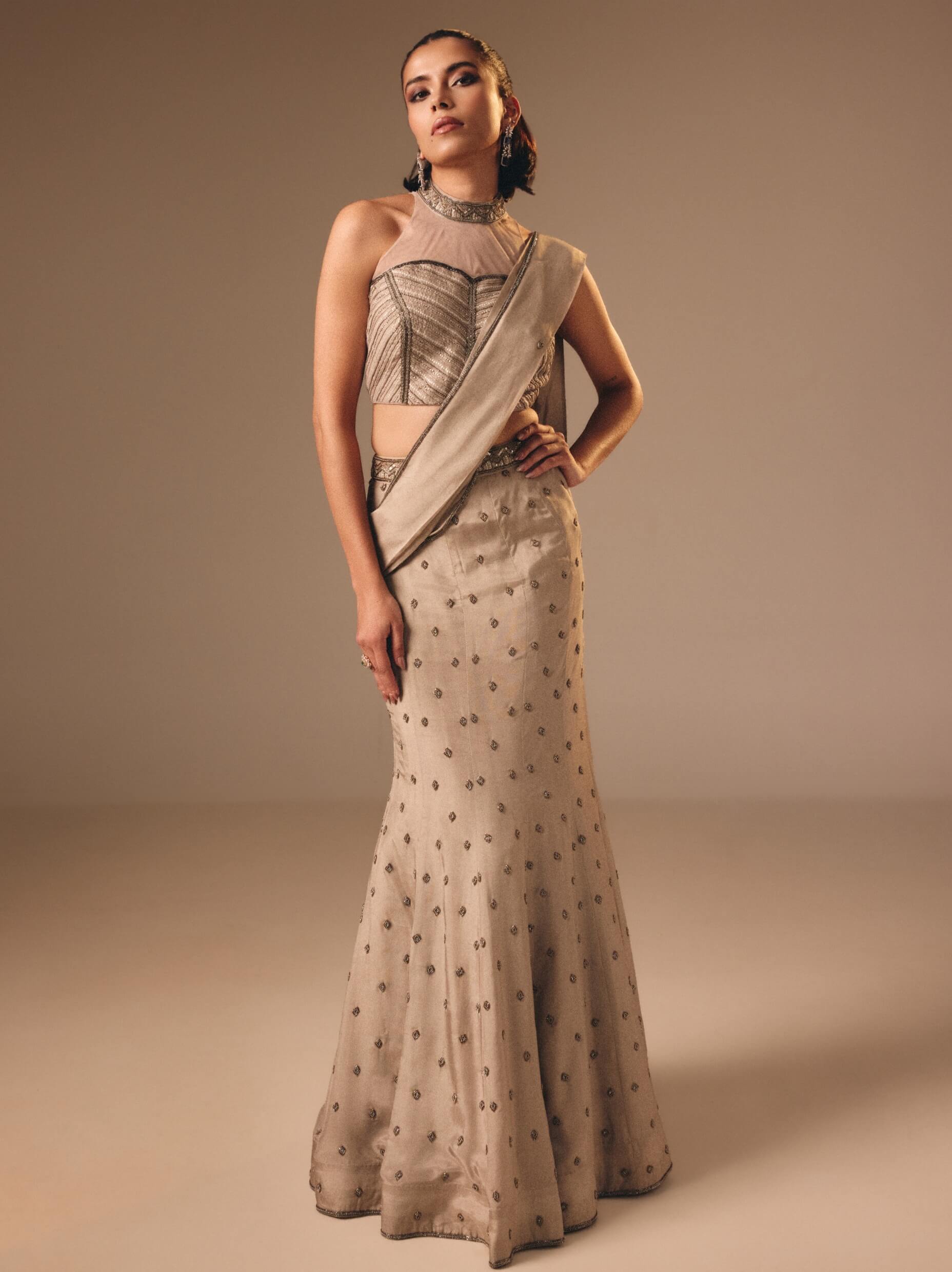 Modern elegance meets couture detail in this gray fish-cut lehenga with an attached draped silhouette. Crafted in satin organza and silk, it features poth and cutdana diamond buttis with an embroidered belt.