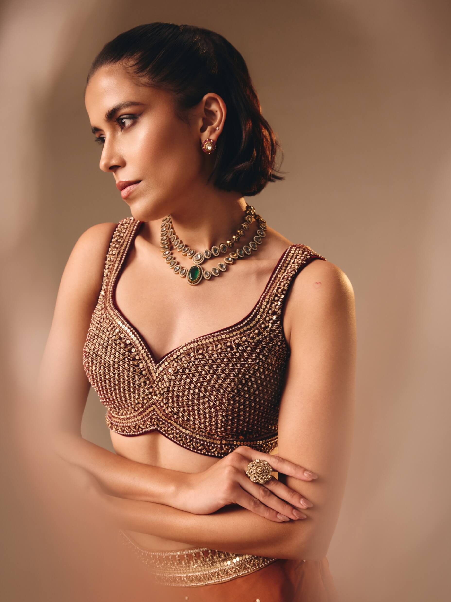 Earthy yet opulent, this rust brown satin organza lehenga is embellished with poth and sequin work, finished with an embroidered belt. Paired with a velvet blouse adorned in zardosi, sequins, and poth.