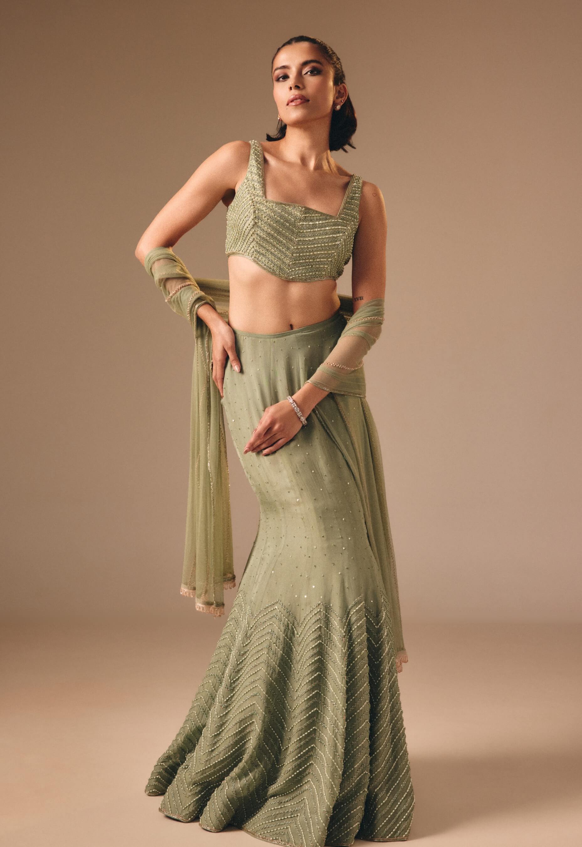 Sage green fishcut embellished lehenga set