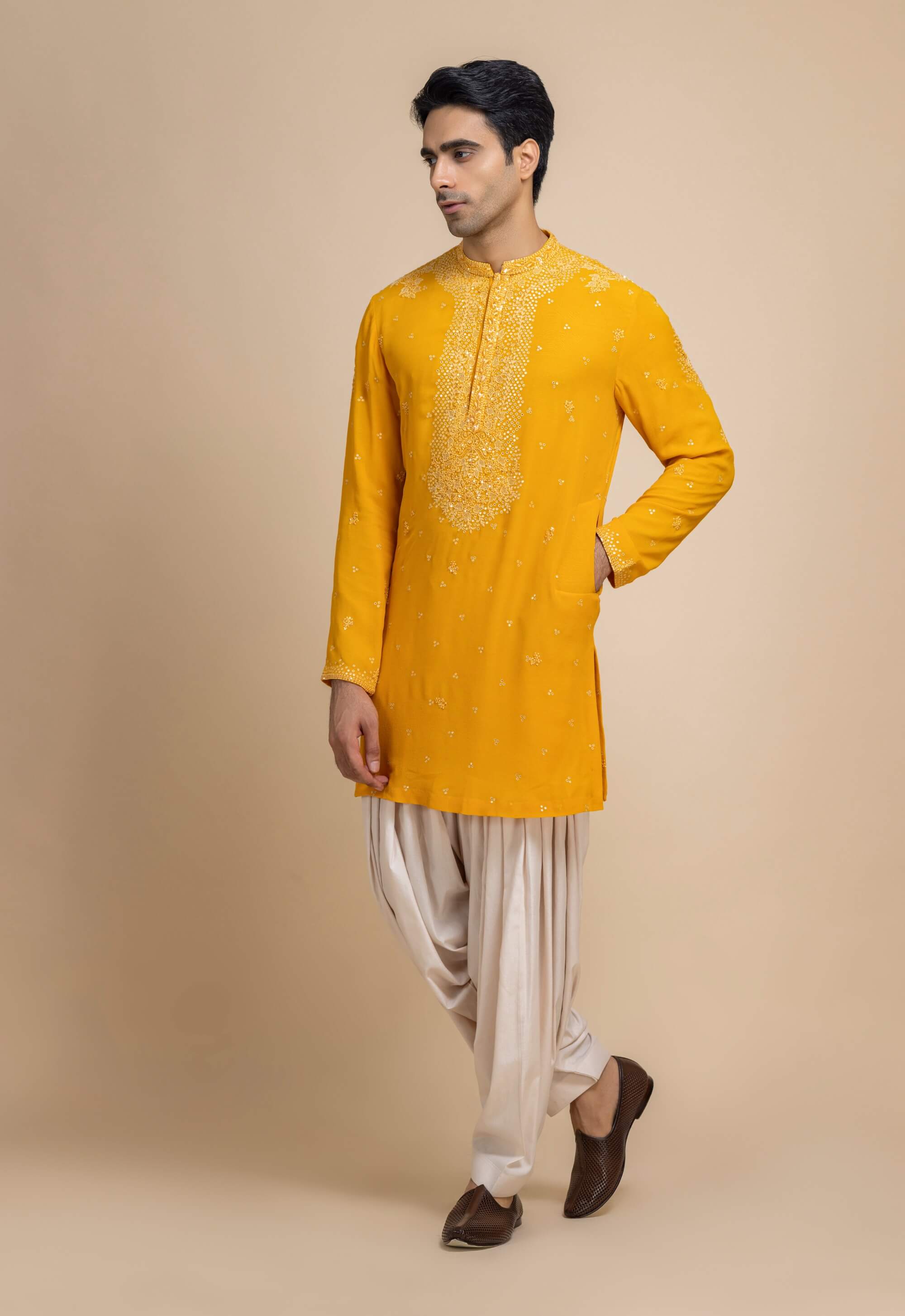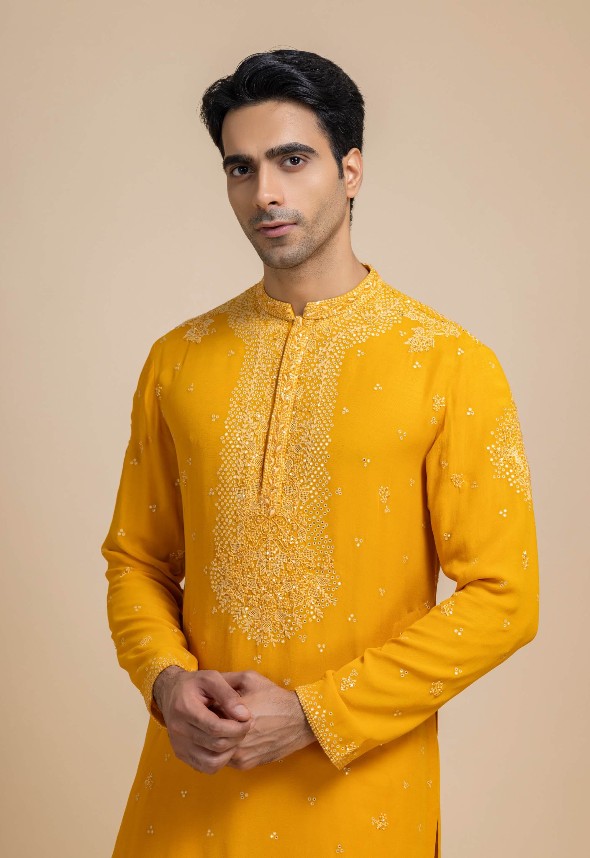 Bright and uplifting, this turmeric yellow kurta is crafted in breezy georgette with subtle tonal embroidery. The detailing adds texture while preserving its vibrant charm. Paired with a classic salwar, it feels effortlessly festive. Ideal for daytime celebrations, festive gatherings, and traditional ceremonies.