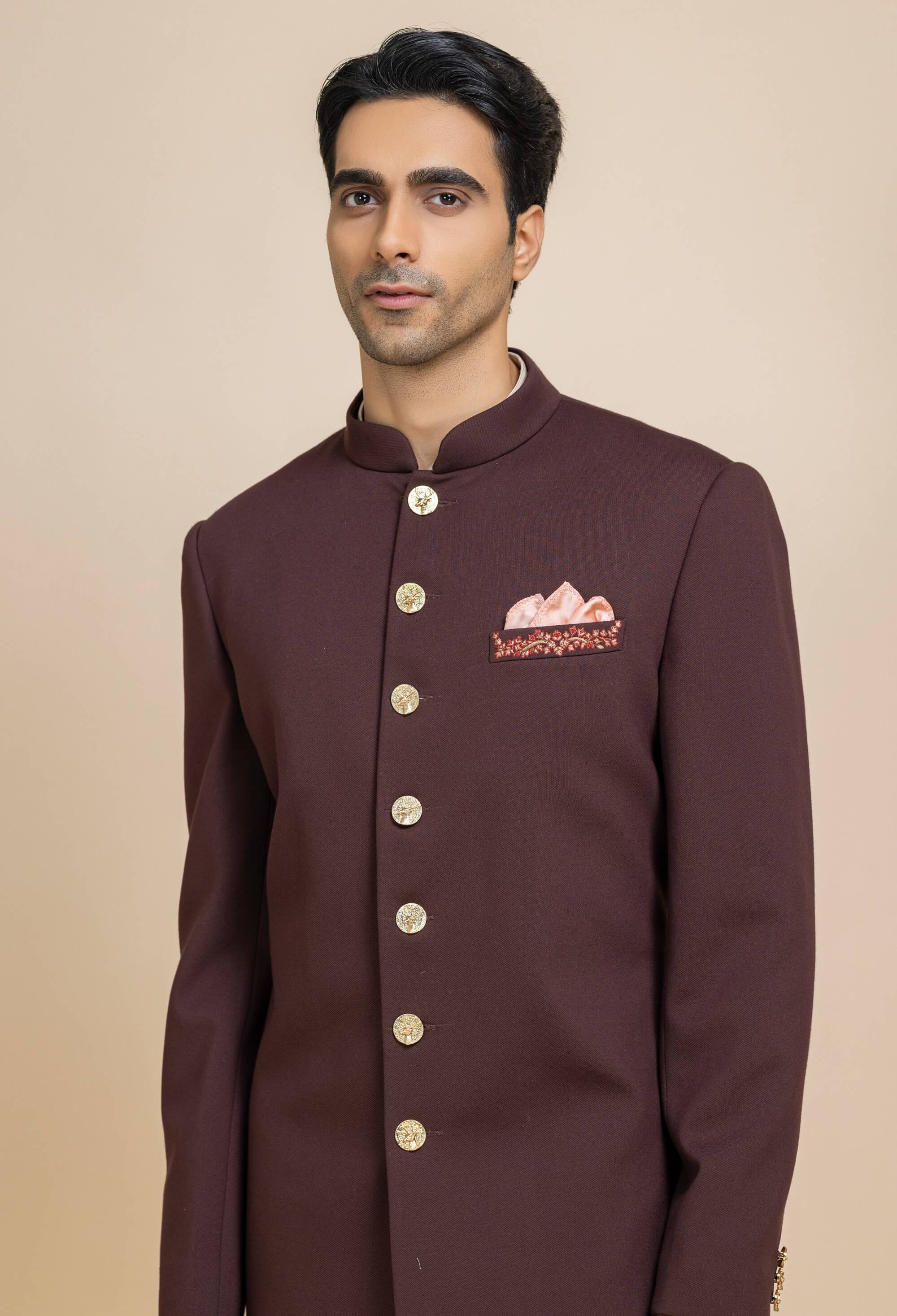 An expression of understated royalty, this deep maroon achkan is elevated with refined gold-toned buttons and a contrasting silk pocket square that adds quiet drama. The structured silhouette brings a regal presence while remaining effortlessly modern. Paired with classic beige trousers, it strikes a perfect balance between heritage and contemporary tailoring. Ideal for weddings, evening receptions, and formal celebrations where elegance is key.