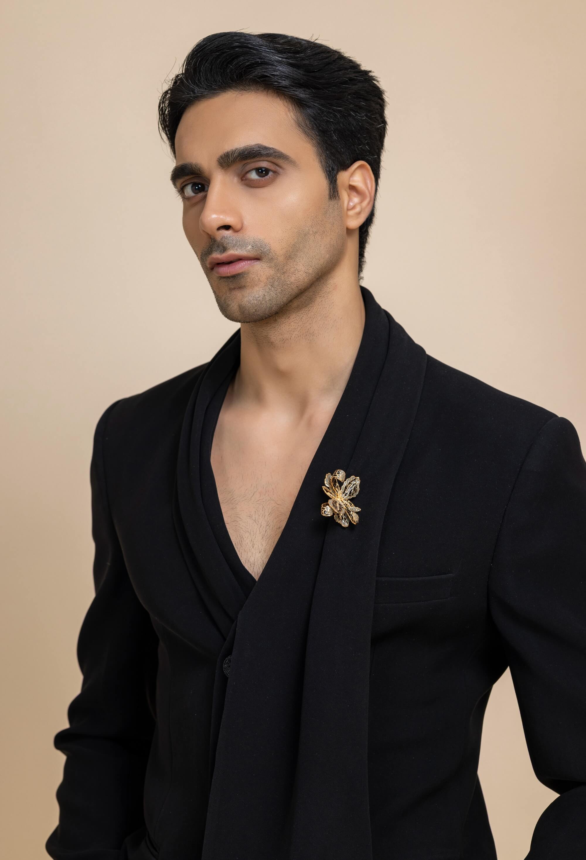 Minimal yet expressive, this black Japanese crepe tuxedo is elevated with a metallic butterfly brooch that adds modern artistry. The clean tailoring and fluid trousers enhance its timeless silhouette. Subtle details create a lasting impression. Perfect for cocktail evenings, formal events, and statement celebrations.