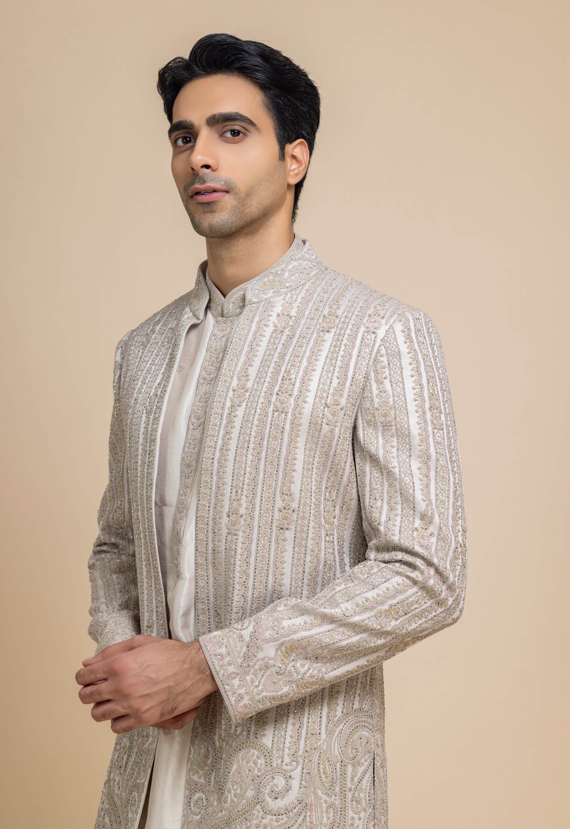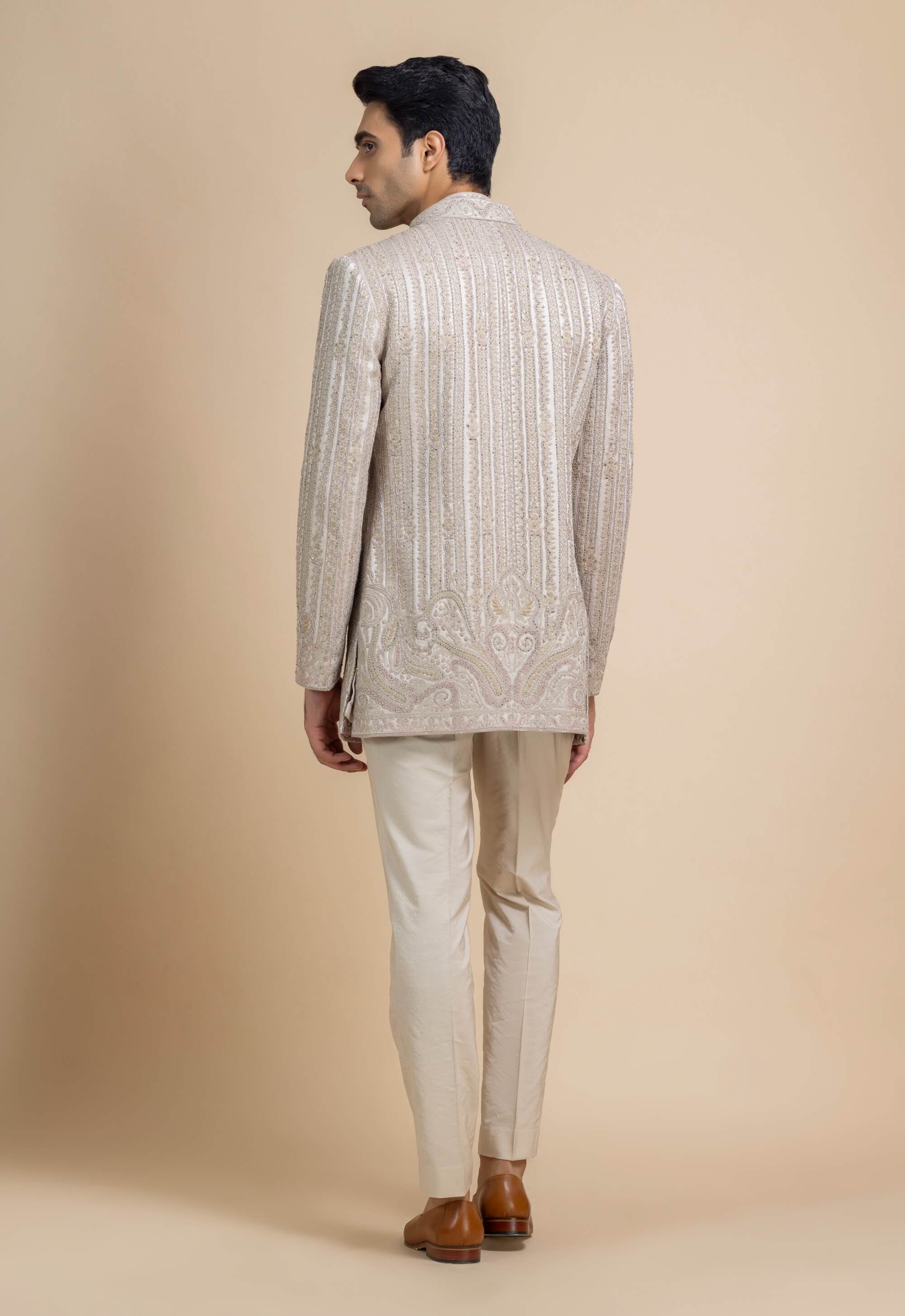Quietly luxurious, this silver ivory raw silk open jacket is embellished with subtle tonal embroidery. Layered over a dupion silk kurta and paired with flowing cotton silk trousers, the ensemble feels elegant and modern. Ideal for weddings, festive soirées, and evening celebrations.