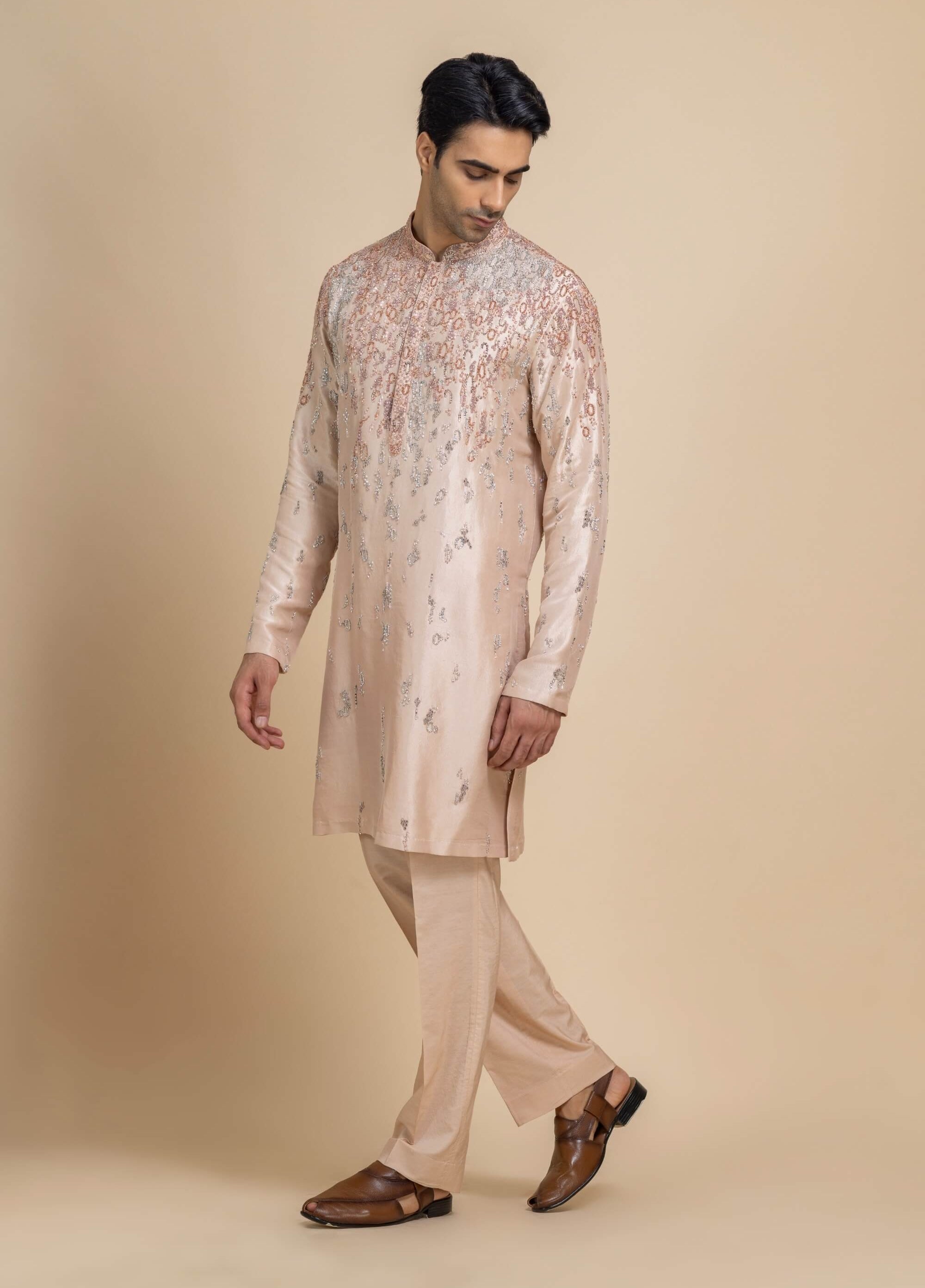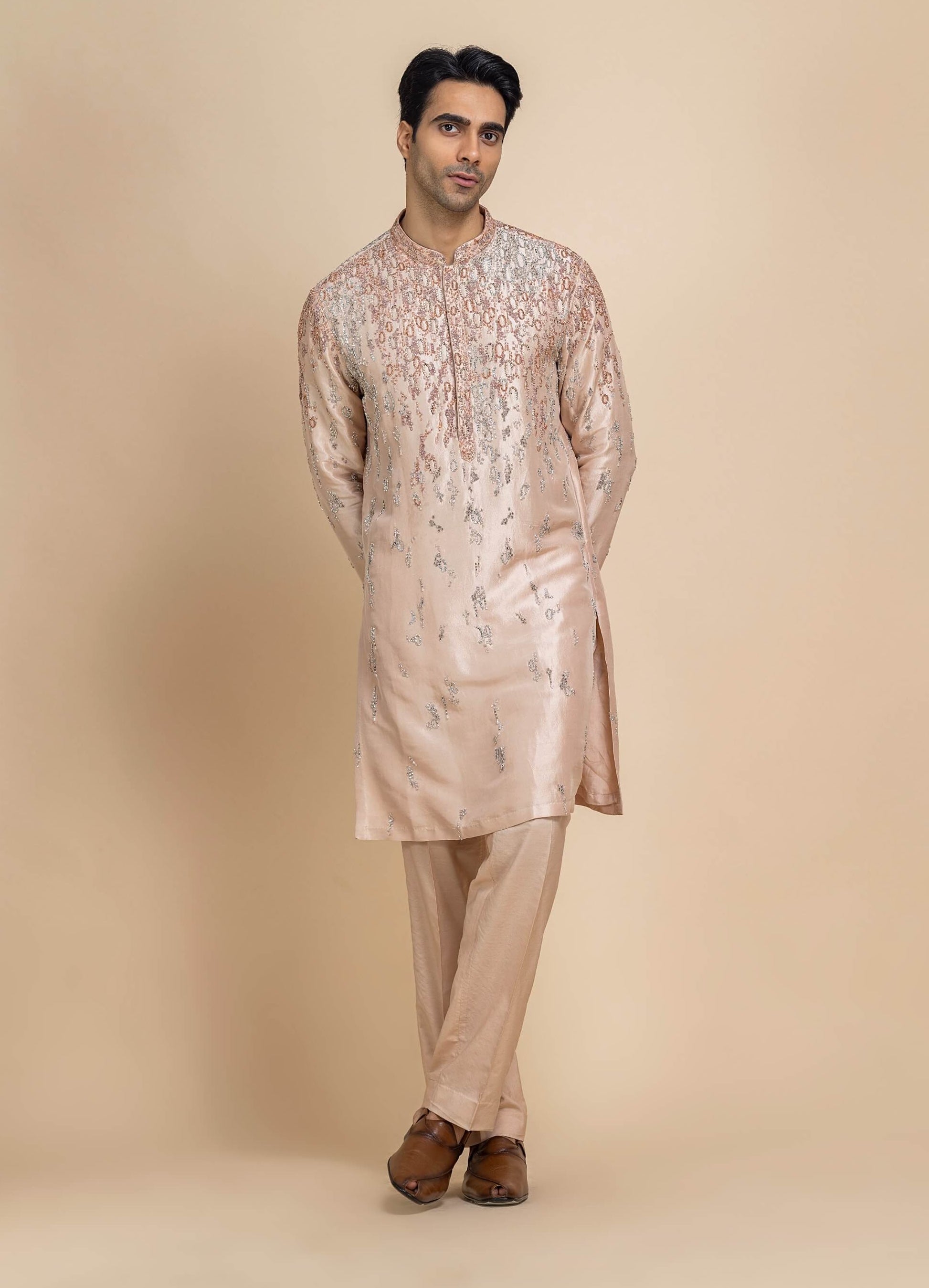 Soft sophistication defines this dusky rose silk kurta embellished with delicate silver and rose-gold embroidery. The subtle sheen adds depth while maintaining elegance. Paired with matching pants, it creates a refined festive look. Ideal for weddings, sangeets, and celebratory occasions.