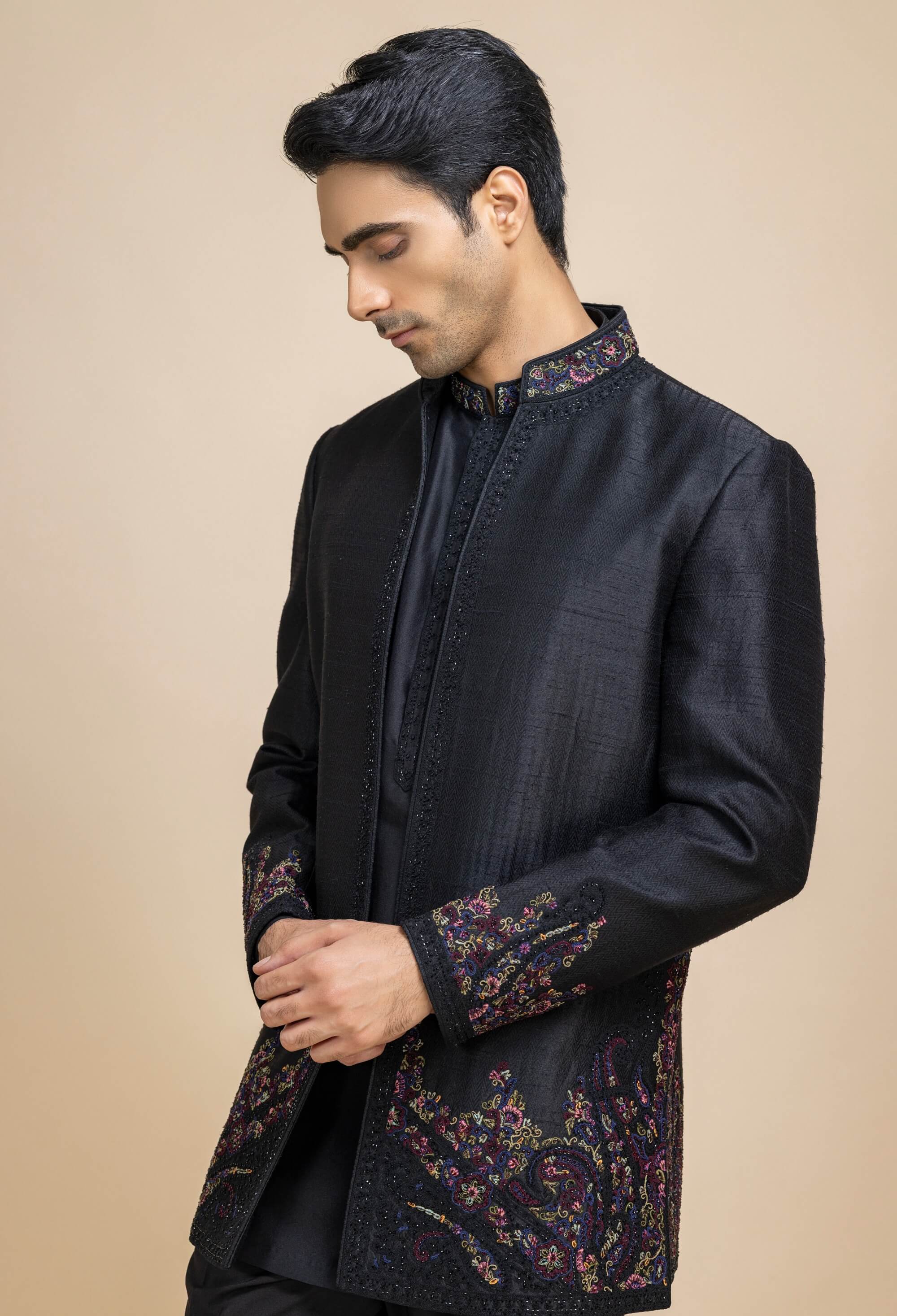 An exploration of texture and structure, this black raw silk open jacket commands attention with quiet confidence. Layered over a dupion silk shirt and paired with Japanese crepe trousers, the ensemble balances sheen and fluidity. The contrast of fabrics creates a refined focal point. Ideal for evening soirées, festive occasions, and sophisticated celebrations.