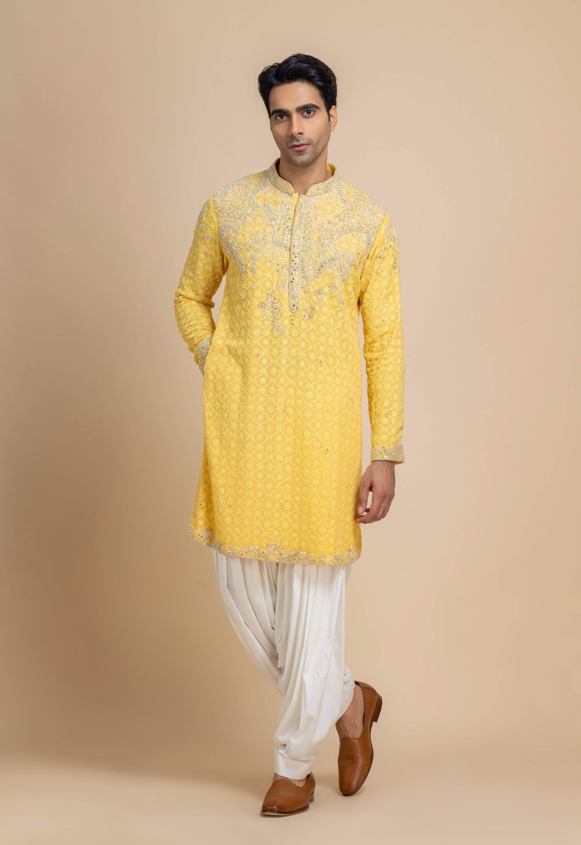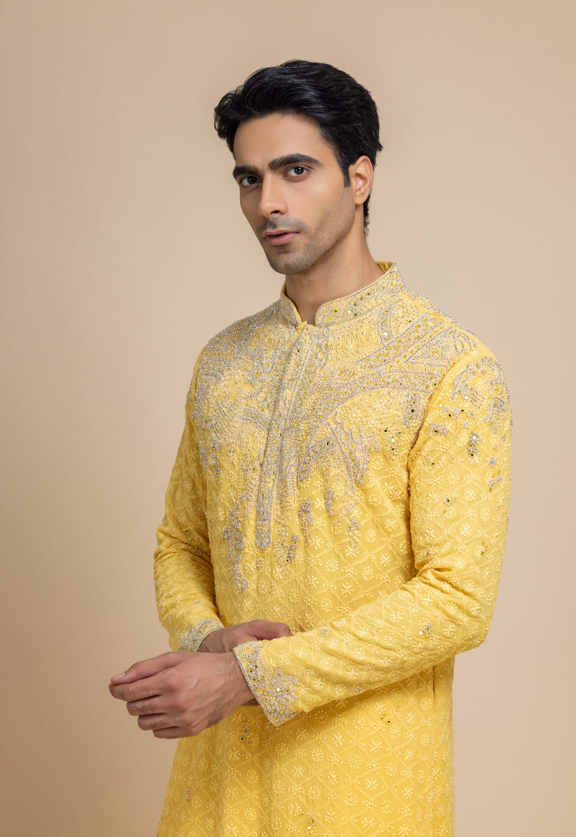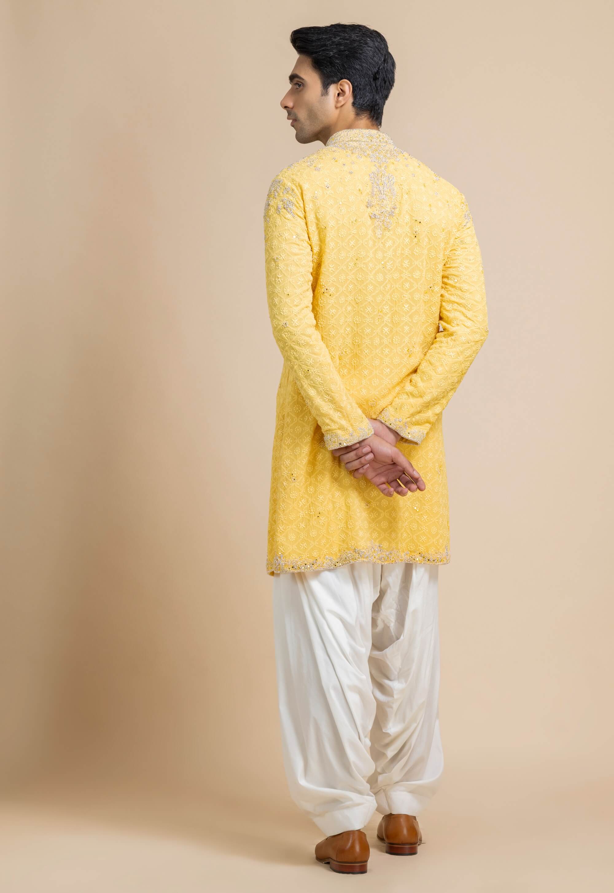 Vibrant and celebratory, this sunlit yellow kurta is enriched with intricate silver embroidery and handwork. Paired with an ivory salwar, it strikes the perfect festive balance. The radiant hue makes it instantly uplifting. Ideal for haldi ceremonies, weddings, and joyful celebrations.