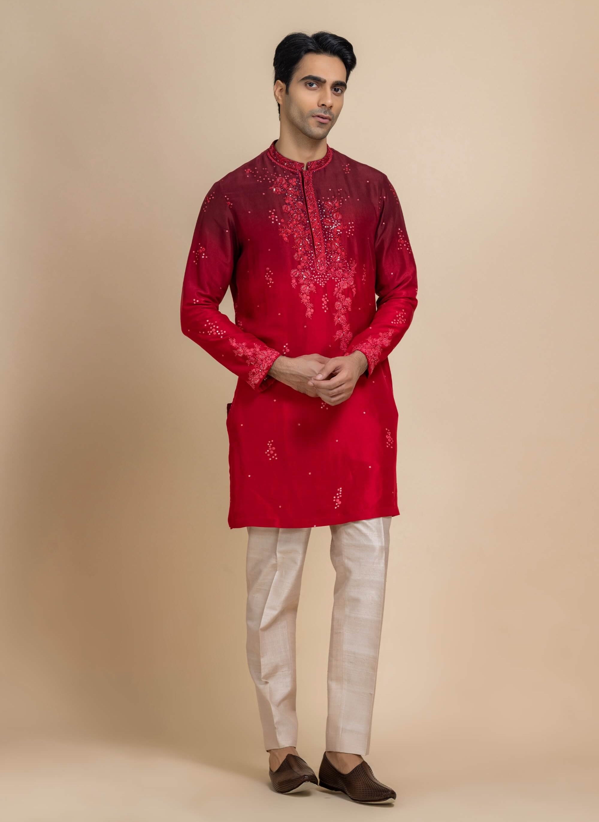 A striking expression of modern tradition, this deep red ombré kurta fades seamlessly into lighter hues. Intricate tonal hand embroidery radiates from the neckline and sleeves, adding depth and richness. Paired with ivory straight trousers, it balances boldness with sophistication. Ideal for weddings, receptions, and festive occasions.