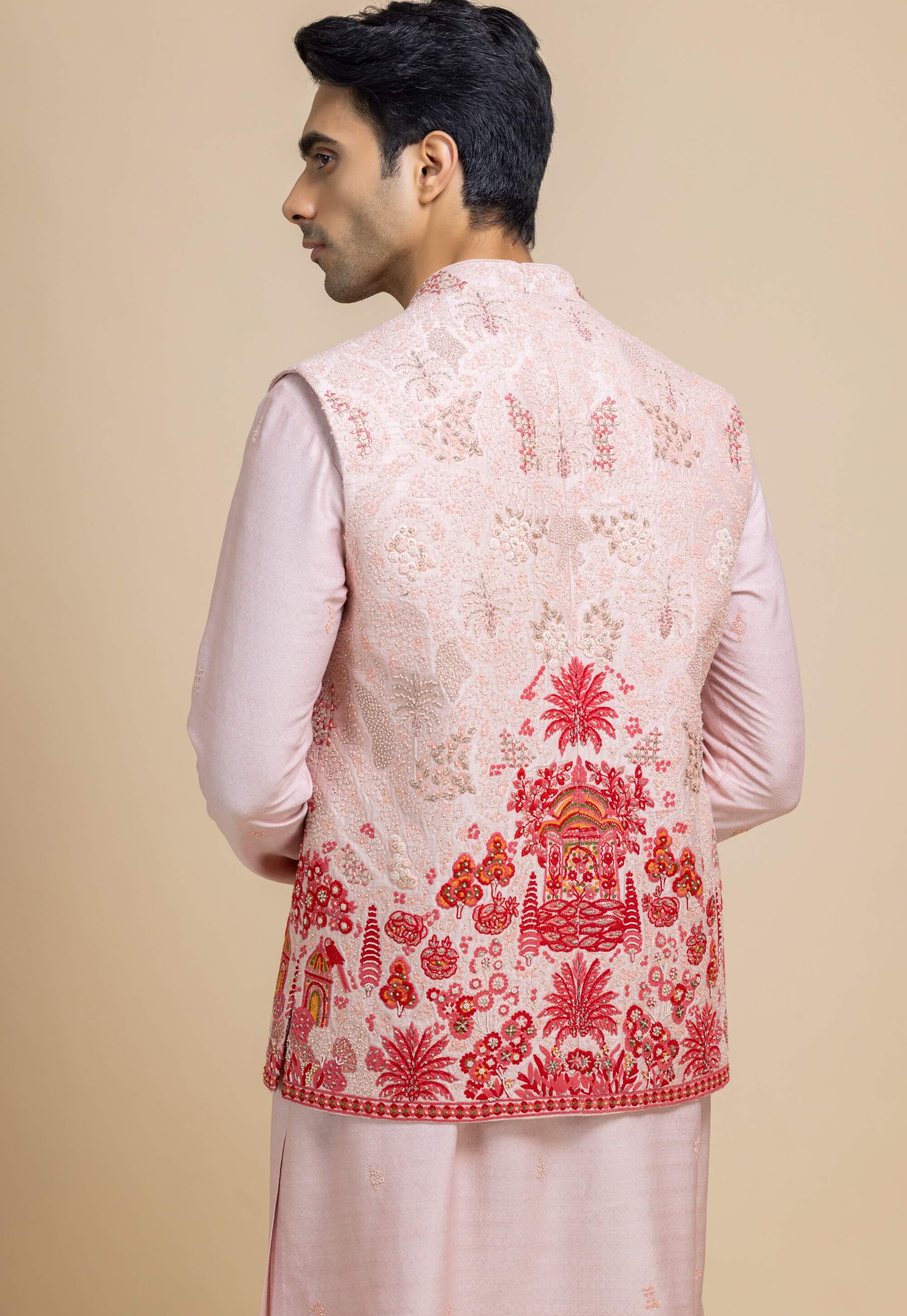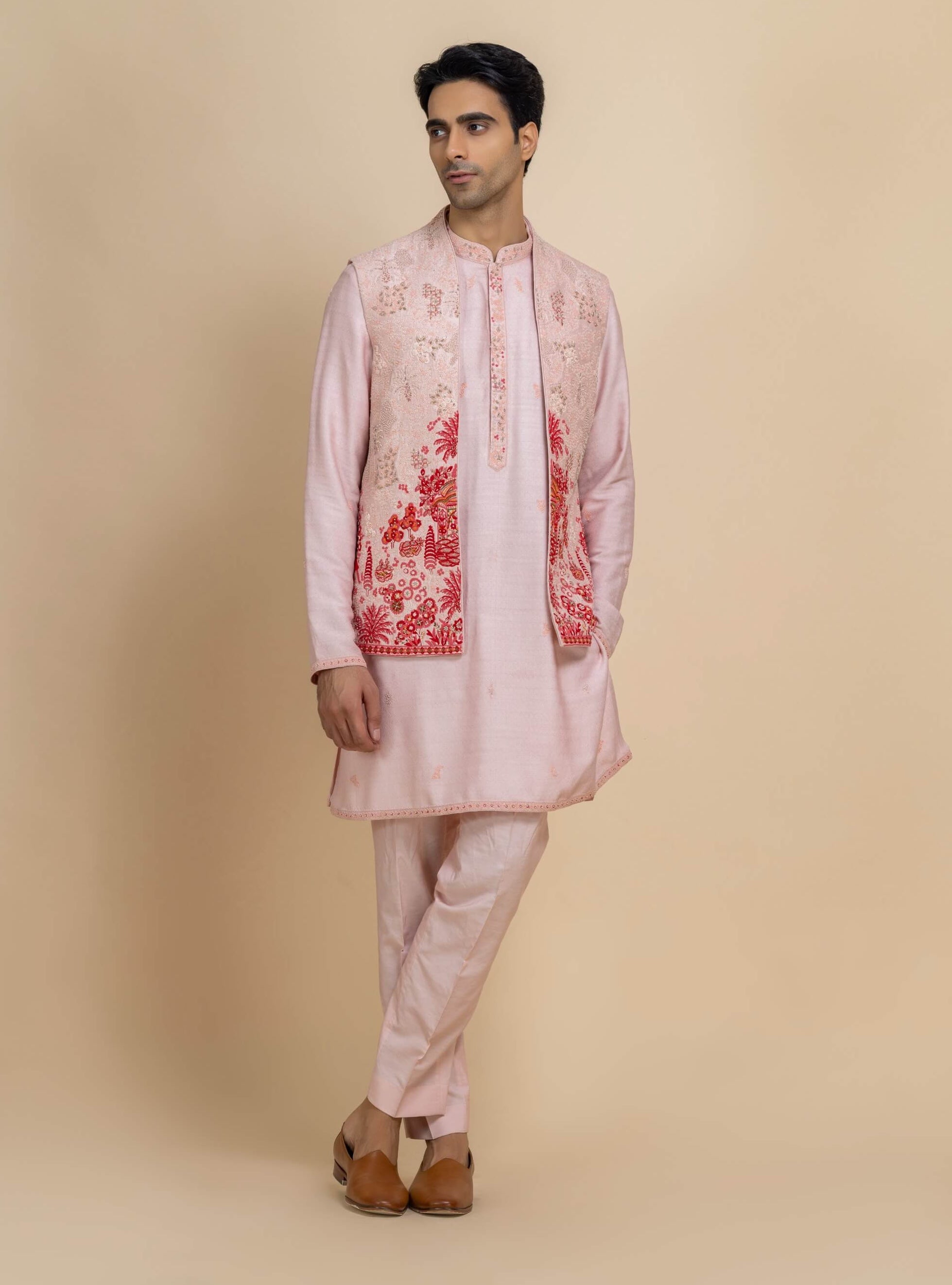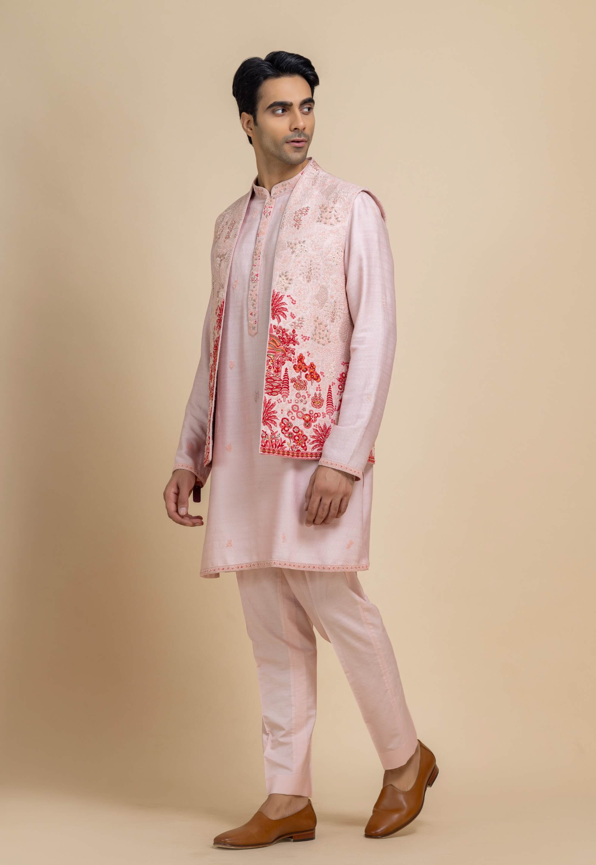 Softly regal, this blush pink Bundi and kurta pant set features a raw silk embroidered jacket layered over a dupion silk kurta. Intricate hand embroidery adds artisanal charm and texture. Paired with cotton silk trousers, it’s perfect for weddings, festive celebrations, and evening soirées.