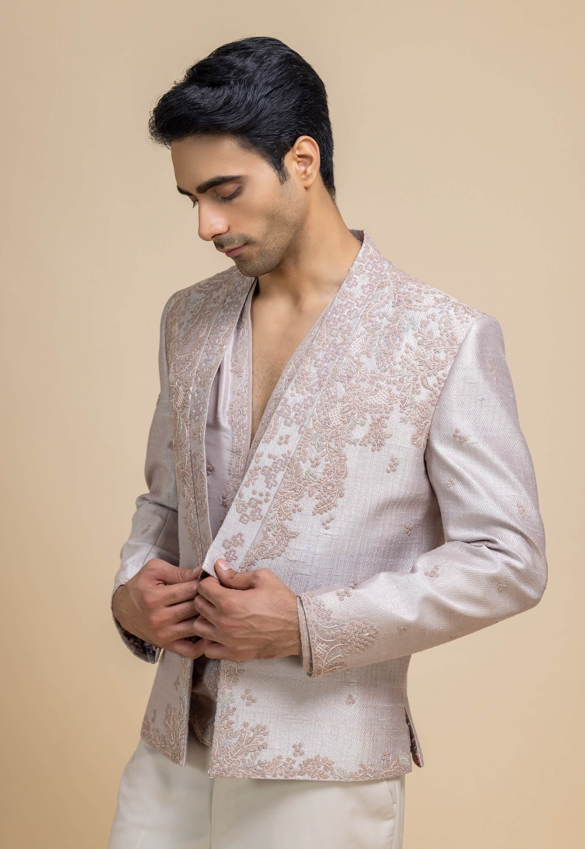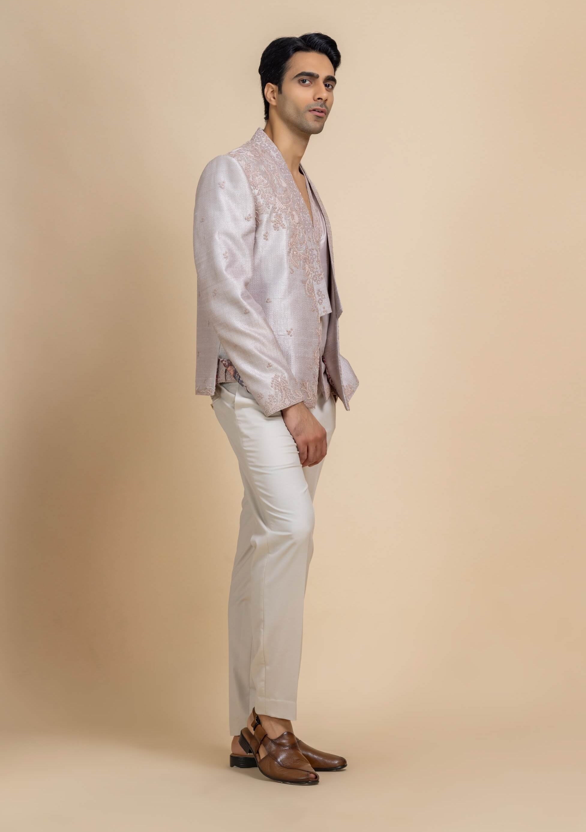 Warm elegance defines this rosy brown ensemble featuring a raw silk jacket with delicate tonal embroidery. Paired with a V-neck shirt and fluid Japanese silk trousers, the silhouette feels contemporary and relaxed. Ideal for festive gatherings, elegant soirées, and evening occasions.