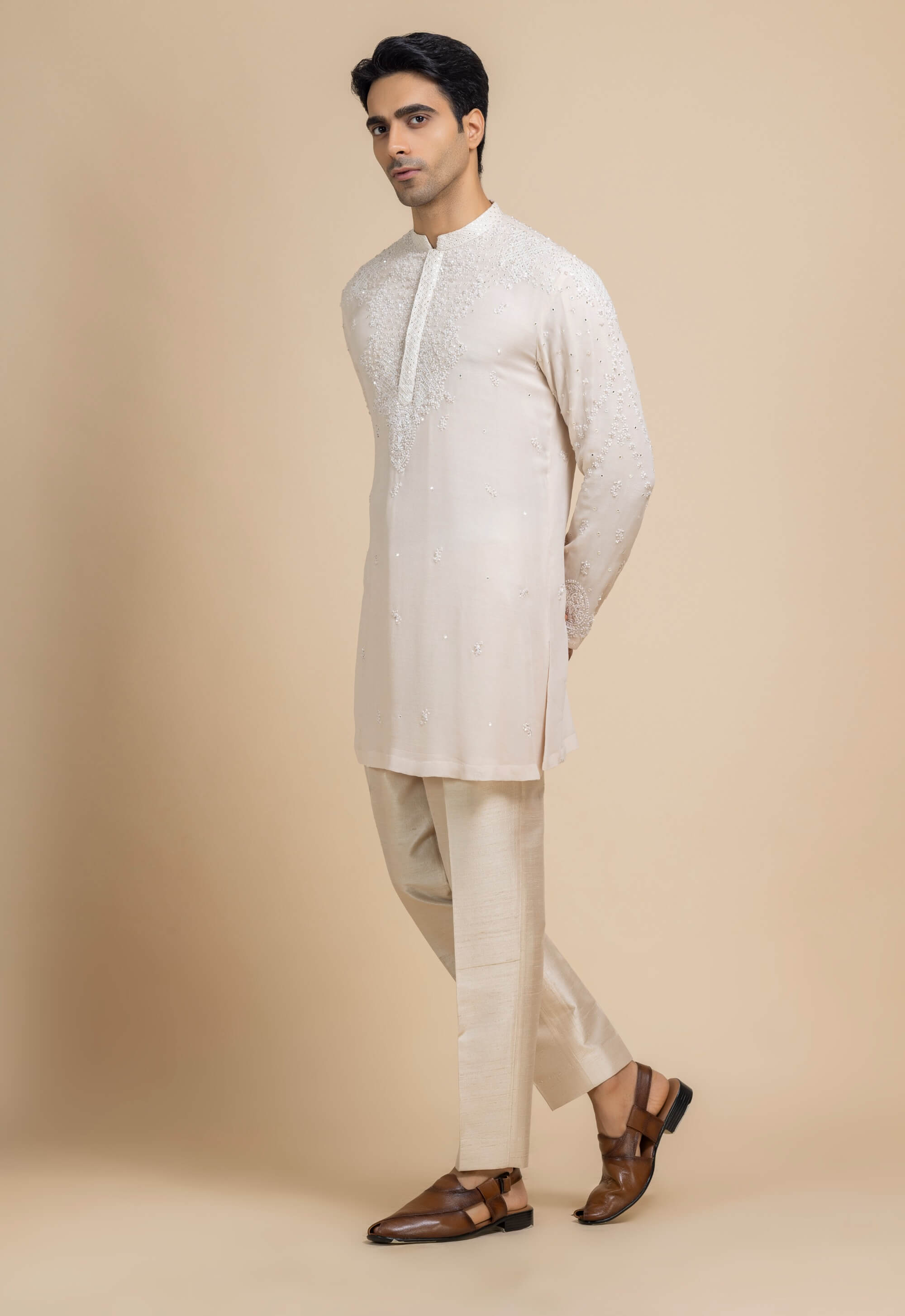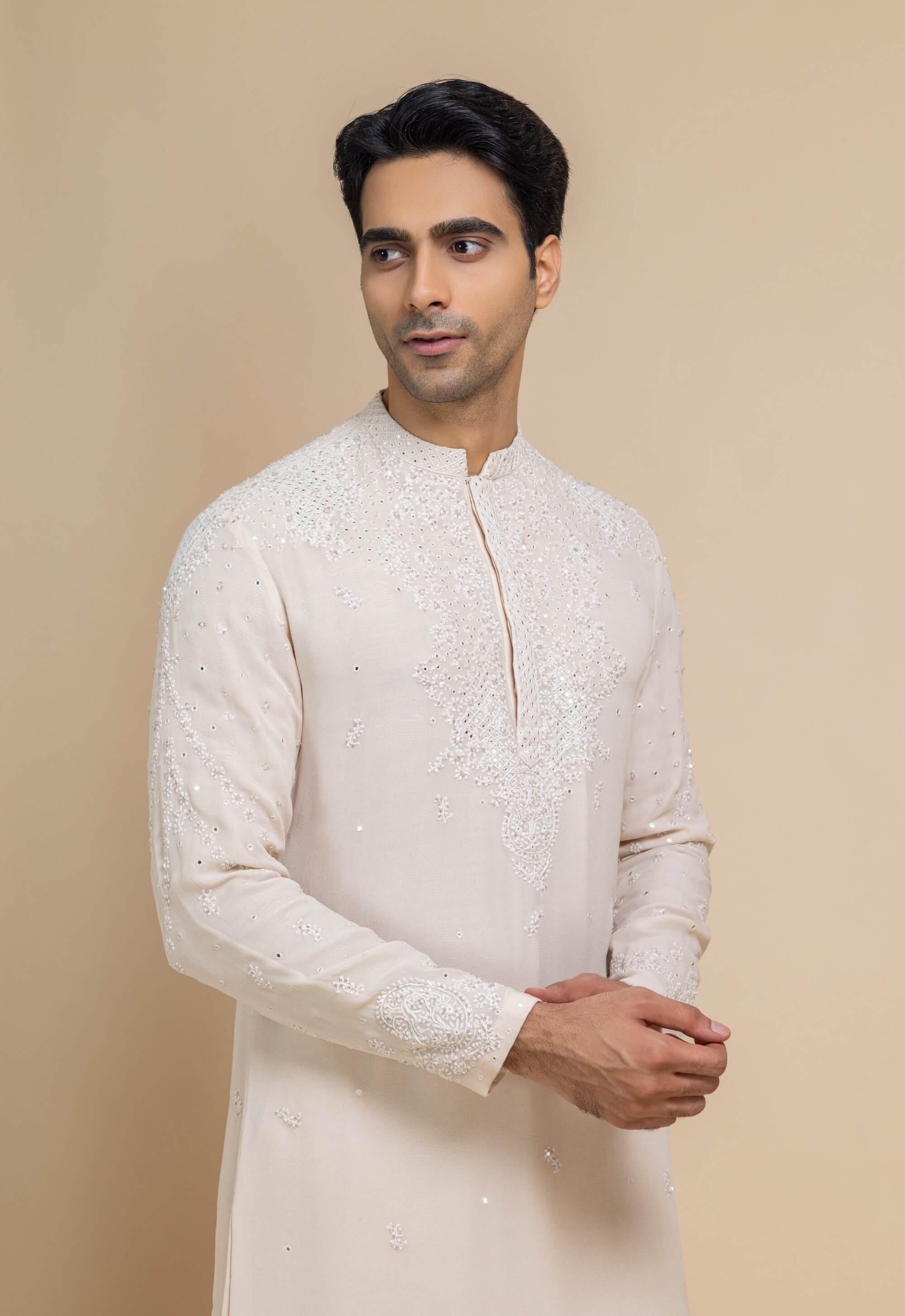 Timeless and versatile, this beige embroidered kurta is crafted in fine georgette with delicate threadwork on the yoke and sleeves. Paired with matching straight-cut trousers, it delivers refined simplicity. The neutral palette enhances its elegance. Perfect for festive and formal occasions.