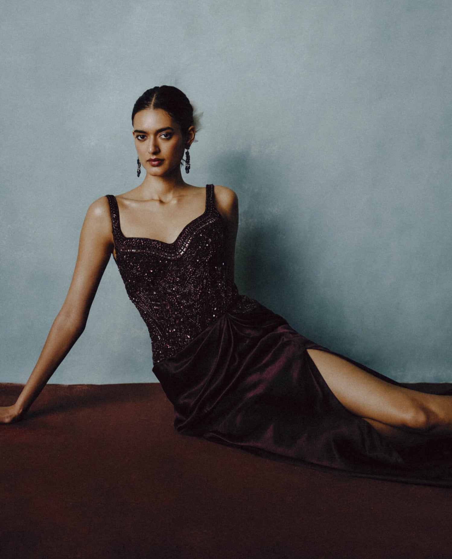 Understated yet bold, the luna noir beaded slit gown channels contemporary glamour. Crafted in midnight satin, it features an embellished asymmetric bodice with delicate straps. Sculpted draping at the waist enhances the silhouette, while a high slit adds drama. Designed for cocktail nights, receptions, and modern evening events.
