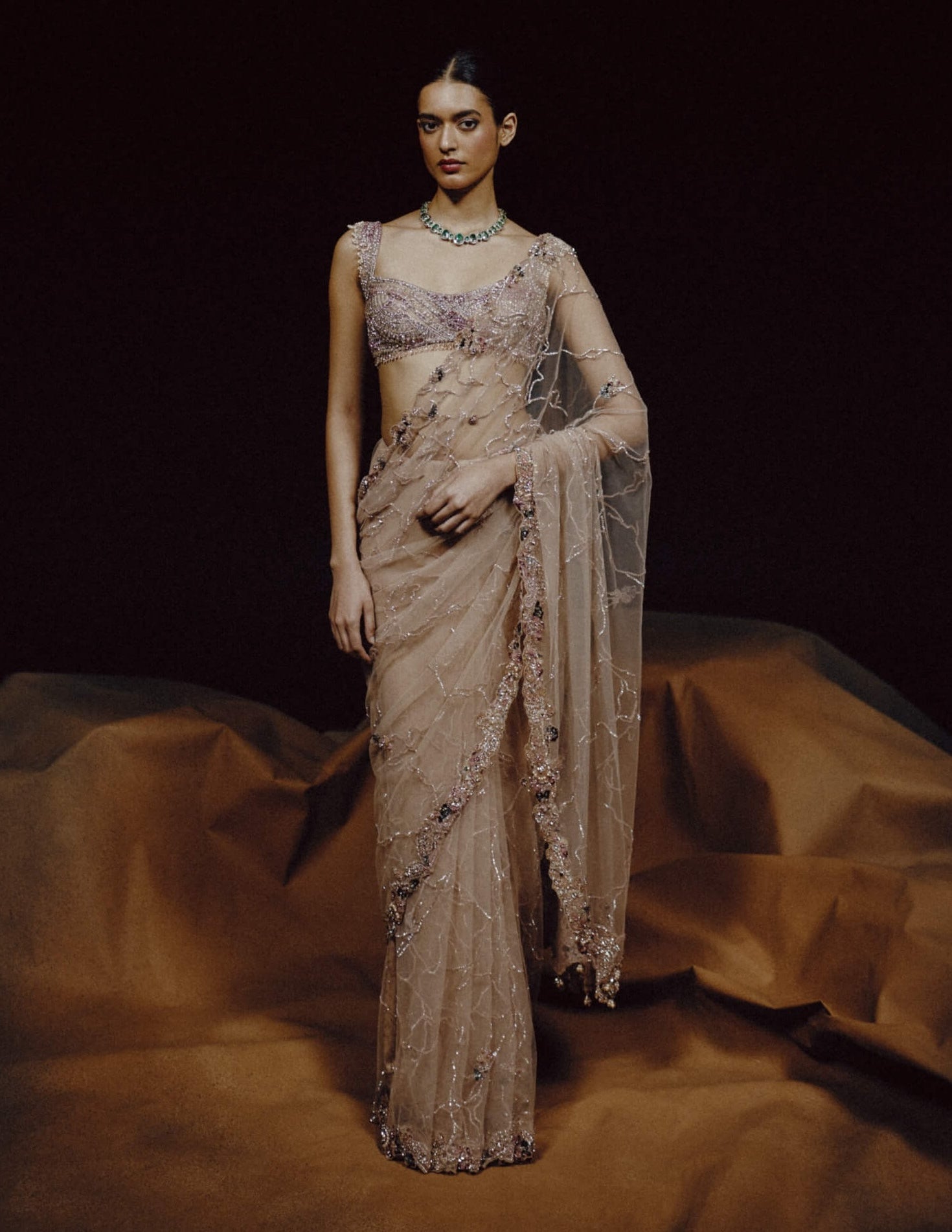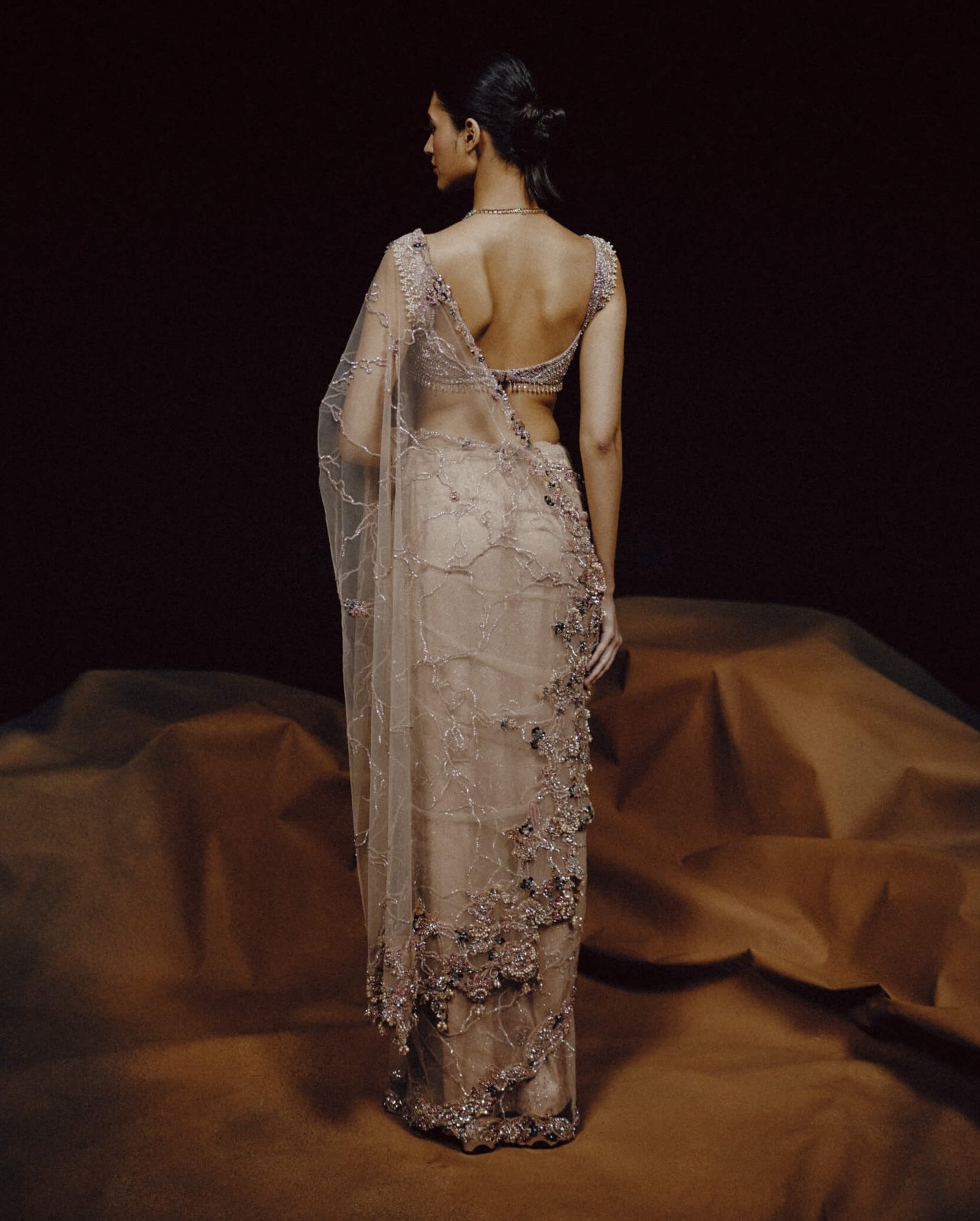 Delicate yet striking, the aura blush crystal sari redefines understated glamour. Crafted in a sheer nude base, it features hand-embroidered sequin vines that shimmer softly with movement. Paired with a sculpted, embellished blouse, the silhouette feels modern and refined. Lightweight and elegant, this couture sari is perfect for evening soirées, intimate celebrations, and contemporary festive wear.