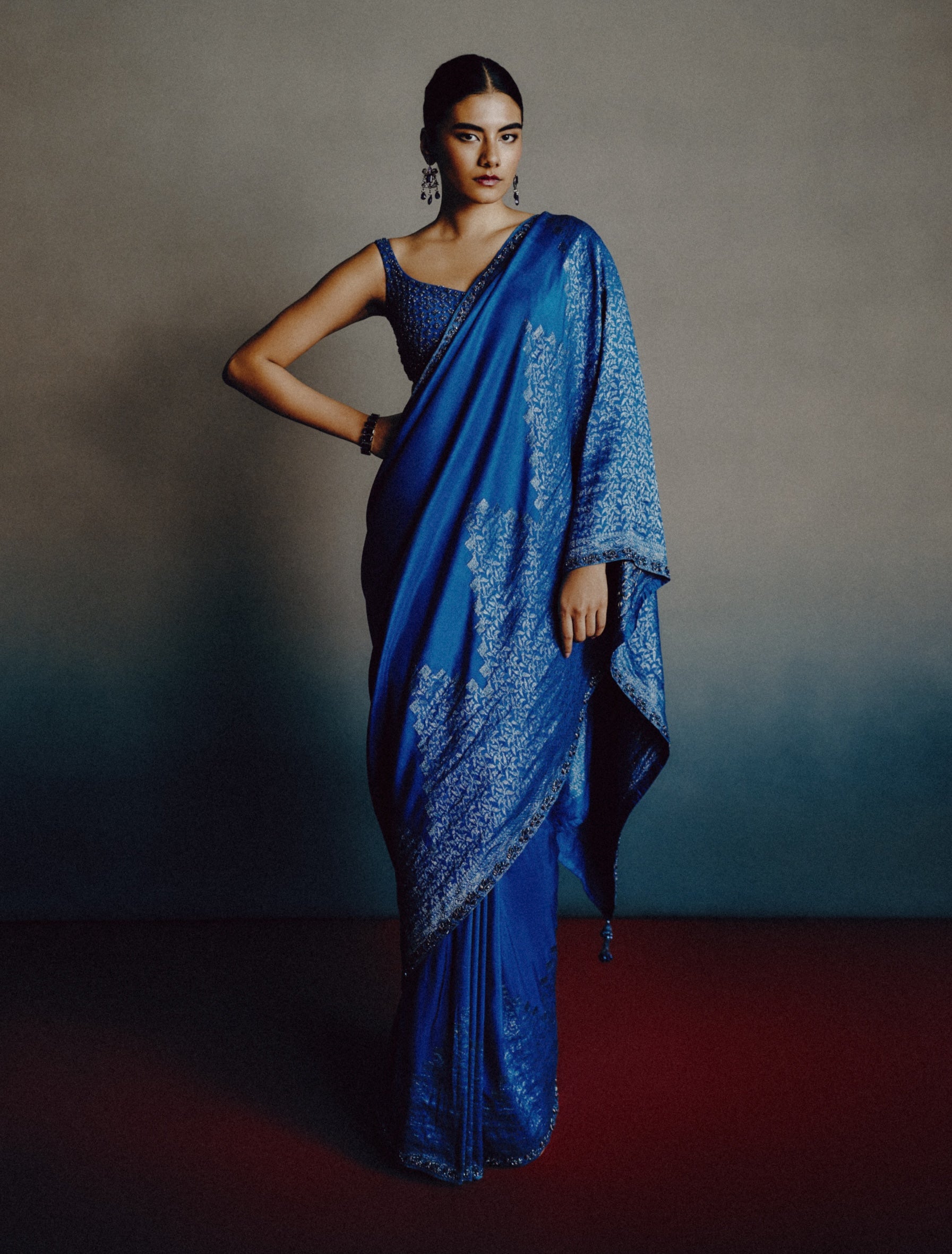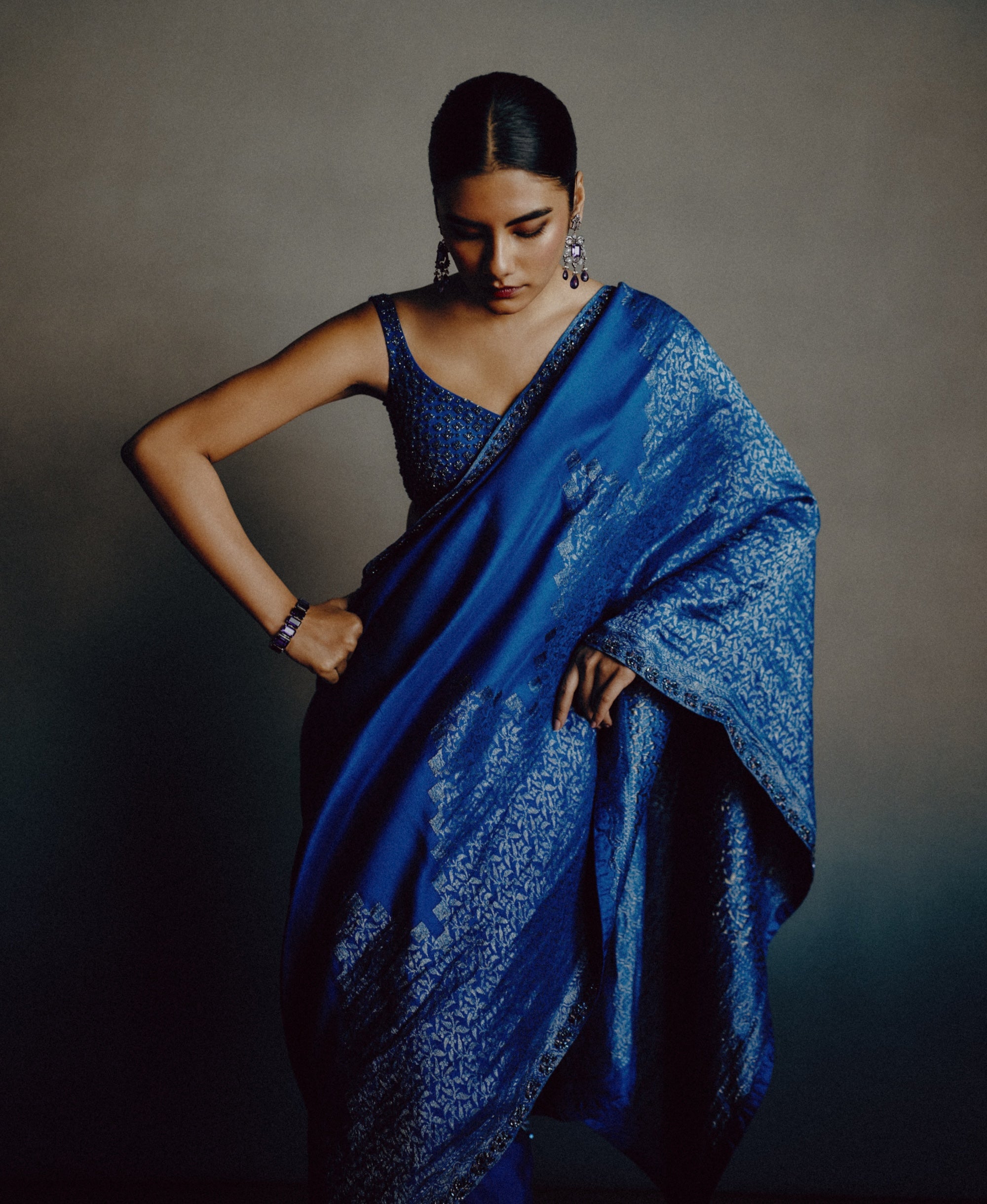 A luminous expression of colour and craft, this turquoise-blue Banarasi sari showcases cascading silver zari motifs across its fluid, lustrous silk. Paired with a modern embellished blouse, it’s perfect for soirées, festive weddings, and elevated evening dressing.