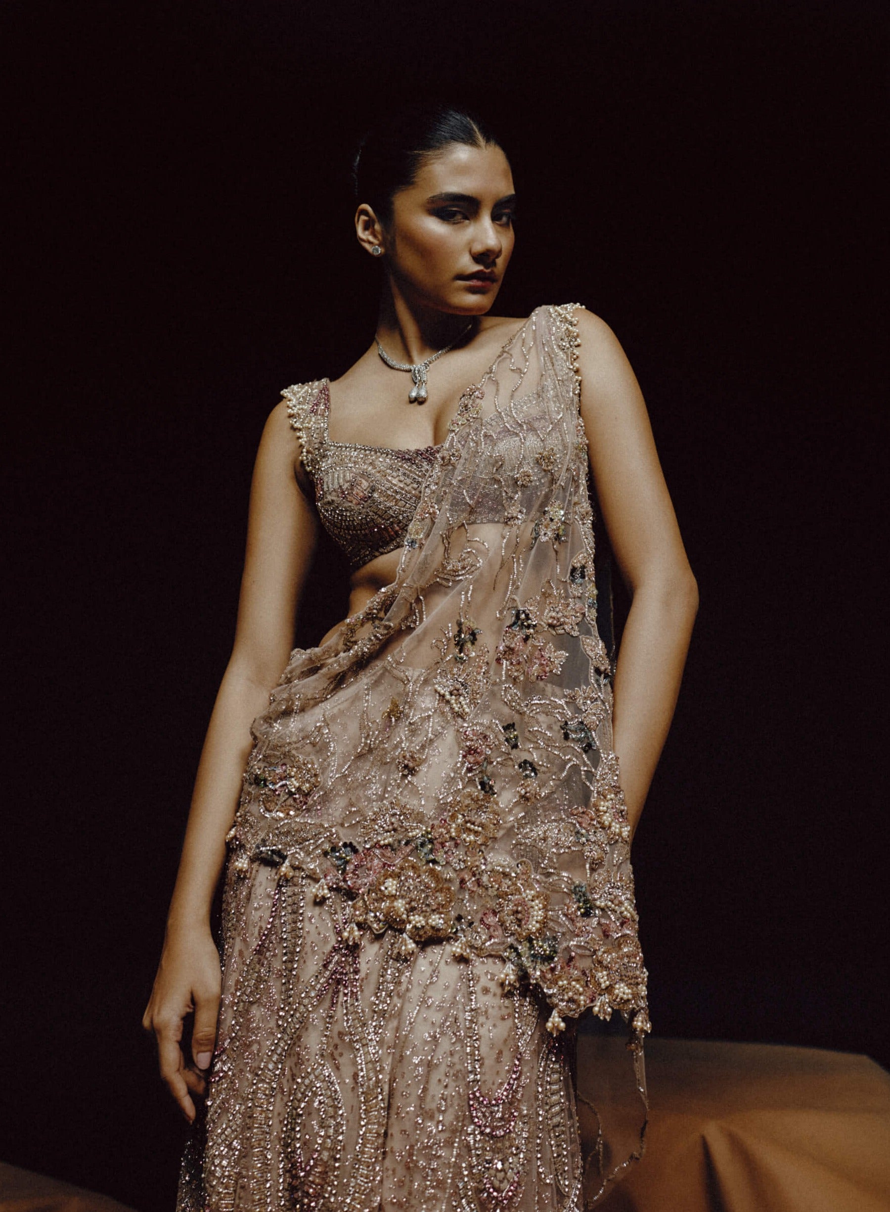 A vision of sculpted couture, the dewdrop mirage drape sari blends fluid draping with dramatic structure. Hand-embroidered with crystals, sequins, and 3d floral motifs, the sheer pallu flows into an extended trail for high-impact elegance. The silhouette is bold yet refined, designed to make an unforgettable entrance. Ideal for red-carpet events, reception nights, and fashion-forward bridal celebrations.