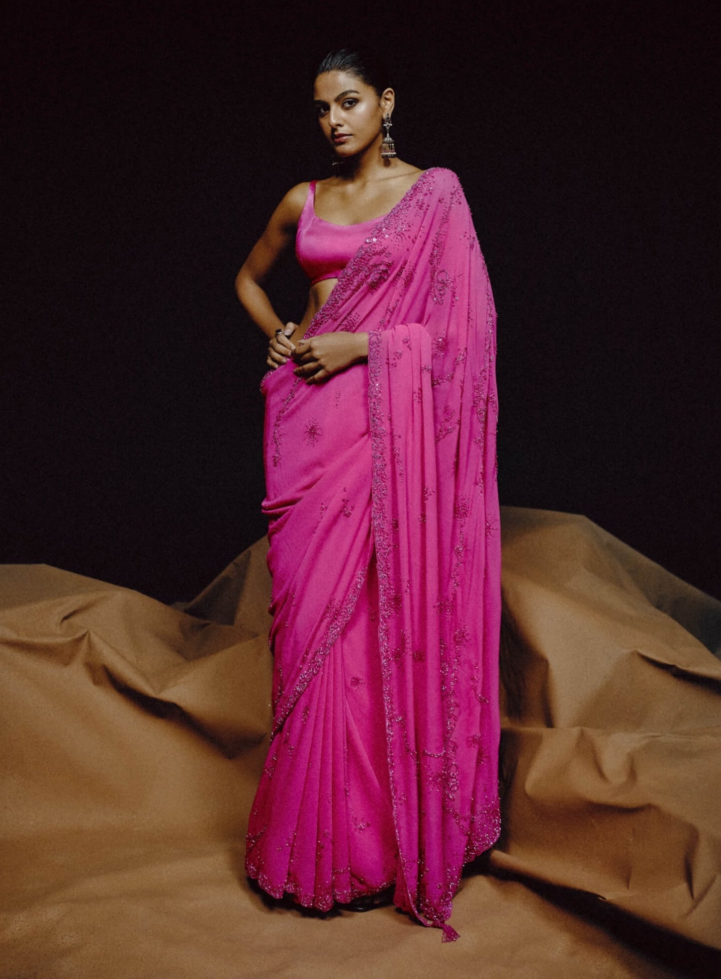 A bold expression of modern couture, the fuchsia éclat sari commands attention with its vibrant hue and refined craftsmanship. Crafted in fluid georgette, it is adorned with intricate hand-embroidered motifs that shimmer with quiet luxury. The lightweight drape offers effortless movement, balanced by a minimalist satin blouse for a clean, contemporary finish. An embroidered border adds a touch of timeless artistry. Perfect for cocktail soirées, festive evenings, and statement wedding functions where colour meets elegance.