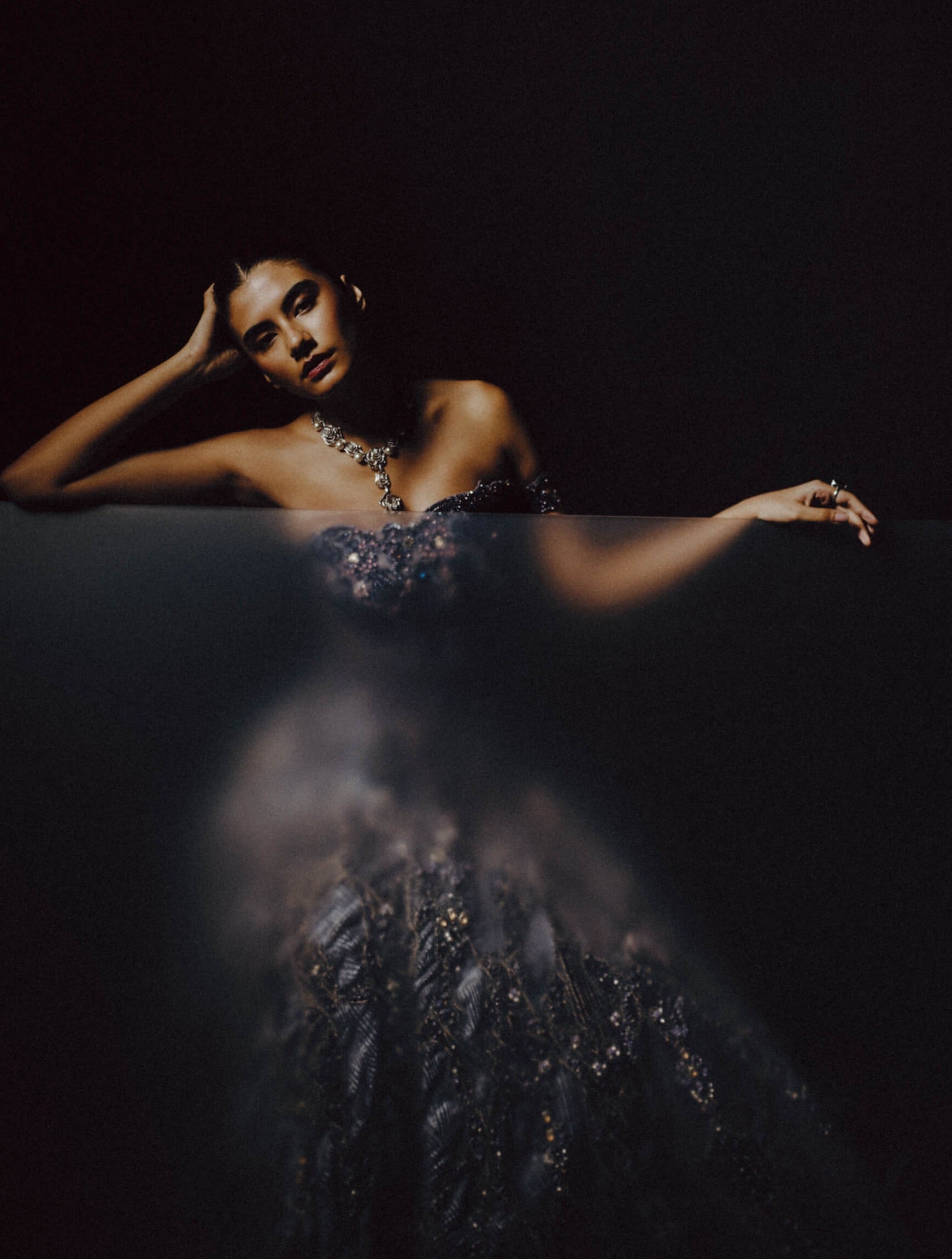 Dramatic couture unfolds in the nocturne silverdust ball gown, crafted for grand entrances. The charcoal-silver silhouette features a sculpted asymmetrical bodice richly embellished with crystals and sequins. A voluminous skirt flows into a dramatic flare, accented with delicate feather detailing. Designed for statement evenings, luxury galas, and red-carpet grandeur.