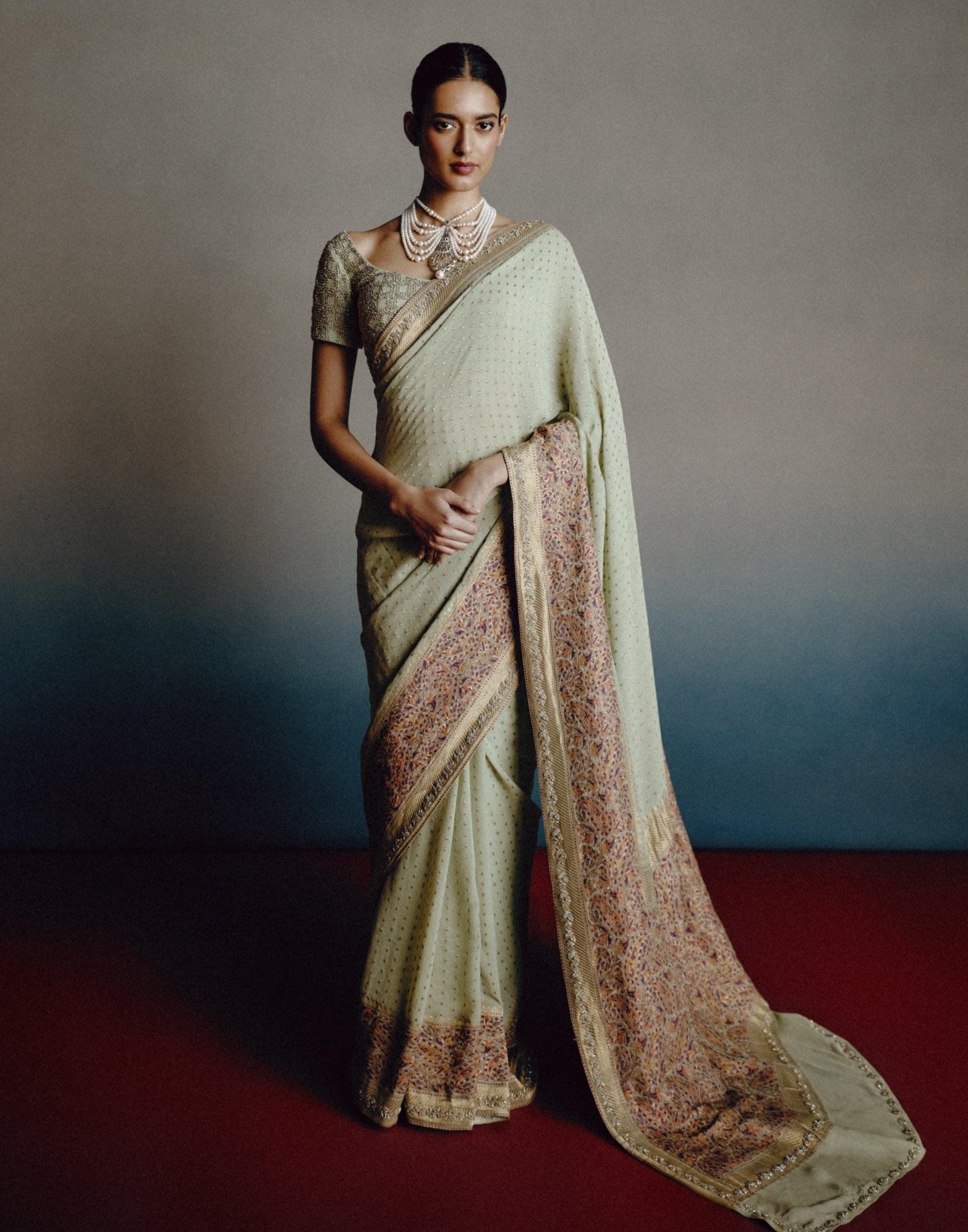 A soft, weightless expression of elegance, this georgette sari features an intricately woven resham border that frames its fluid drape with finesse. Perfect for soirées, intimate gatherings, and refined festive moments, it brings modern ease to a timeless silhouette.