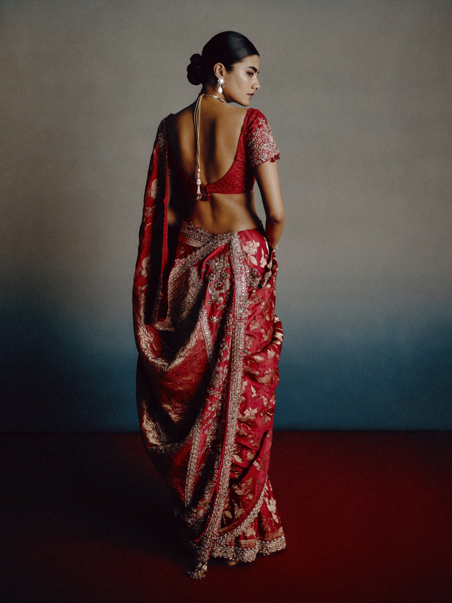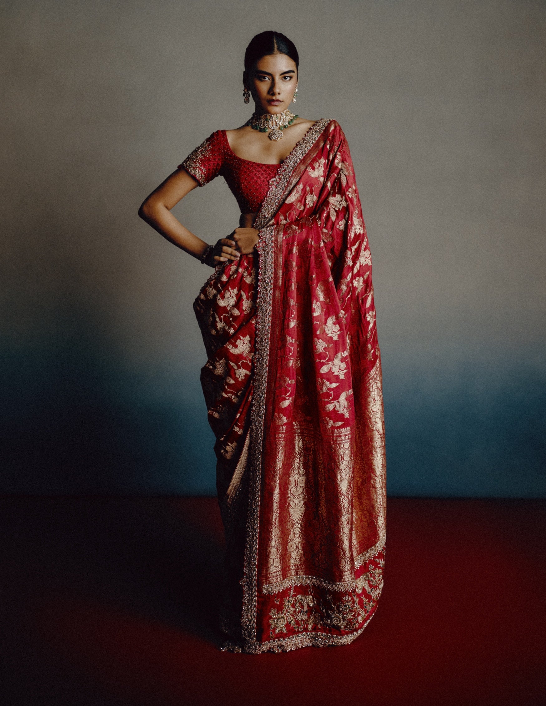 Roselle banarasi blood red sari set