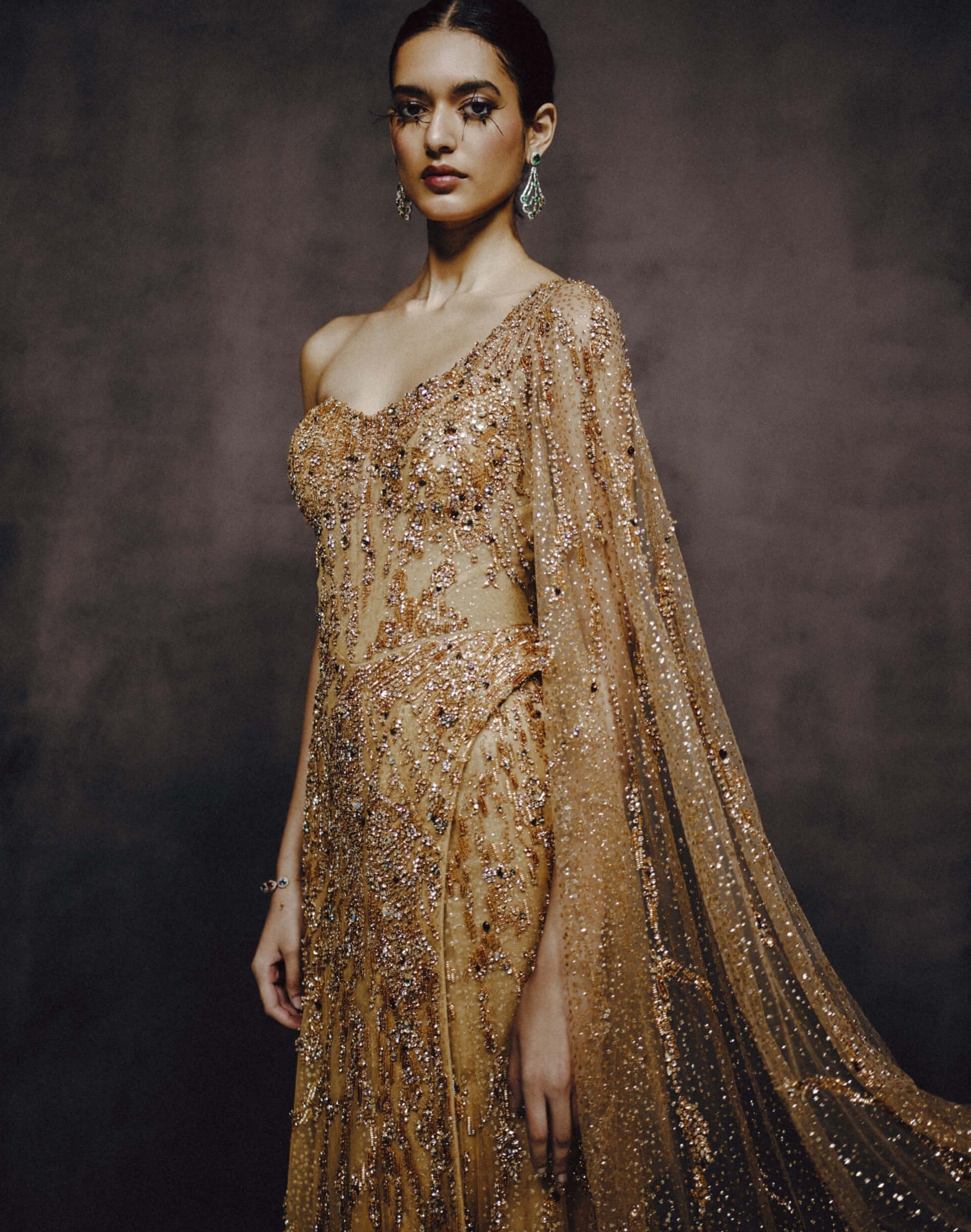 Radiating modern elegance, the solara ember gown is a statement in golden couture. The one-shoulder silhouette is richly hand-embroidered with sequins, crystals, and textured threadwork. A sheer embellished cape sleeve adds fluid drama and movement. Ideal for receptions, cocktail soirées, and contemporary bridal celebrations that call for standout style.