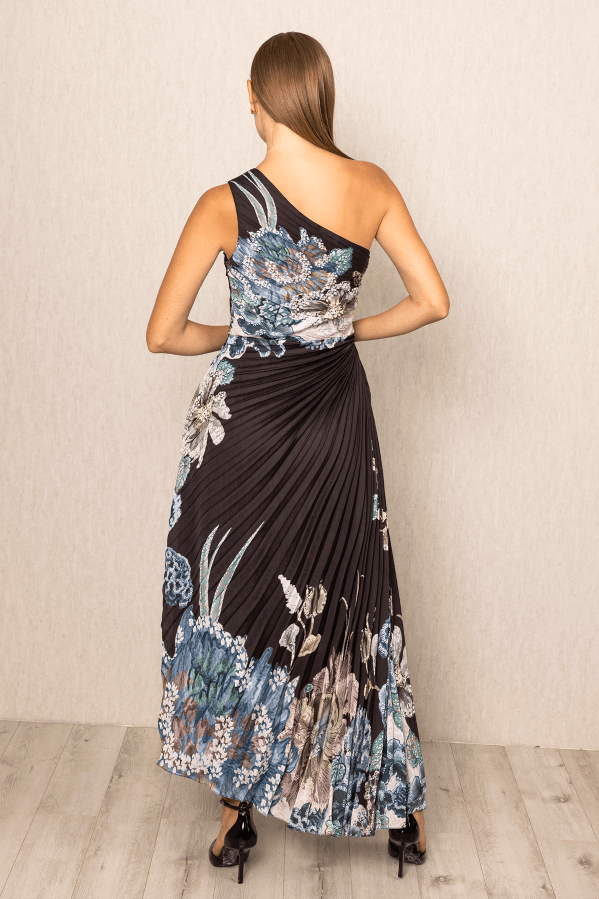 A dramatic yet refined silhouette, the amelia asymmetric pleated dress arrives in the brand’s black blooms print. Crafted with a one-shoulder cut, the bodice flows into a sharply sunray-pleated skirt for graceful movement. Muted multicolour florals enrich the deep black base with artistic depth. A versatile piece designed to transition seamlessly from daytime occasions to evening elegance.