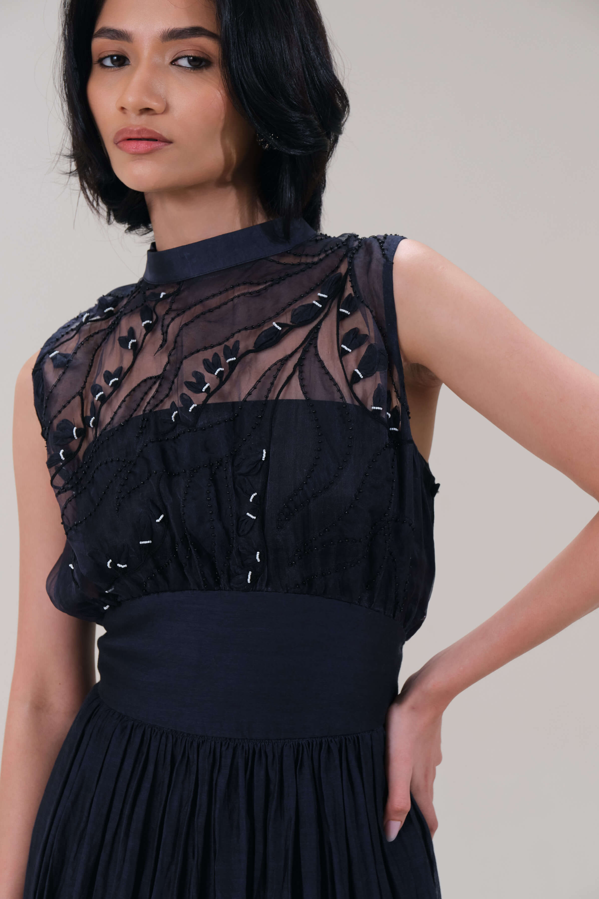 Ethereal and captivating, this organza dress features a beautifully embroidered sheer bodice with soft leaf motifs, balanced by a high neckline and defined waistband. The long, flowing skirt moves weightlessly, creating a graceful silhouette ideal for elegant evenings and festive gatherings.