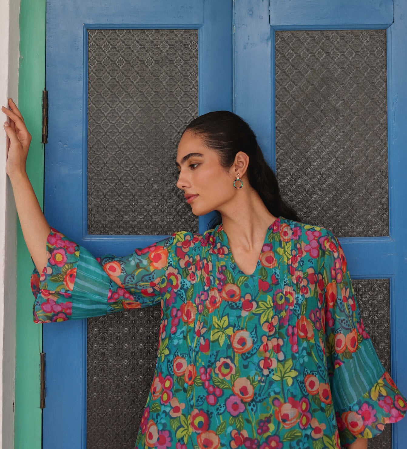 Breezy sophistication defines the teal bloom dress, adorned with multi-hued florals in a flowing silhouette. Voluminous sleeves with striped and scalloped borders enhance its festive charm. Ideal for festive dinners, cultural gatherings, or destination celebrations, this dress offers effortless elegance with a modern twist.