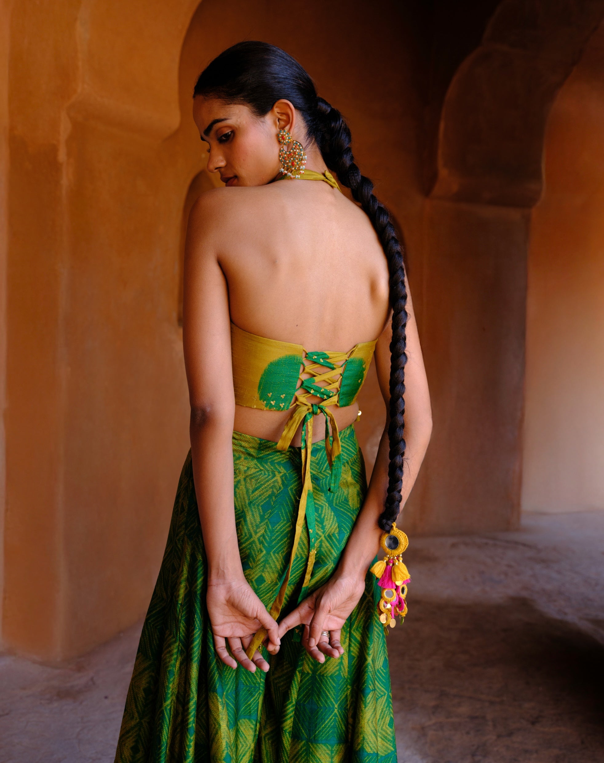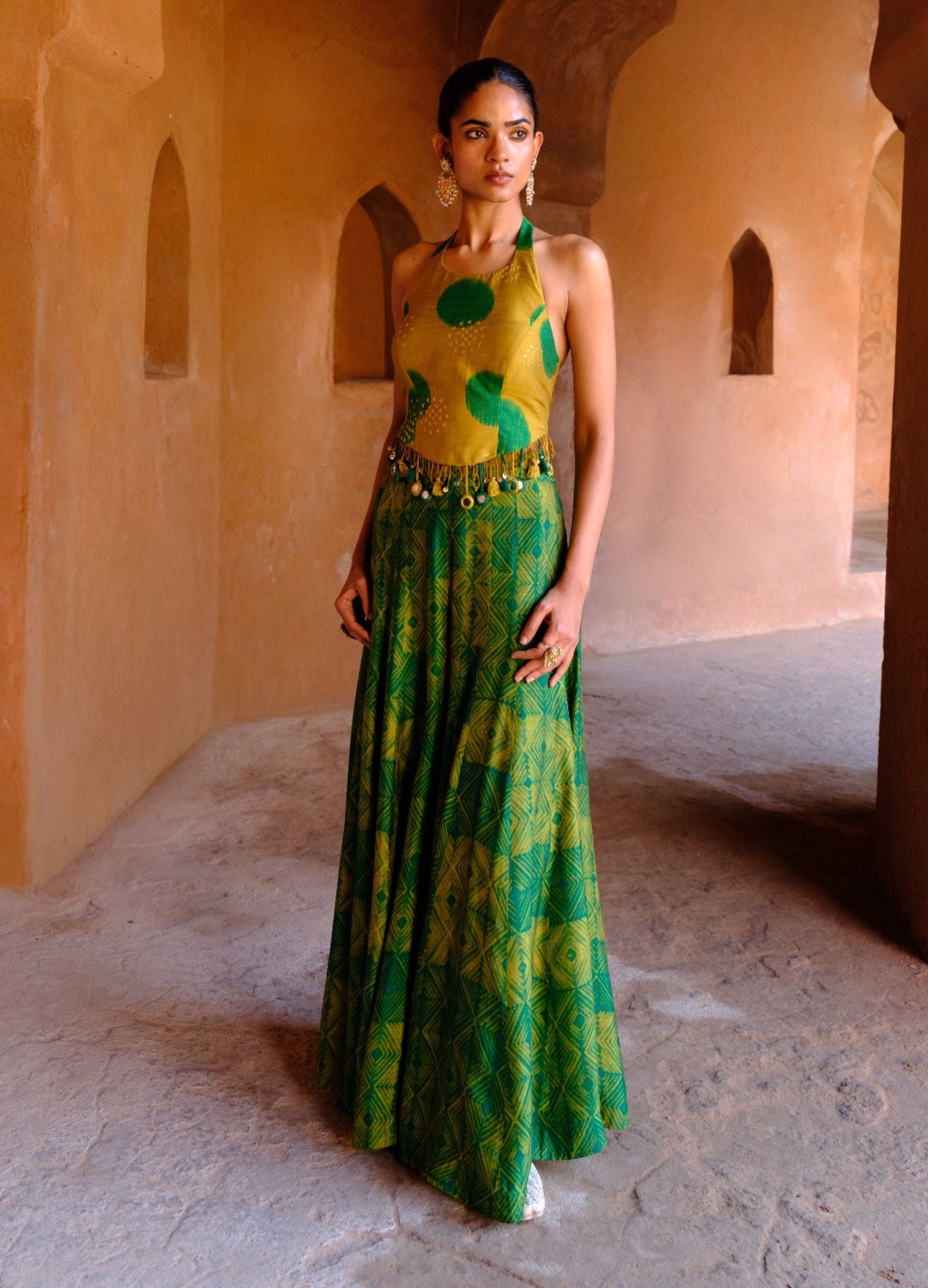 Effortlessly channeling stylised contemporary luxury, the tara co-ord pairs a printed kali pant with a tasseled printed top. The look blends playful prints with relaxed elegance. The green tones bring refreshing festive charm. Perfect for casual celebrations, festive brunches, and modern gatherings.
