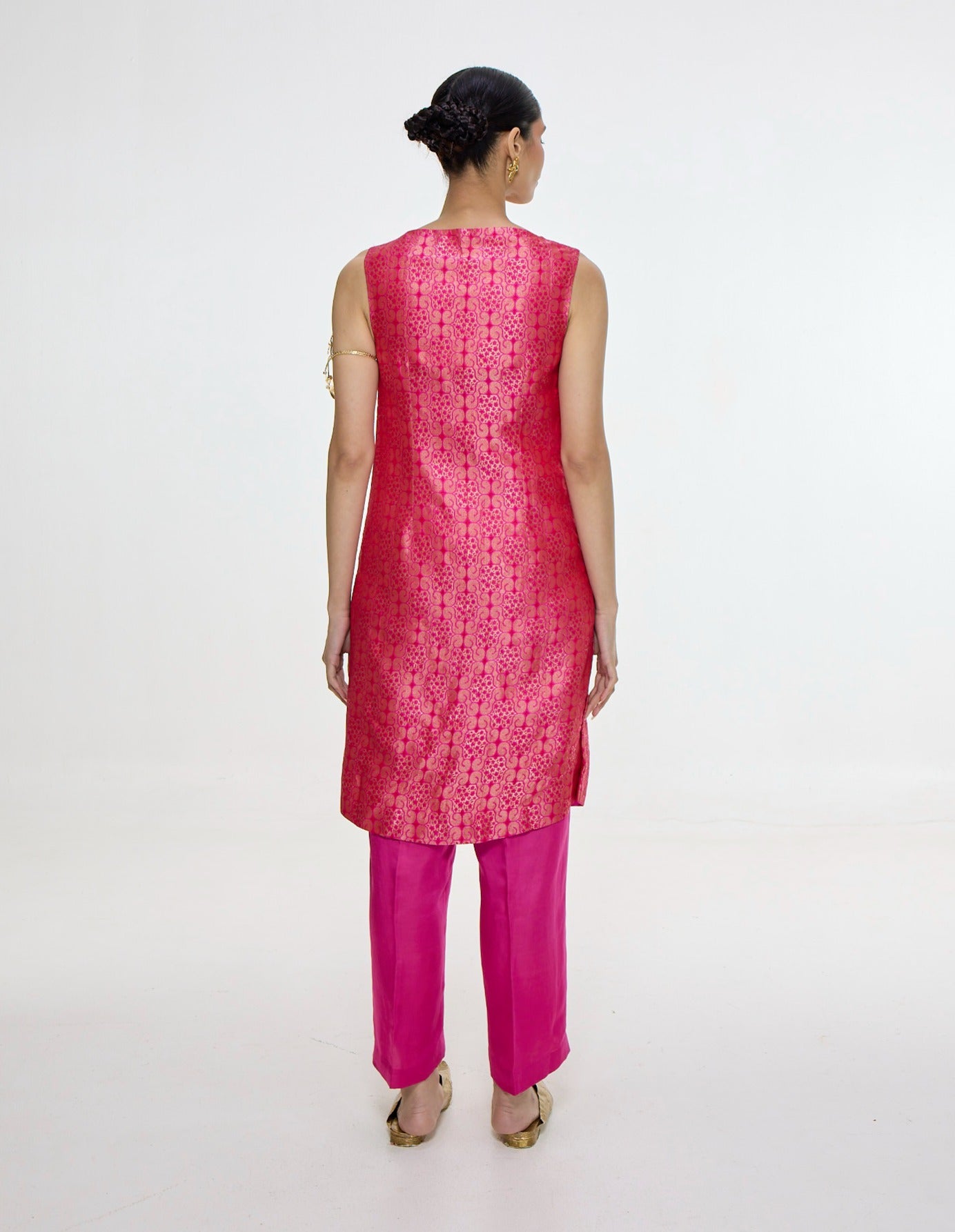 Vibrant and contemporary, this hot pink waistcoat set crafted in Banarasi Tanchoi satin silk reimagines traditional textiles with modern ease. Its fluid silhouette pairs beautifully for wedding celebrations or stylish dinners, especially when accessorised with bold jewellery and a sleek potli for a polished festive look.