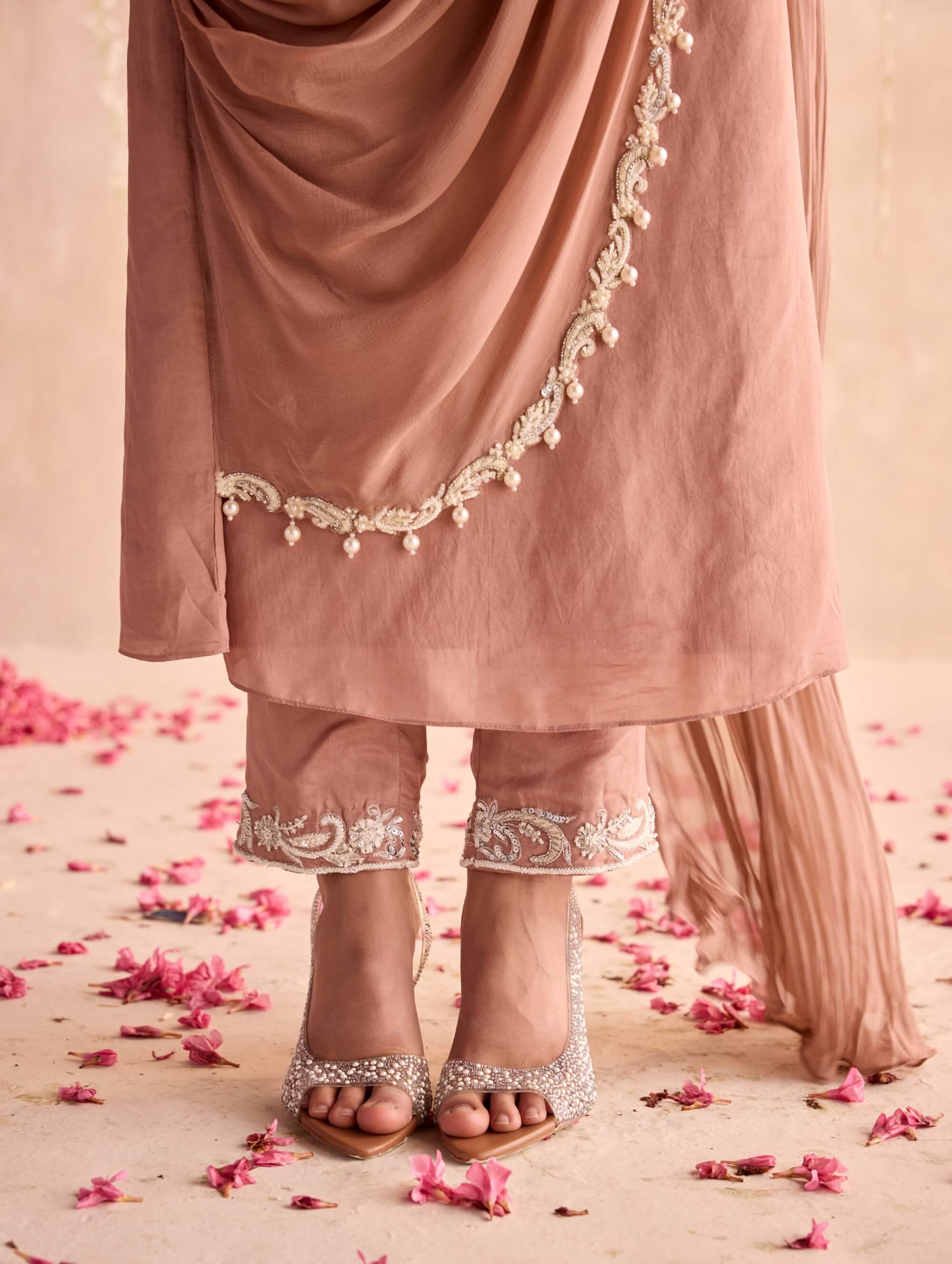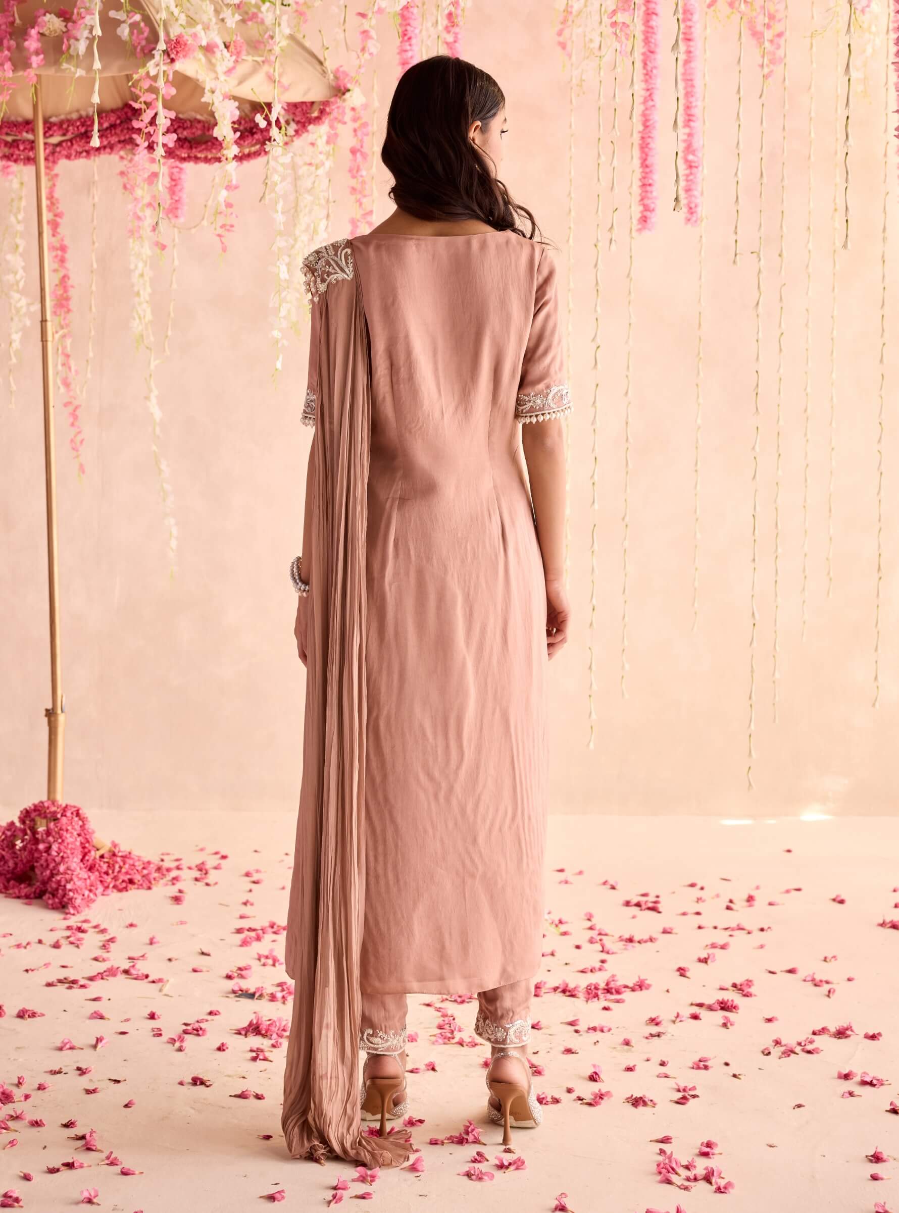 Crafted for the modern muse, this champagne embellished straight kurta is a masterpiece in minimalism. The pre-draped dupatta gracefully falls over the shoulders, while the straight pants provide a sleek, flattering silhouette. The gentle embellishments on the kurta add just the right amount of sparkle, making this outfit perfect for formal events or festive gatherings where understated elegance is the goal.