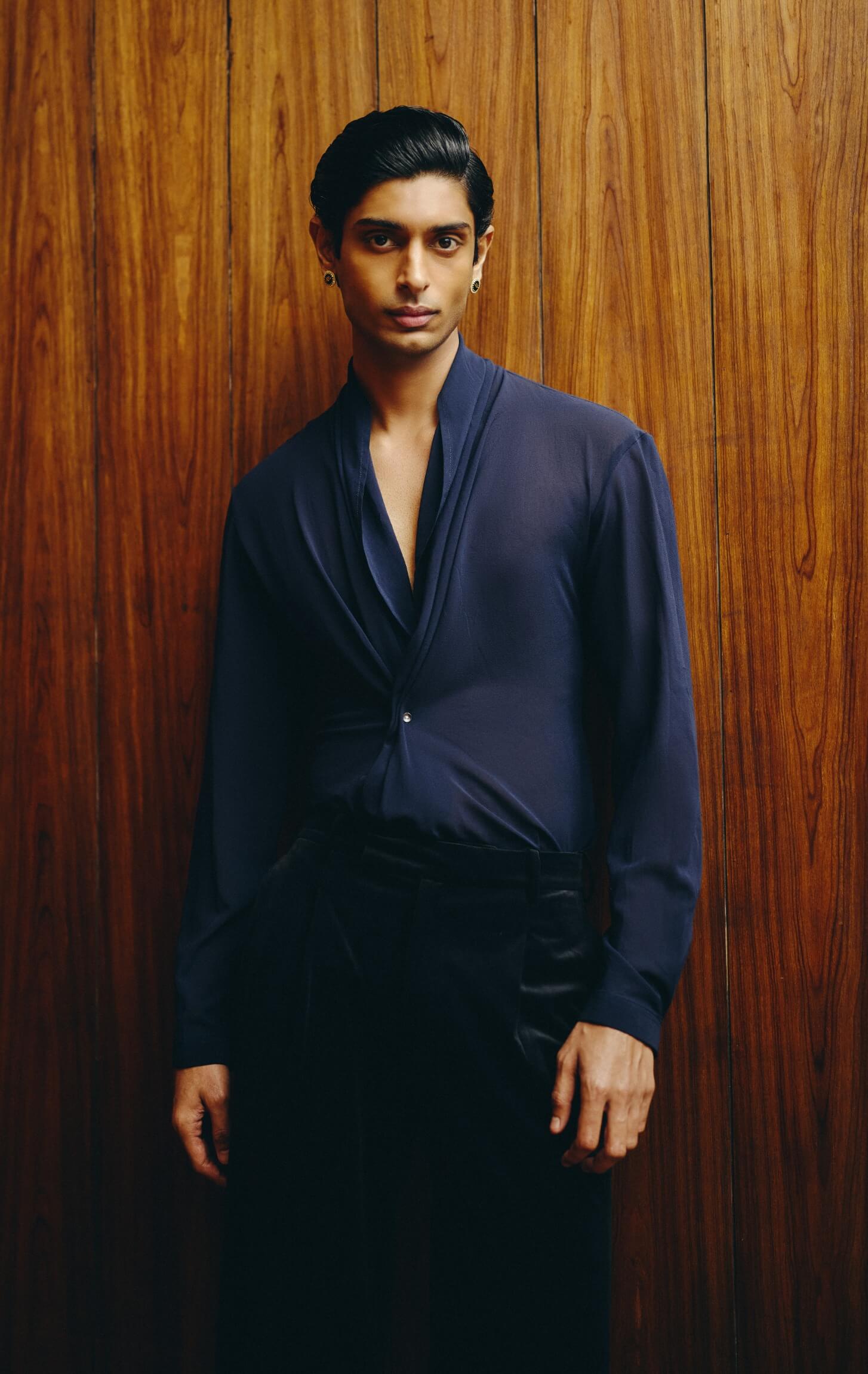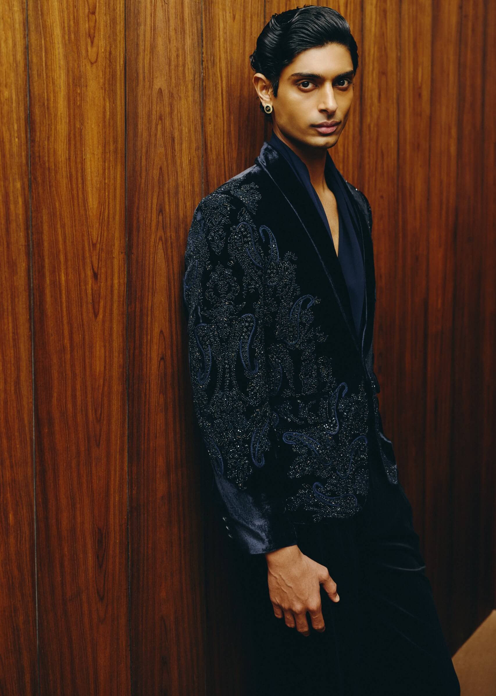 A dark royal blue velvet tuxedo elevated with tonal paisley embroidery across the blazer, offering depth without overpowering the silhouette. Styled with a tone-on-tone draped V-neck shirt and tailored velvet trousers, the look delivers modern sophistication with a seamless finish.