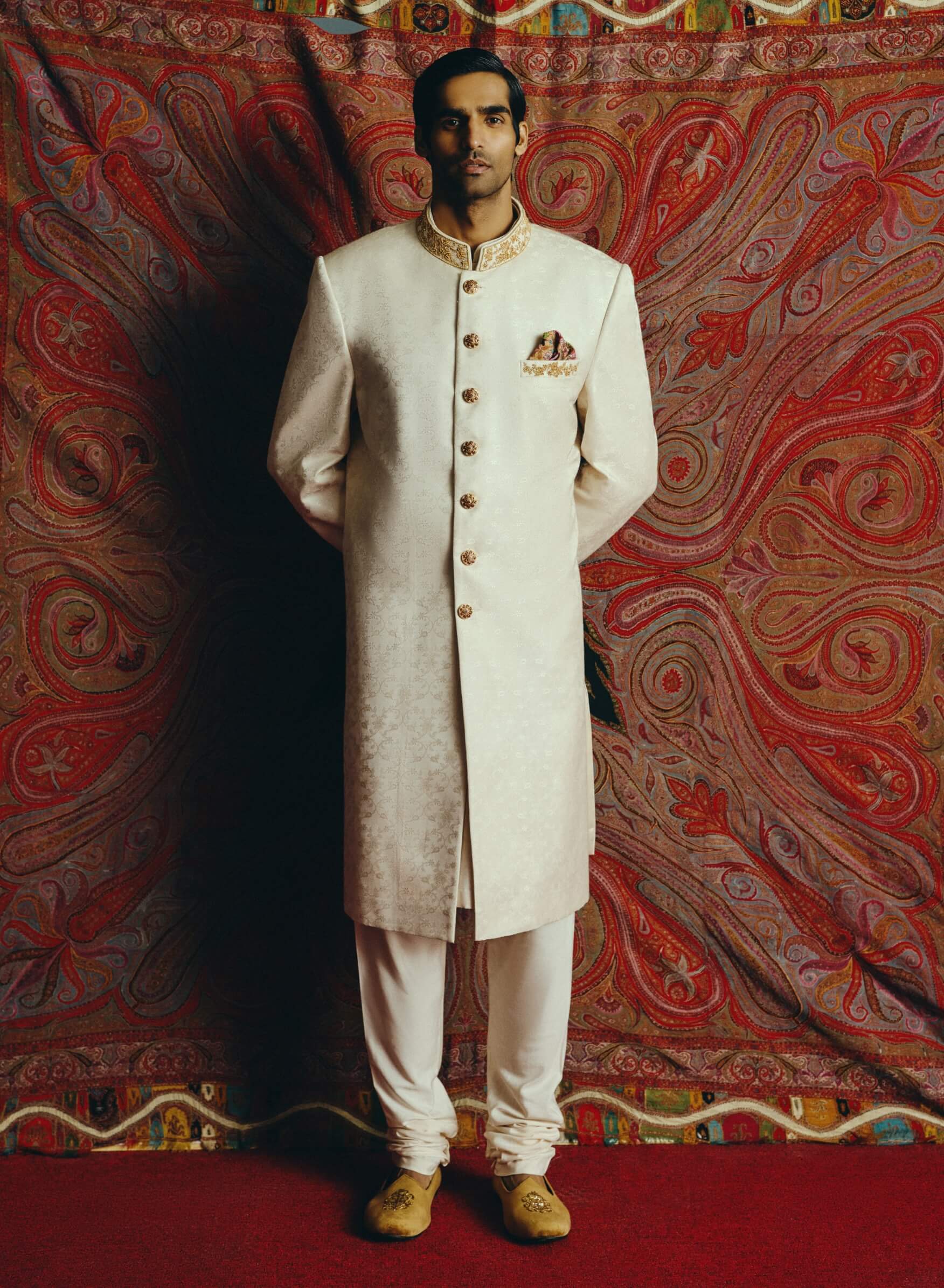 A refined white banarasi achkan layered over an ivory kurta and classic churidar. Delicate hand embroidery on the collar and buttons adds subtle artisanal charm. A silk pocket square completes the polished silhouette. Ideal for weddings, ceremonial occasions, and festive celebrations.