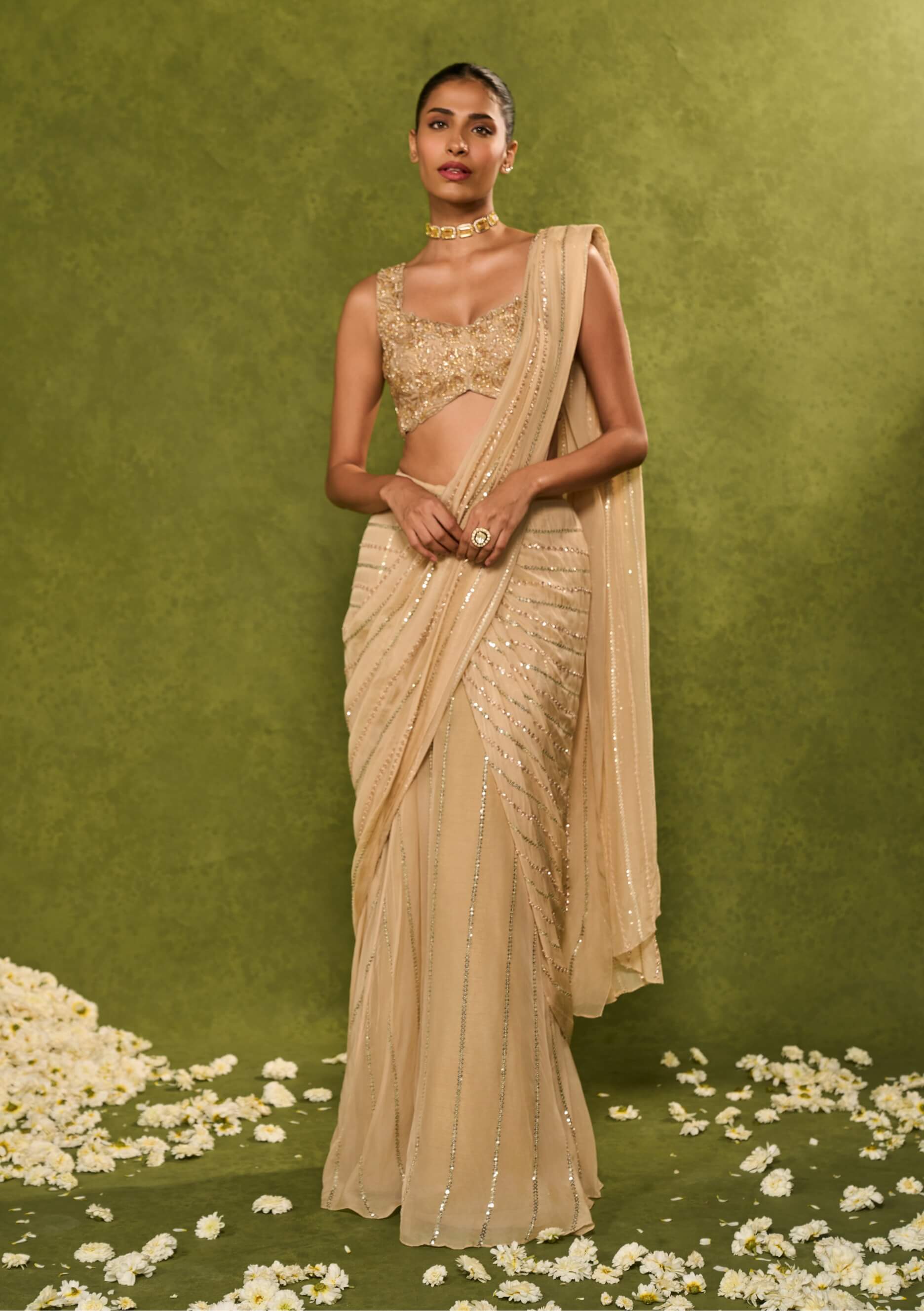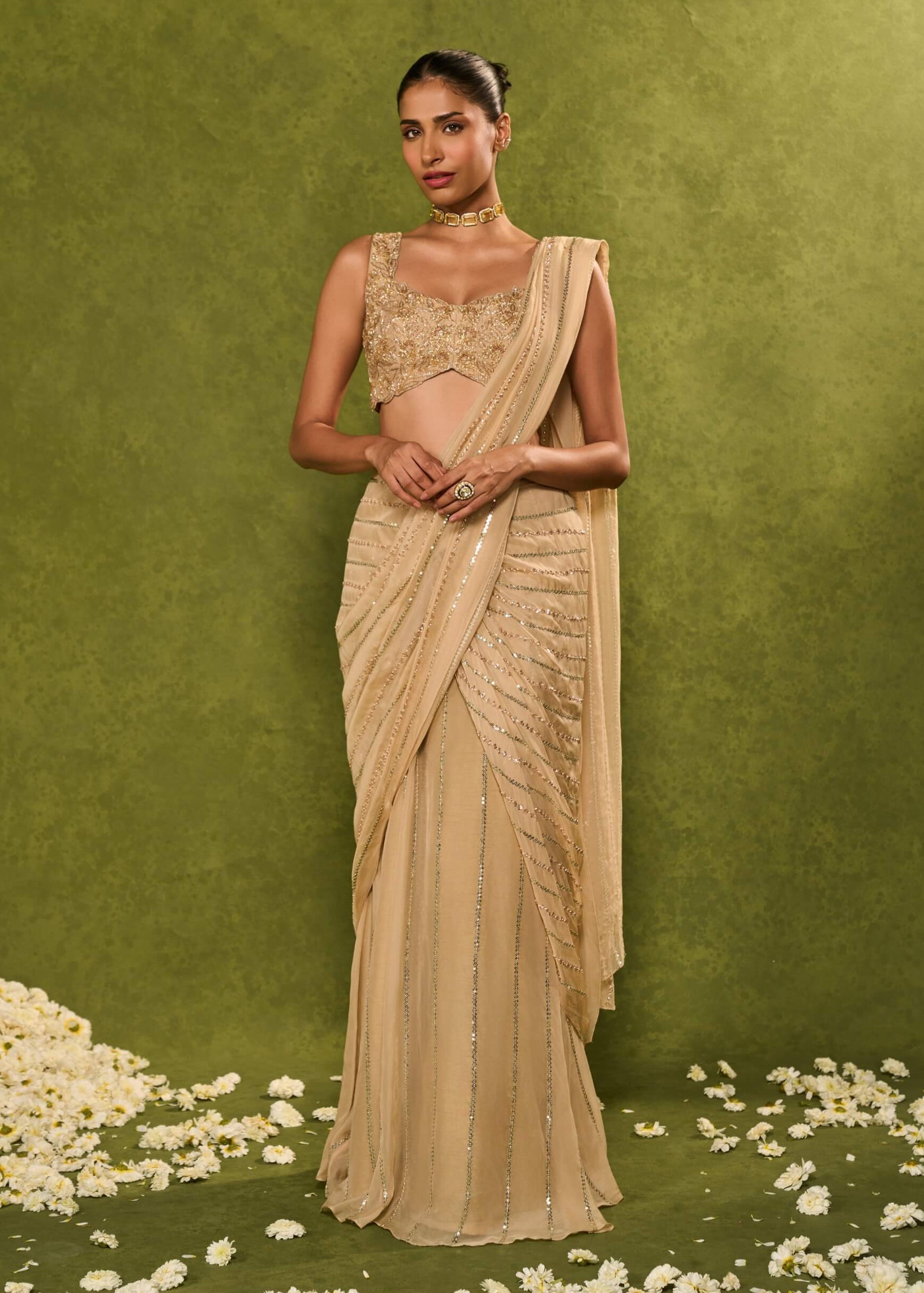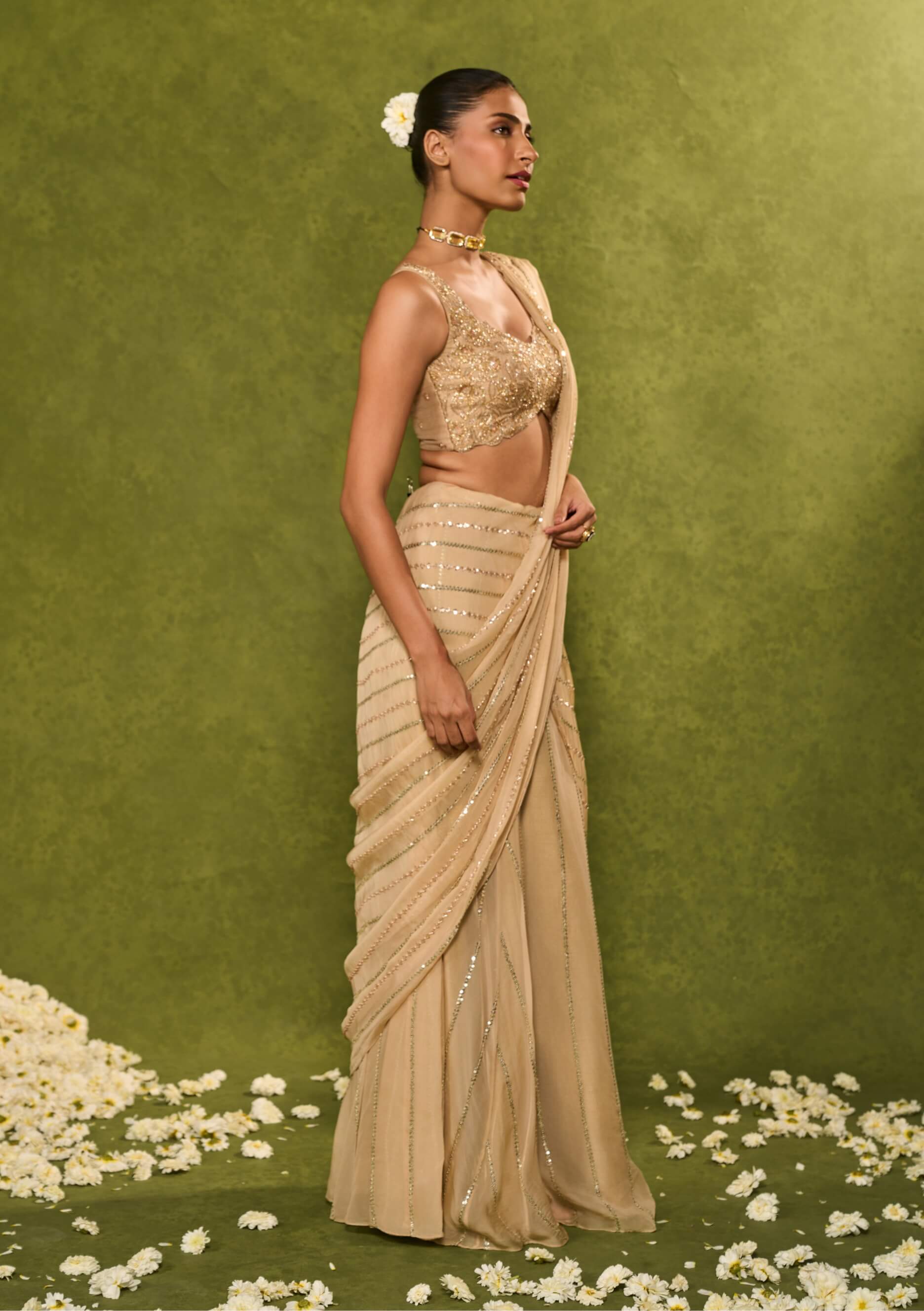 Softly radiant and delicately refined, this organza pre-draped sari features subtle glass bead and sequin embellishment. The encrusted blouse complements the sari with understated elegance. Lightweight and fluid, it creates an effortlessly graceful silhouette. Crafted for modern minimal luxury. Perfect for engagement ceremonies, intimate weddings, and elegant evening gatherings.