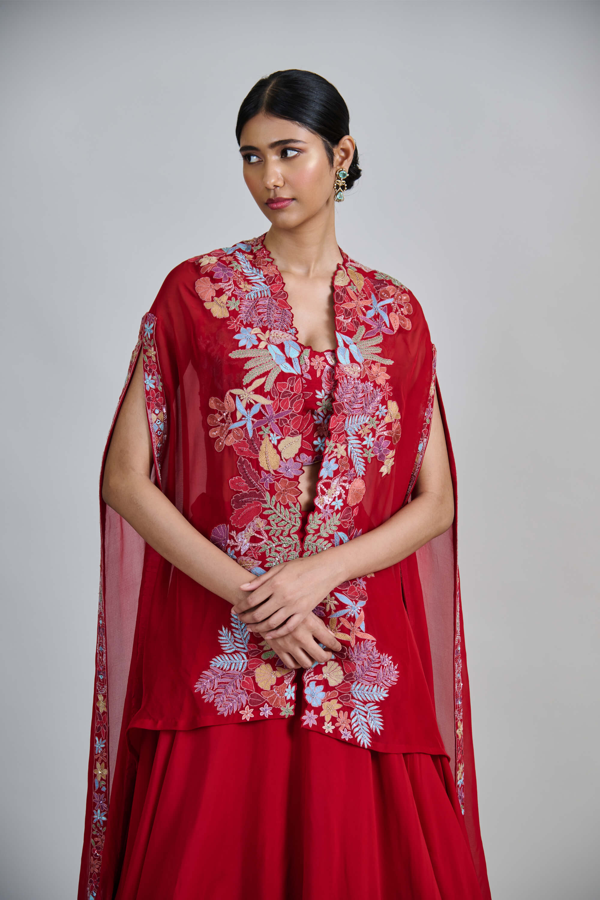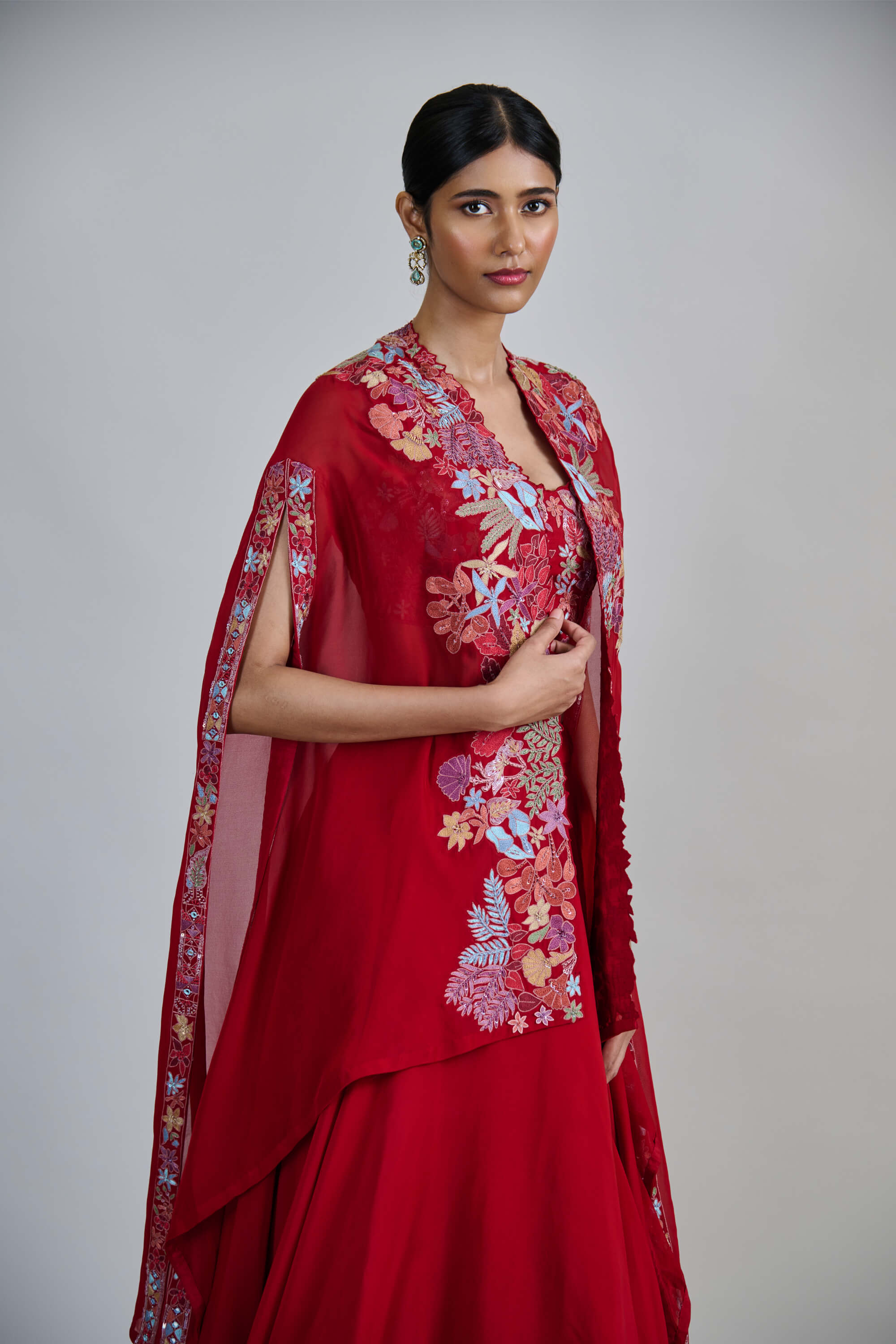 A multicolour red wildflower pleated organza cape with a matching bustier and skirt. Vibrant and high-impact. Perfect for wedding guests, cocktail nights, or destination festivities.