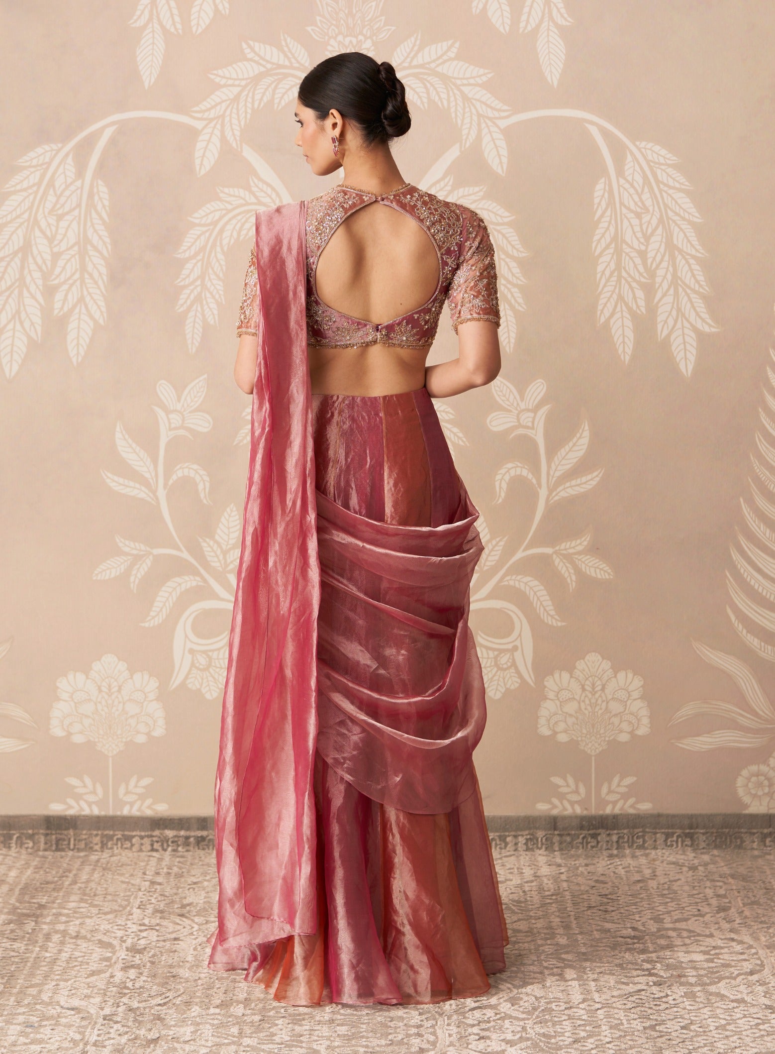 Rich and festive, this tissue duo embroidered blouse with a draped stitched sari radiates celebratory charm, making it ideal for weddings, festive evenings, and grand occasions.