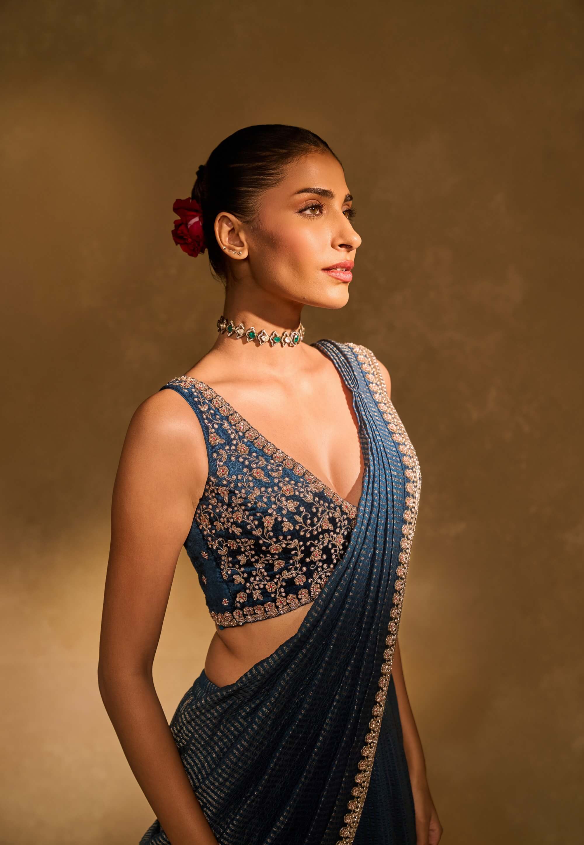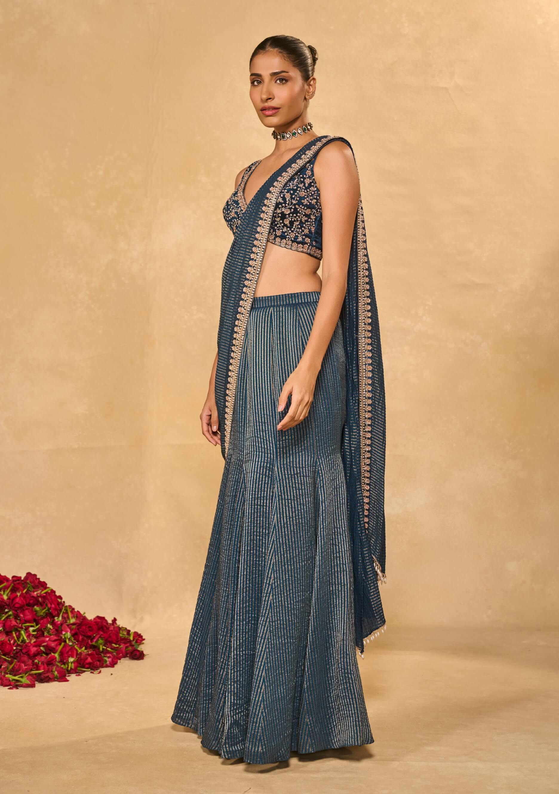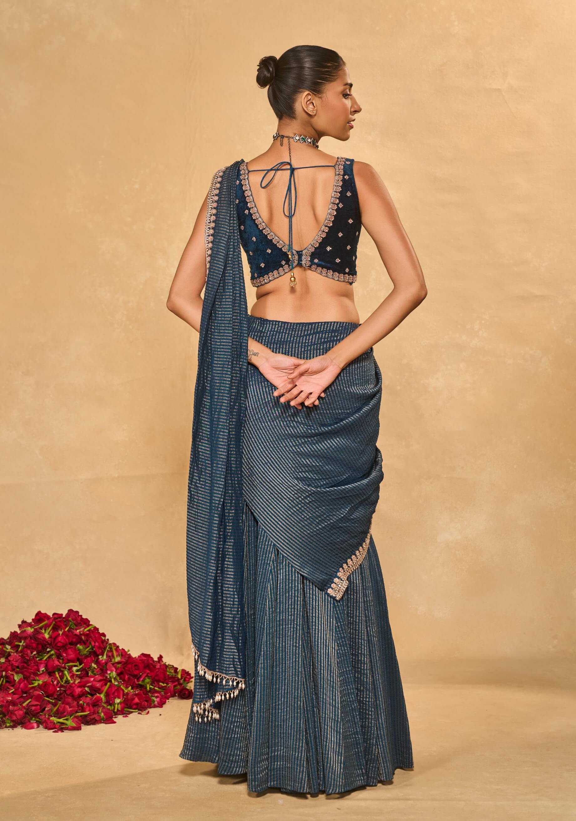 An ode to timeless glamour, this tissue jamewar pre-draped sari is elevated with an exquisitely embellished floral border. Paired with a plunge V-neck velvet blouse adorned with zardozi, pearls, and glass beads, it offers rich texture and elegance. The fluid drape ensures effortless wear while retaining structure. Designed for graceful movement and refined impact. Ideal for cocktail evenings and festive celebrations.