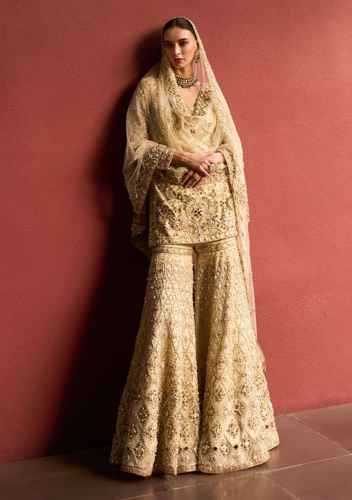 Wrapped in ivory elegance, this gharara reflects a serene yet opulent bridal mood. An ivory gharara set in soft tulle with intricate gota, sequins, poth, pearls, stones, dori, sadi, diamonte, and zardozi work. Paired with a fitted kurti and embroidered dupatta.
