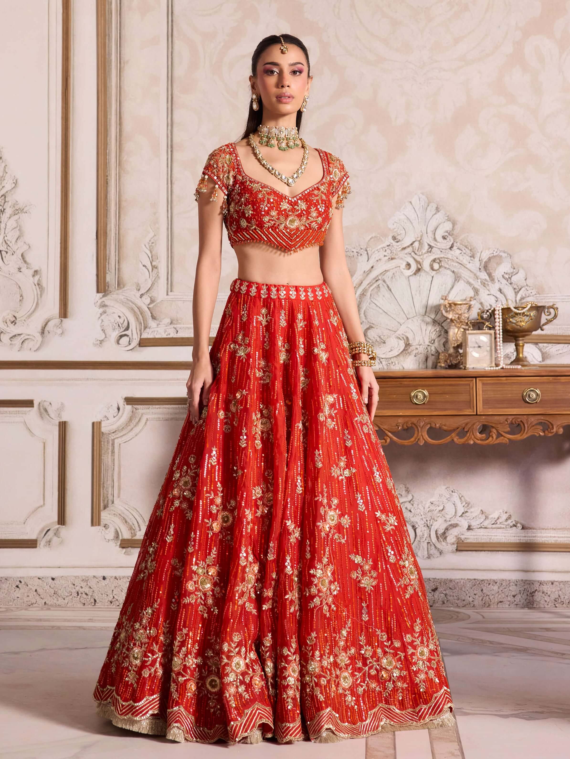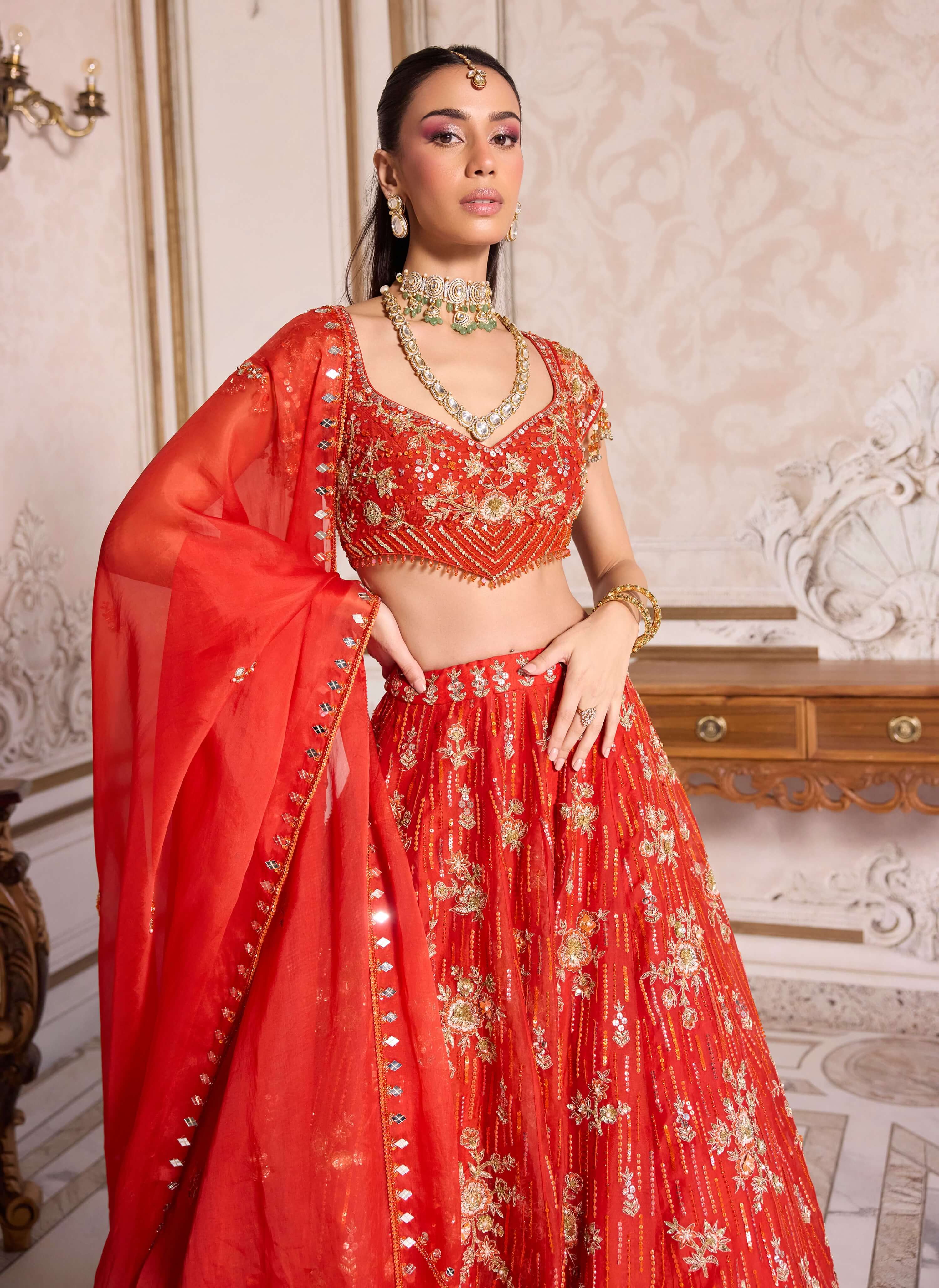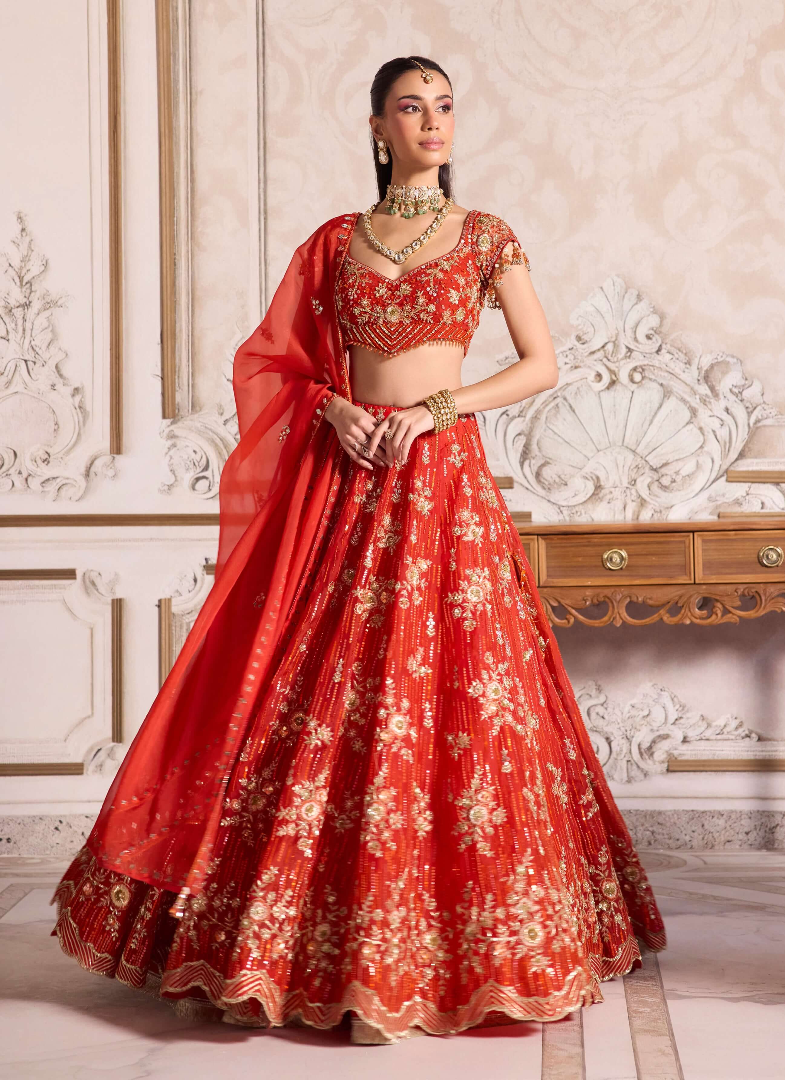 An ode to regal artistry, this rust pure silk organza lehenga radiates heritage charm through floral butta embroidery enhanced with zari, dabka, and glass beads. The scalloped hem reveals cutwork intricacy, while the ghoongroo tassels at the sleeves add a festive glimmer. Completed with an embroidered organza dupatta, it’s both nostalgic and new-age.