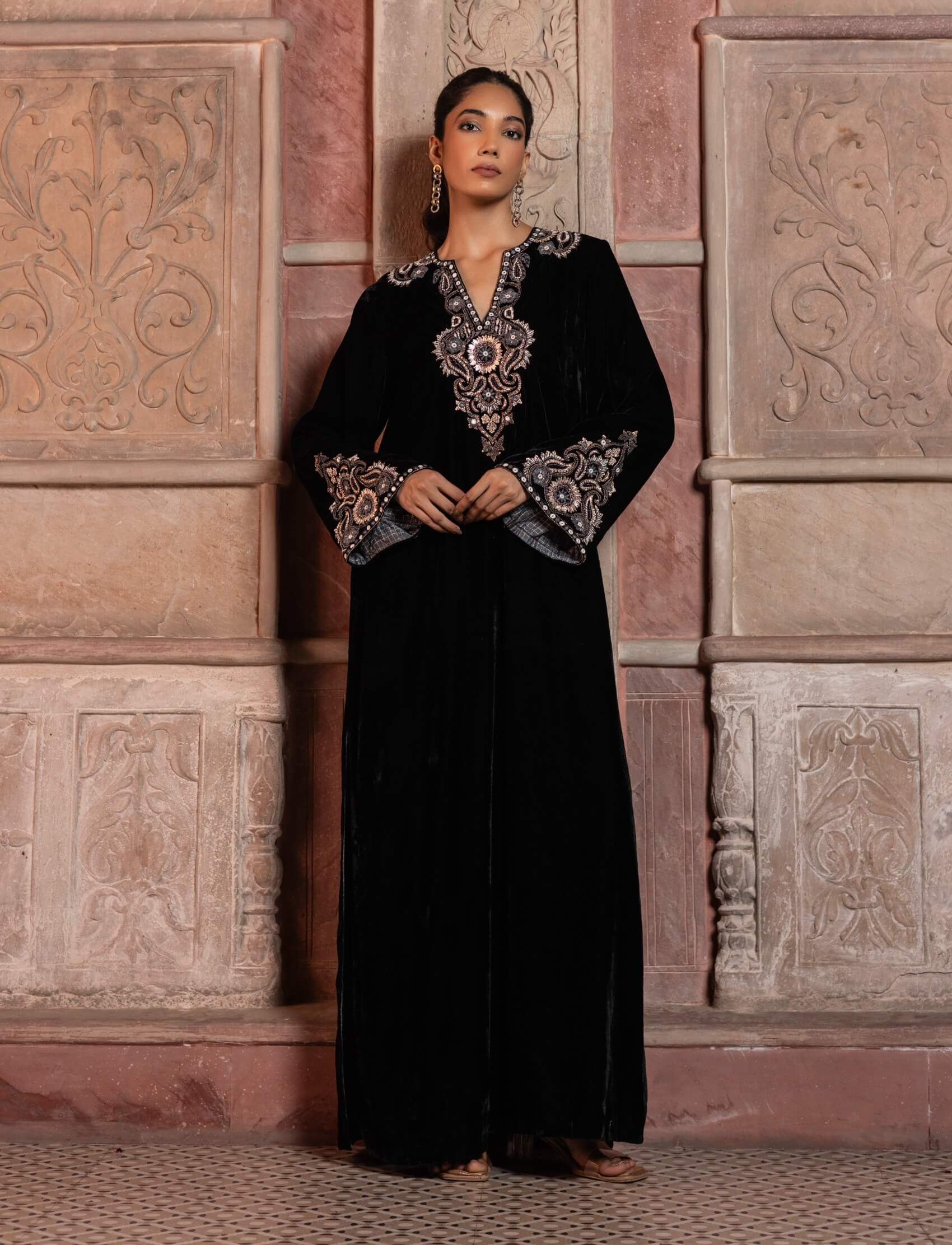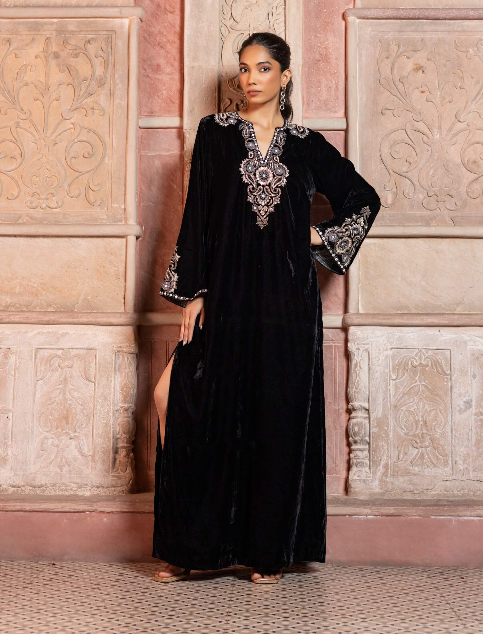Opulent and commanding, this black velvet kaftan features intricate paisley embroidery that glimmers subtly under light. The luxurious drape and fine craftsmanship make it ideal for winter festivities, evening galas, or destination weddings. A bold ode to the art of indulgence.