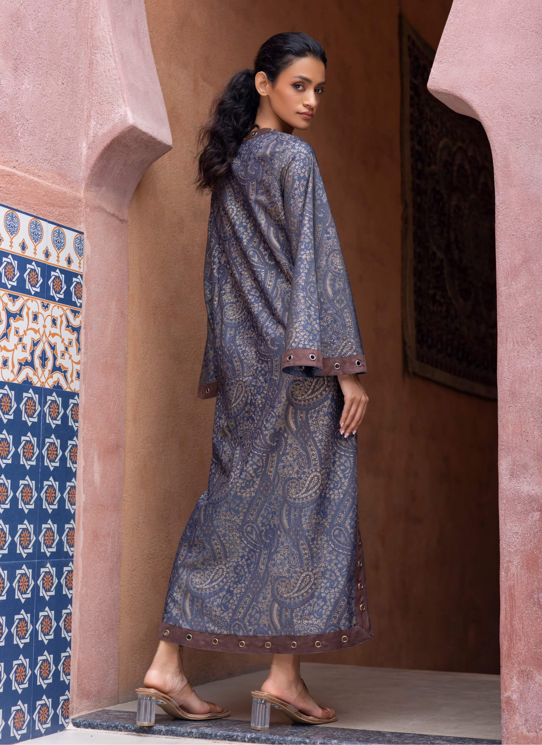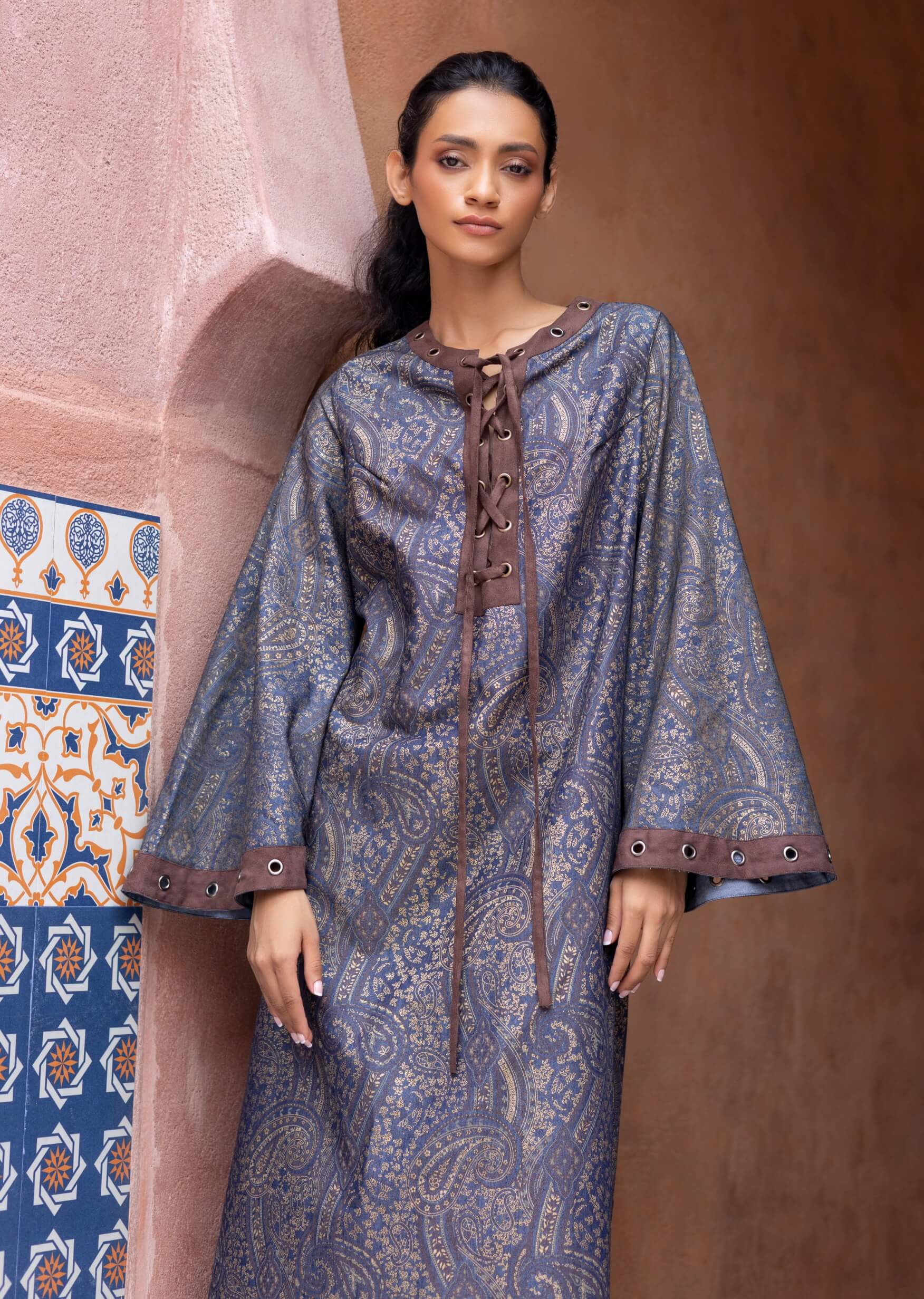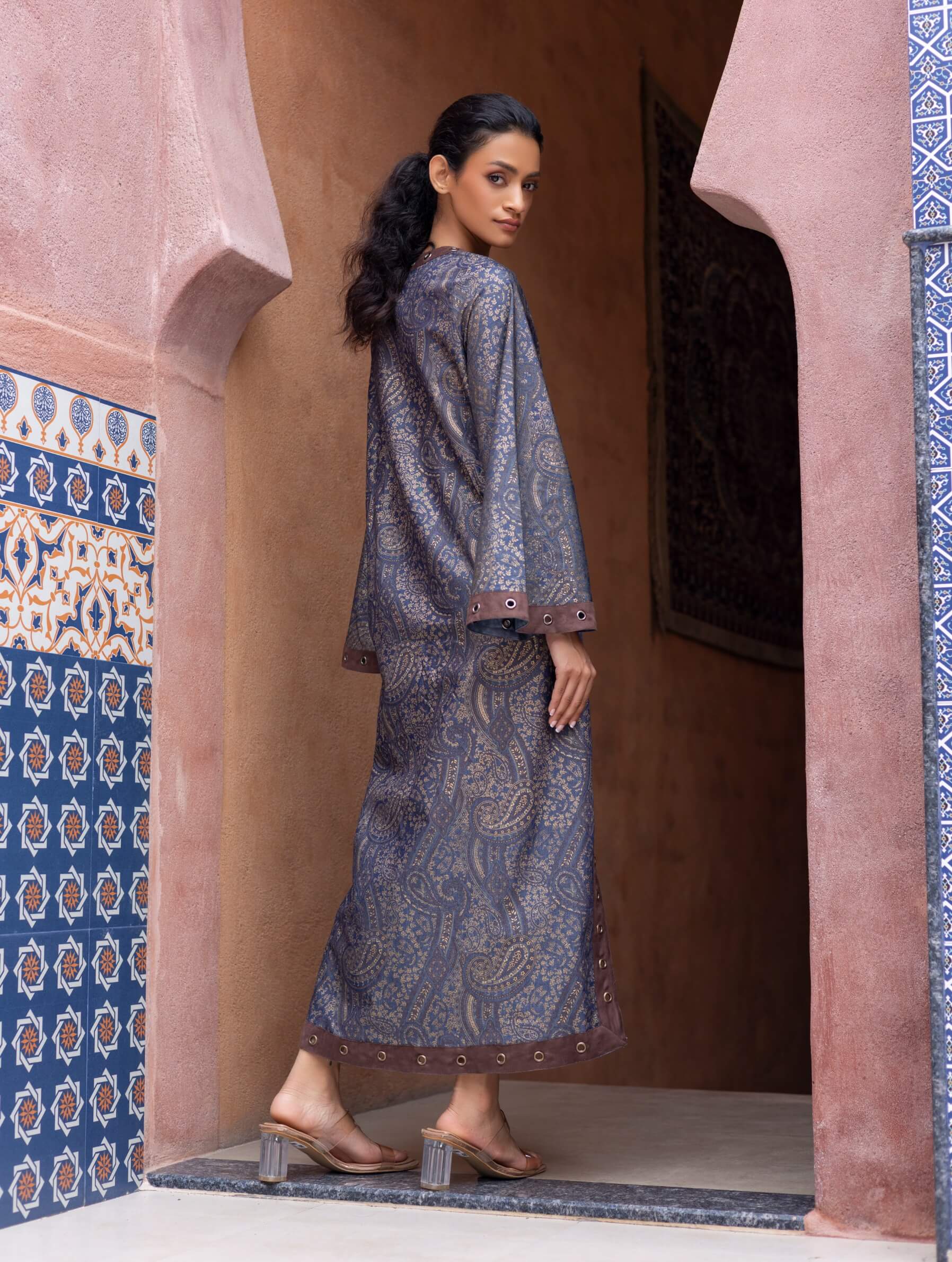 Exuding effortless charm, this blue denim printed kaftan with suede edging is chic, versatile, and travel-perfect. The fusion of denim texture with refined detailing makes it ideal for brunches, art fairs, or holiday retreats. A casual-luxe essential that embodies laid-back sophistication.