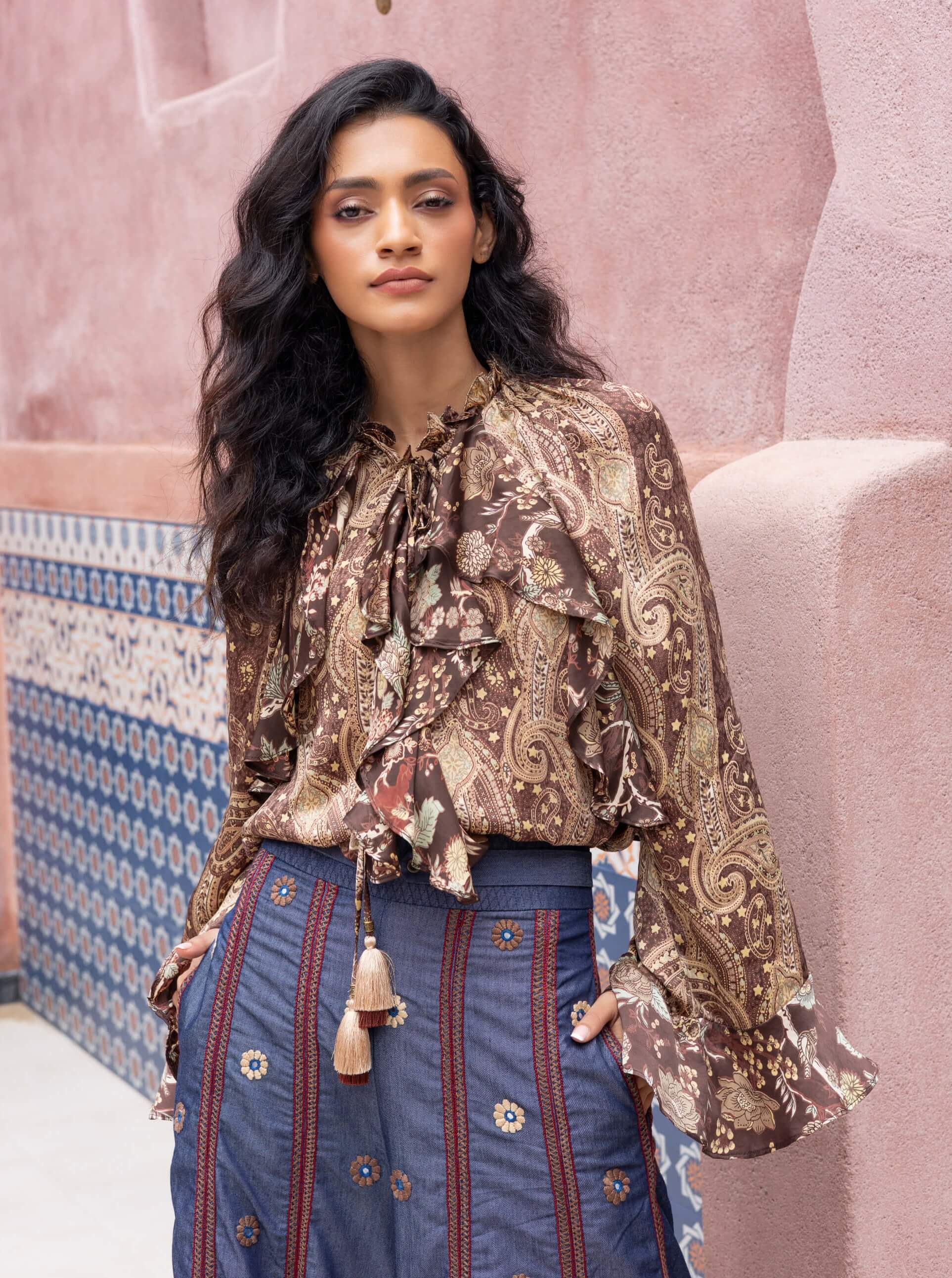 A celebration of playful femininity, this paisley printed ruffle shirt paired with mirror-embroidered denim pants is pure sartorial joy. The ruffles add fluid movement, while the embroidery adds artisanal depth. Perfect for brunches, resort escapes, or casual festive affairs.
