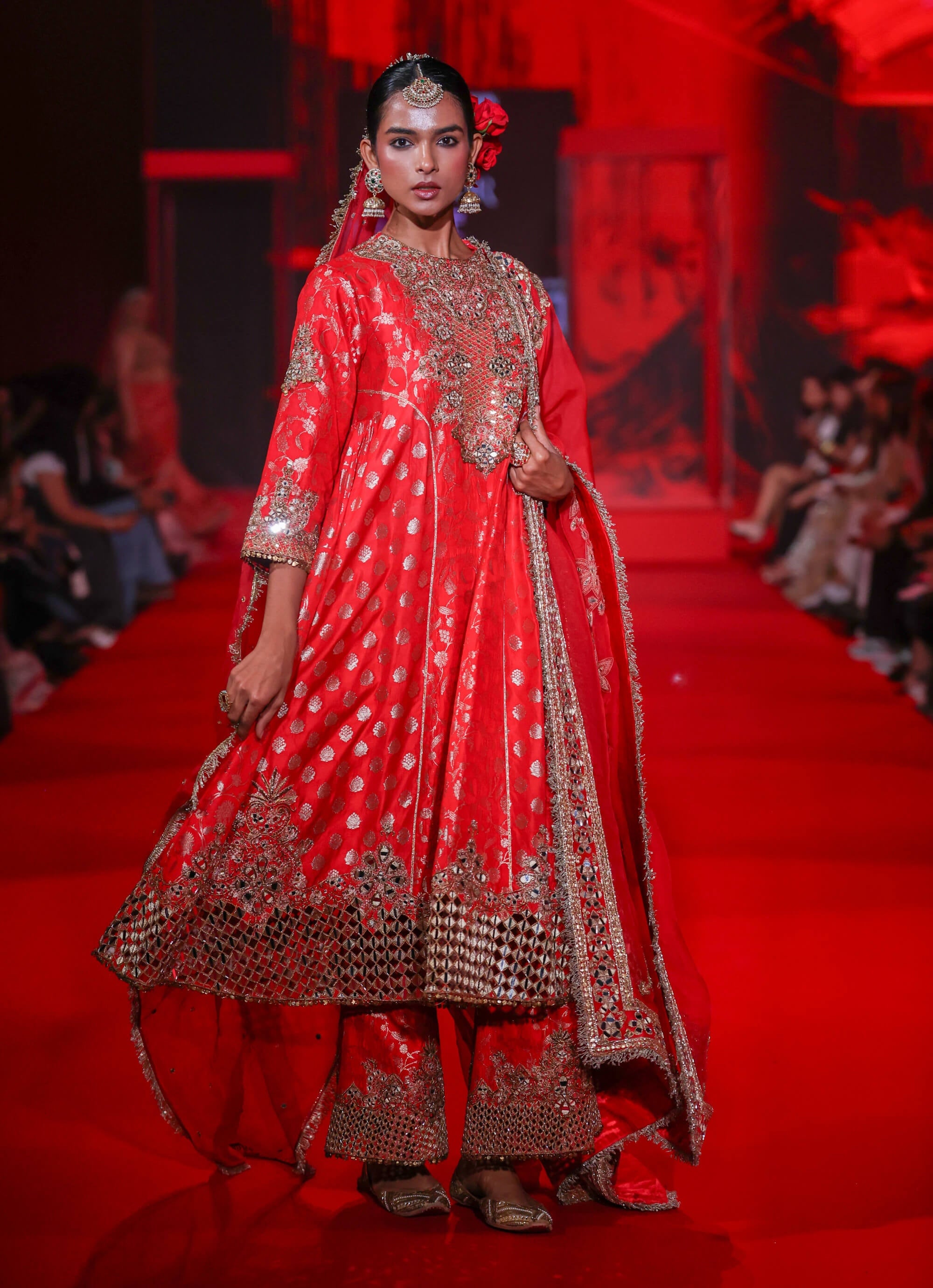Where craft meets structure — the red brocade kurta showcases intricate embroidery along the yoke and borders, complemented by brocade pants and a sheer organza dupatta. The interplay of cutwork and texture radiates timeless appeal. A refined statement for festive celebrations and wedding soirées.