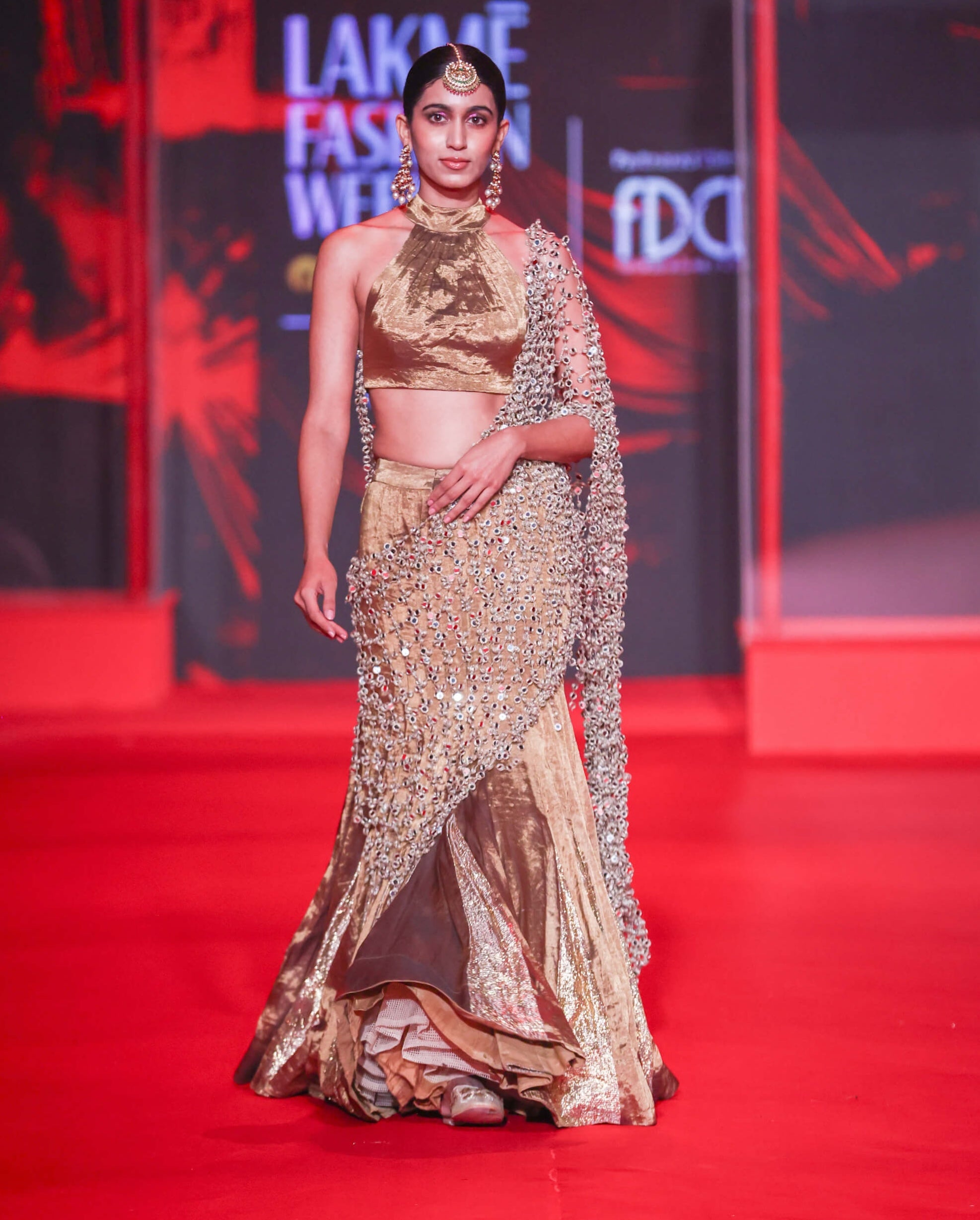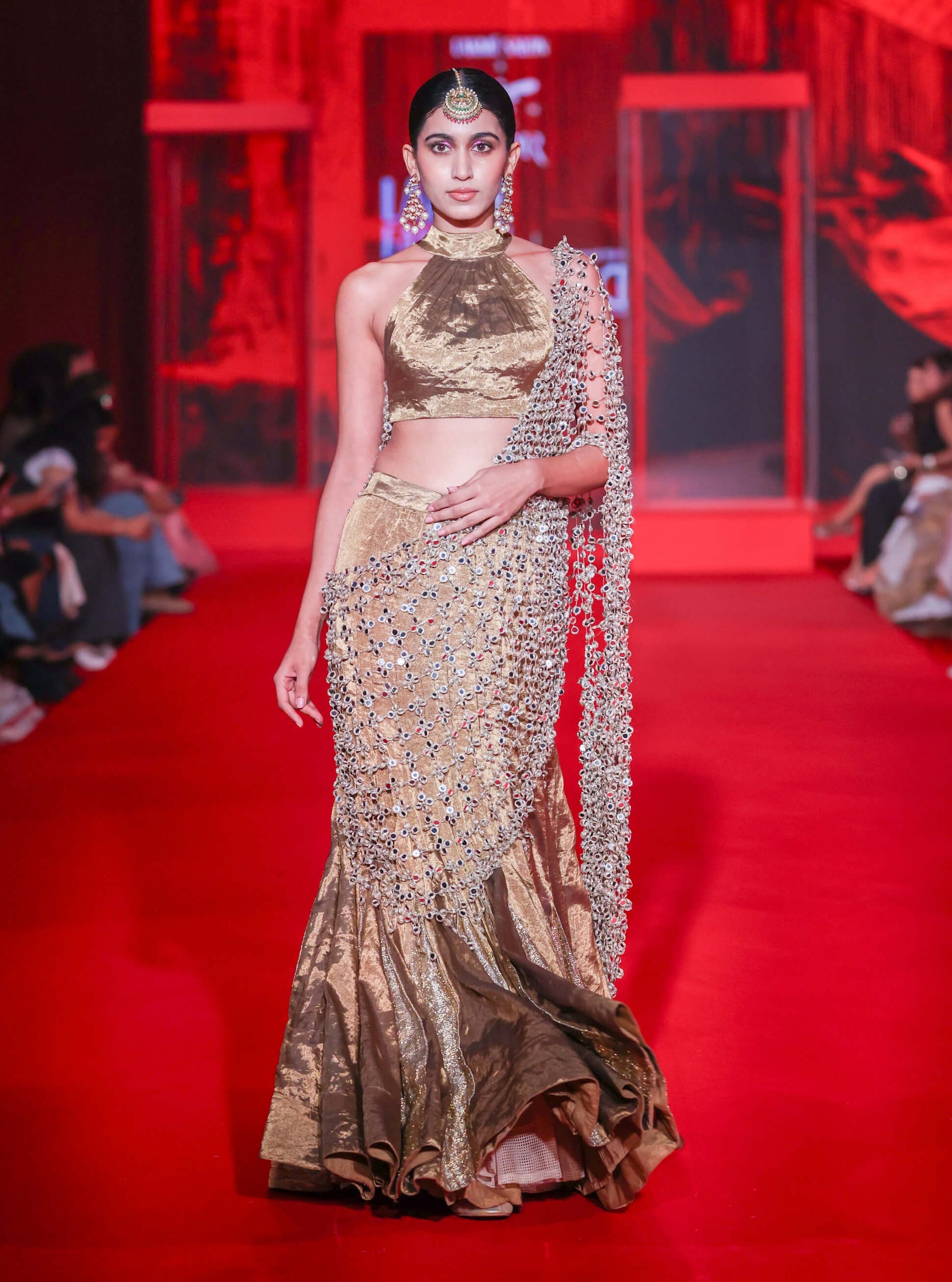 Bronzed brilliance — this fishtail lehenga in tissue gold radiates sensual geometry with gota detailing. The halter blouse features mirror-jhalar accents that catch the light with every turn, while a mirror jaal palla completes the vision. A bold, sculpted statement for receptions and destination weddings.