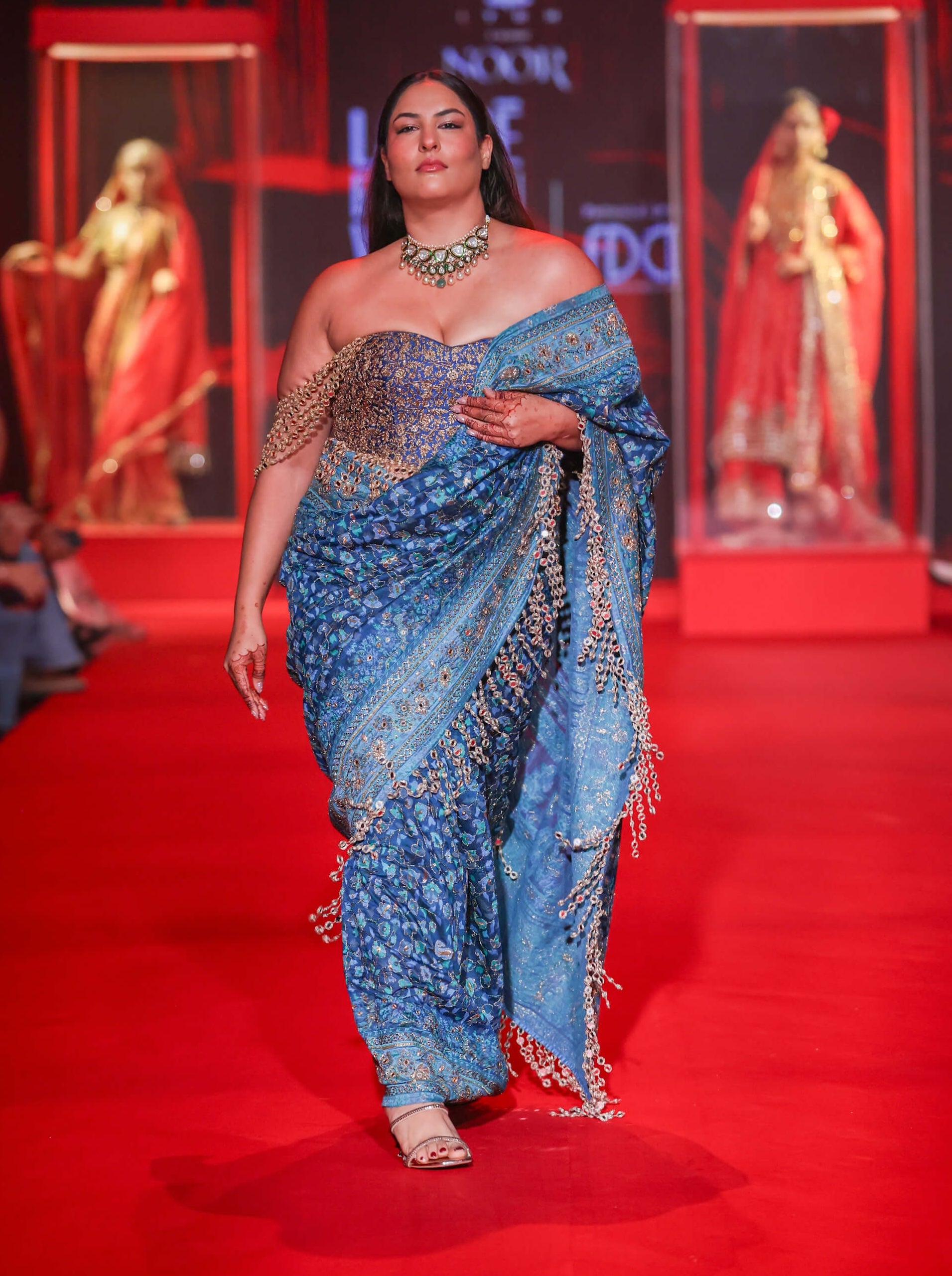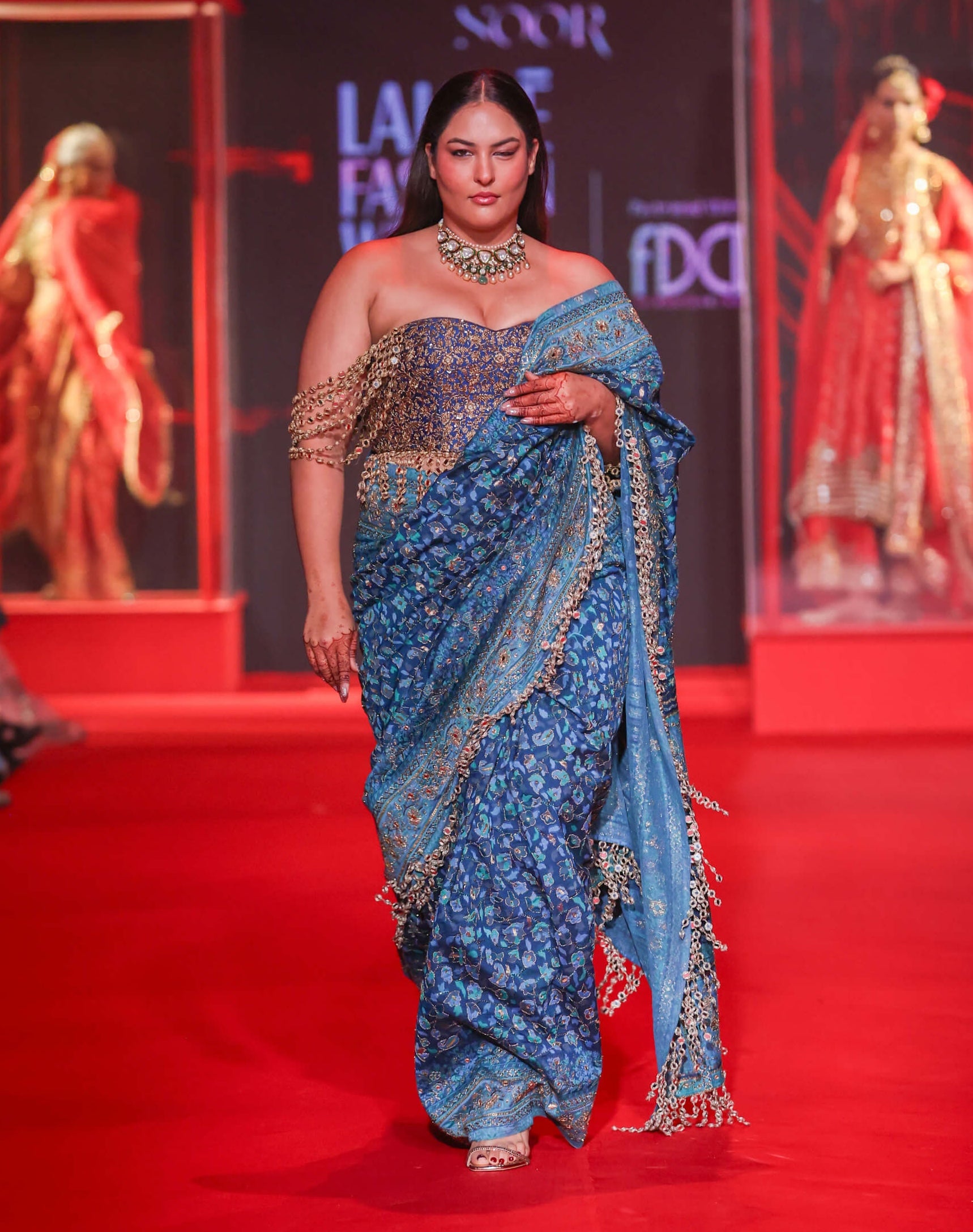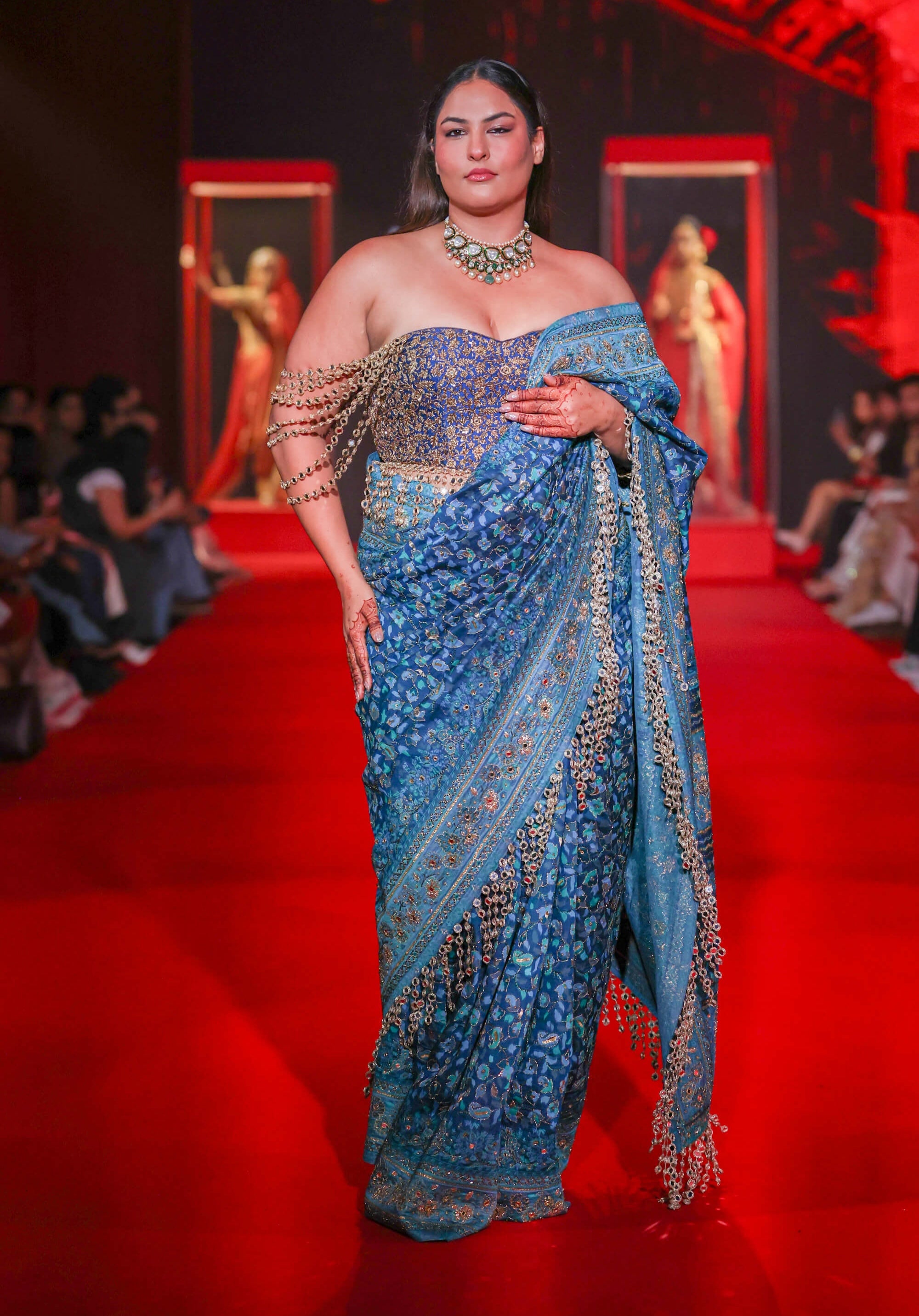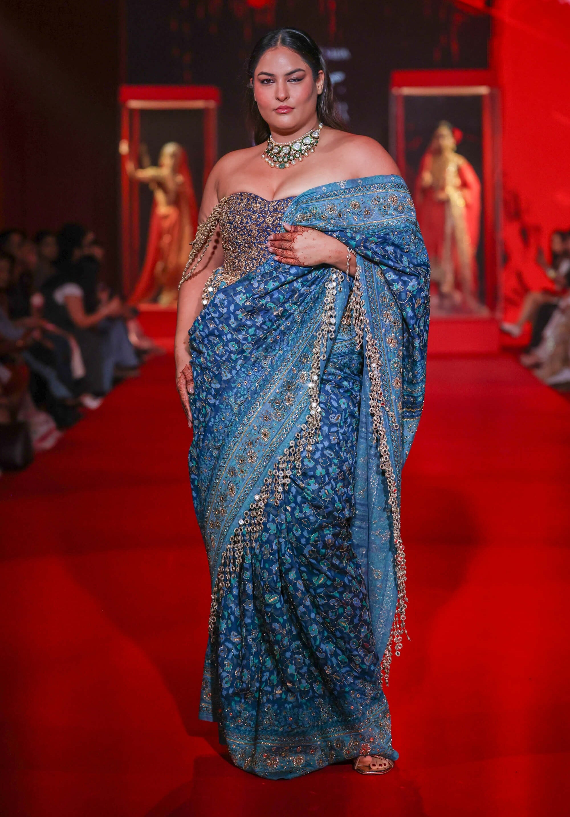 Effortlessly majestic, this blue jamawaar sari gleams with intricate embroidery. The mirror-detailed blouse adds sculptural dimension, making it ideal for cocktail nights, pre-wedding events, and refined evening affairs.