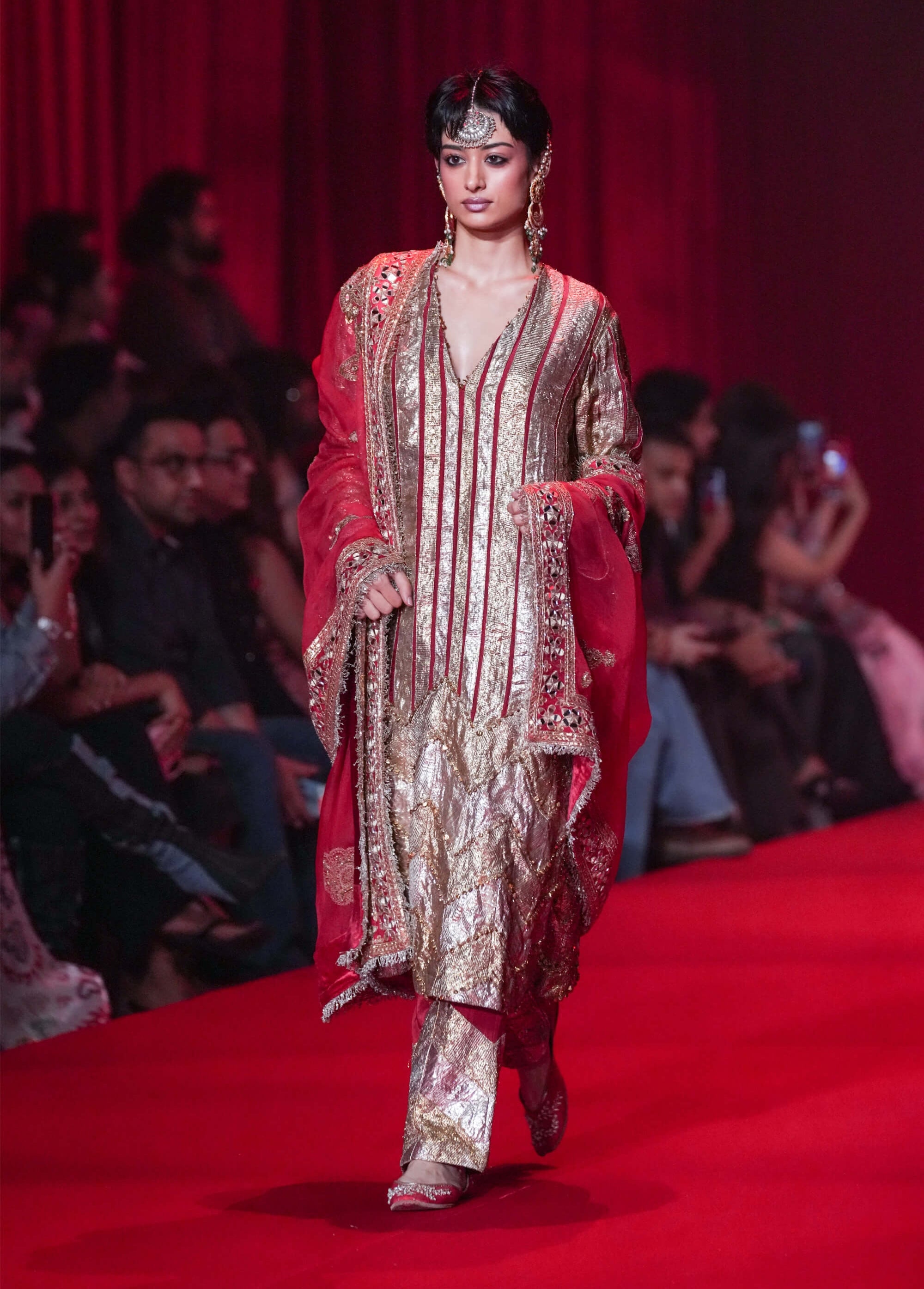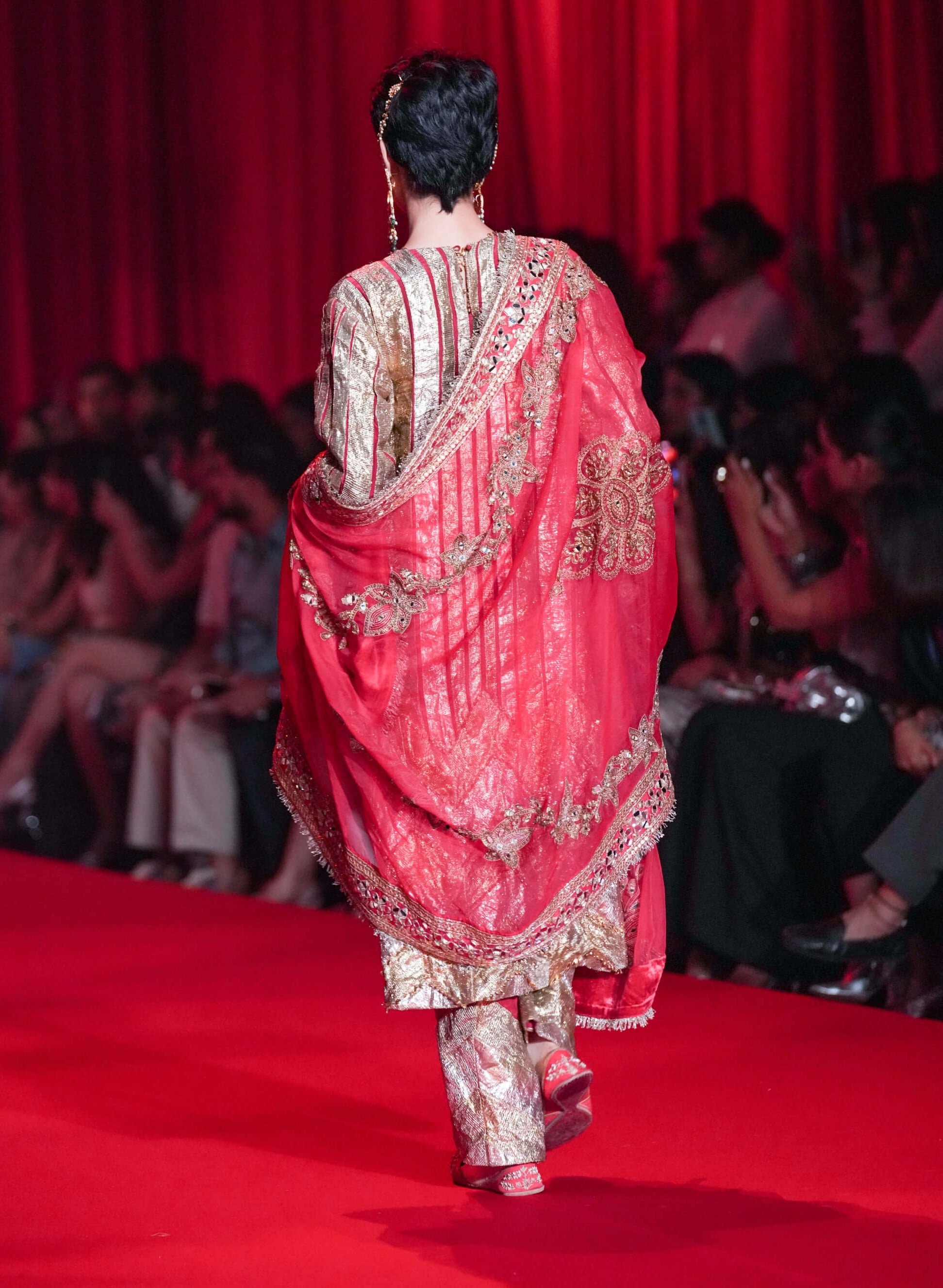A modern heirloom in motion — this red gota and crepe kurta set shimmers with ghungroo detailing and delicate embroidery. The organza dupatta drapes softly with handwork finesse, exuding subtle glamour. Ideal for pre-wedding rituals or intimate festive evenings that demand quiet sophistication.