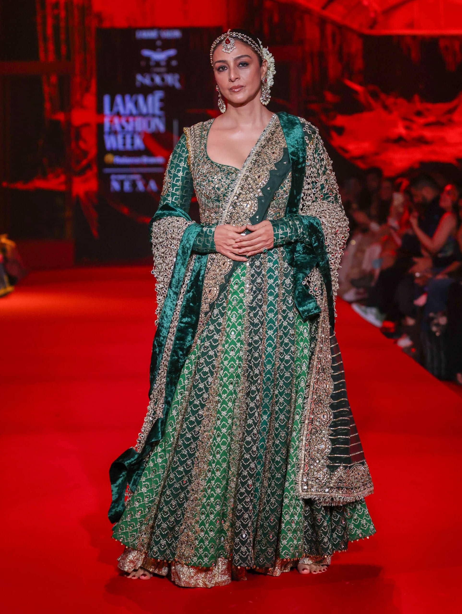 Emerald opulence takes center stage in this brocade anarkali adorned with mirror and crystal embroidery. Paired with a velvet dupatta and layered lehenga, it’s a masterpiece for weddings, grand festivities, and couture celebrations.