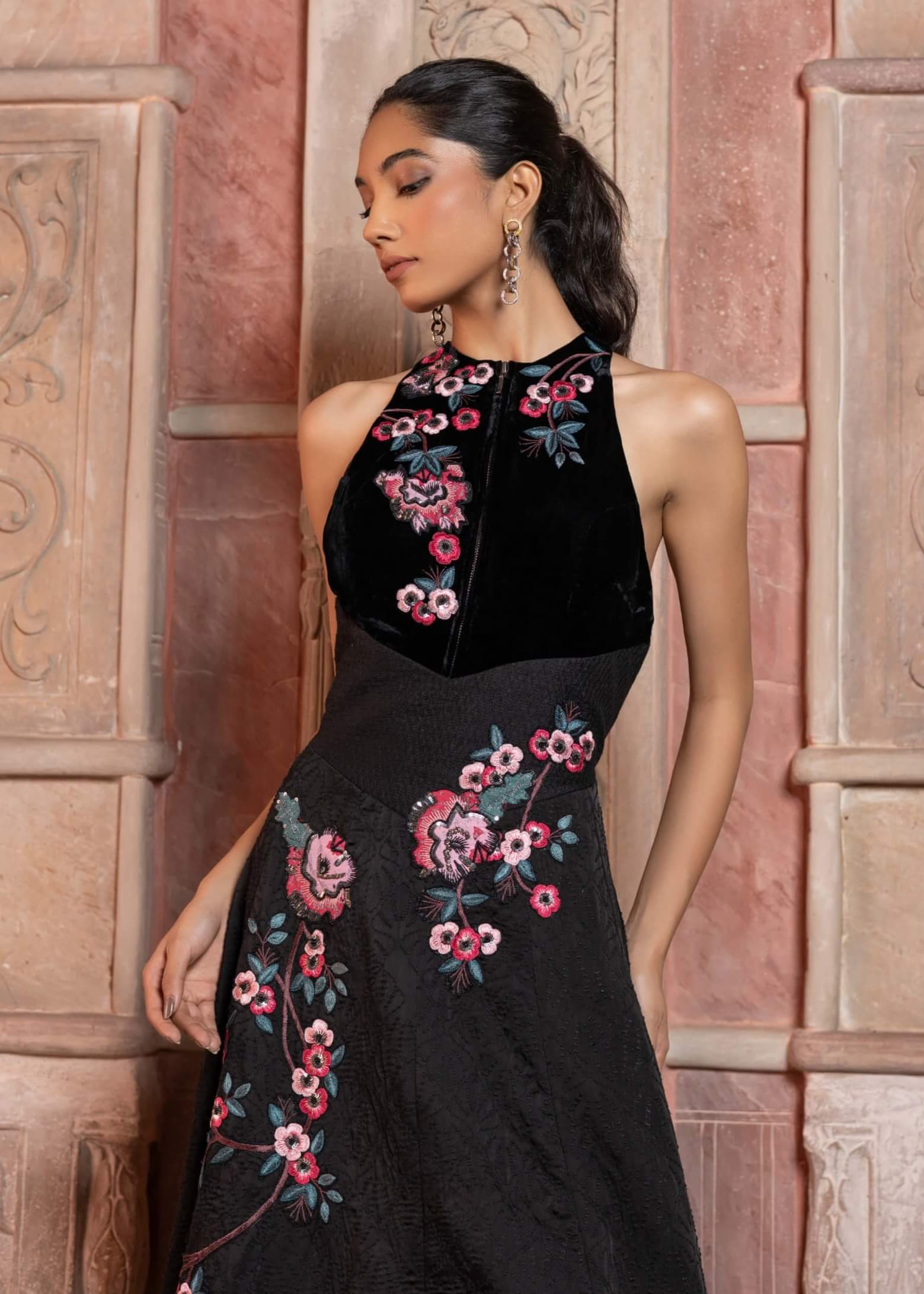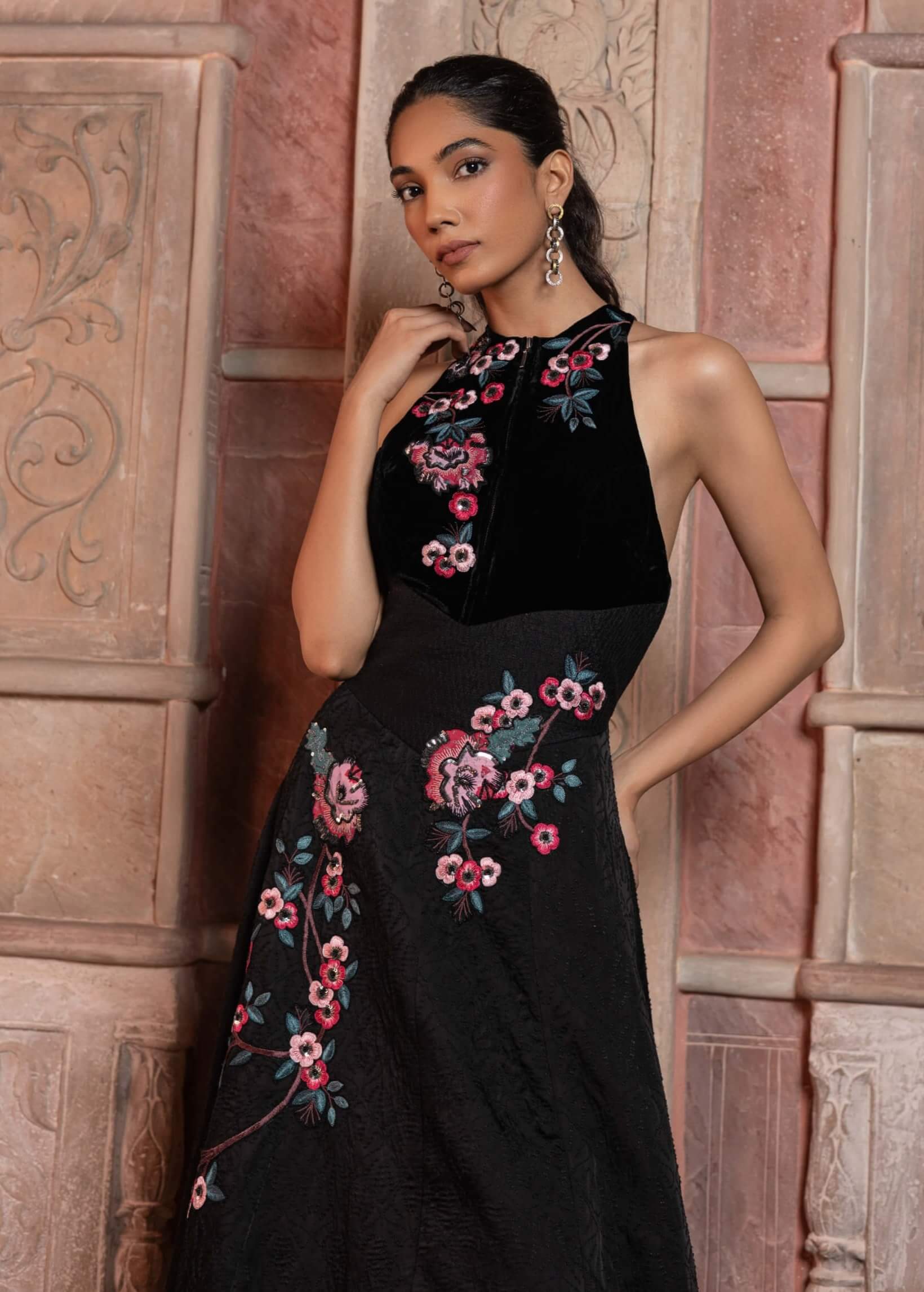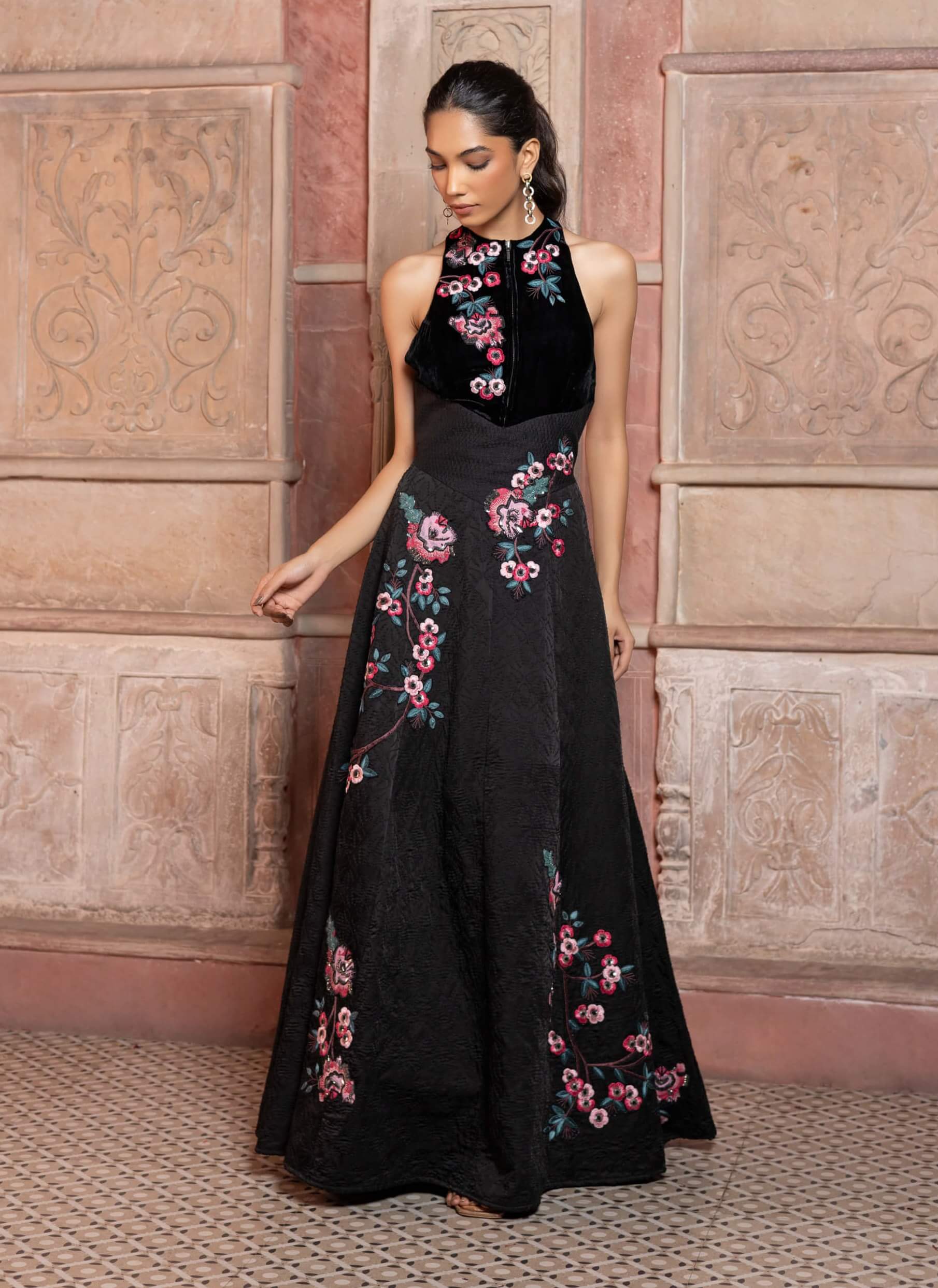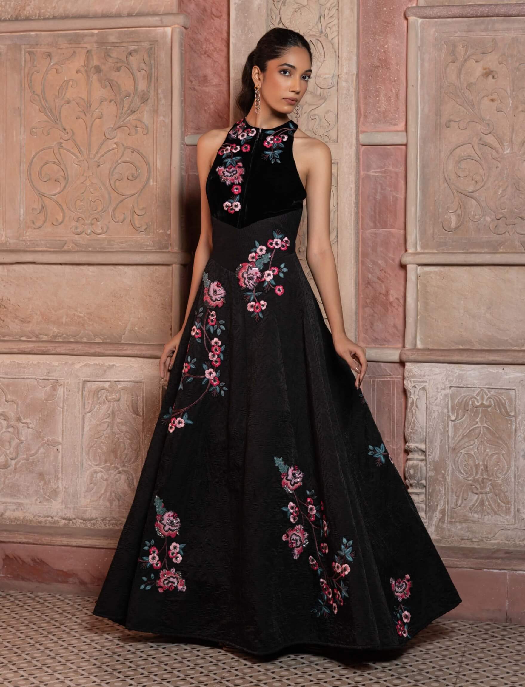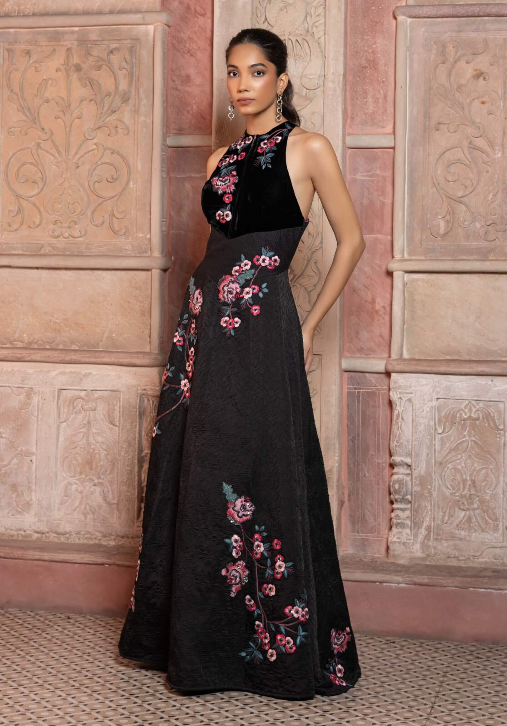 Command attention in this black satin textured maxi featuring a velvet embroidered bodice. The interplay of rich textures and dark hues creates an aura of mystery and sophistication. Ideal for cocktail evenings or formal galas, this silhouette flatters with effortless poise. A statement piece that celebrates luxury through refined simplicity.
