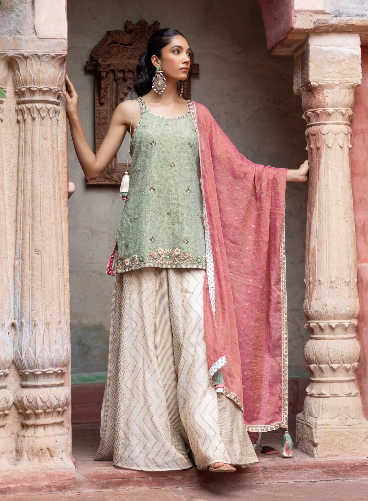 In rich green maheshwari, this short kurta with textured paisley embroidery brings artisanal luxury to everyday elegance. Styled with printed kali pants and a watermelon pink dupatta, it’s ideal for daytime festivities or cultural occasions. A refreshing balance of color, texture, and traditional detailing.