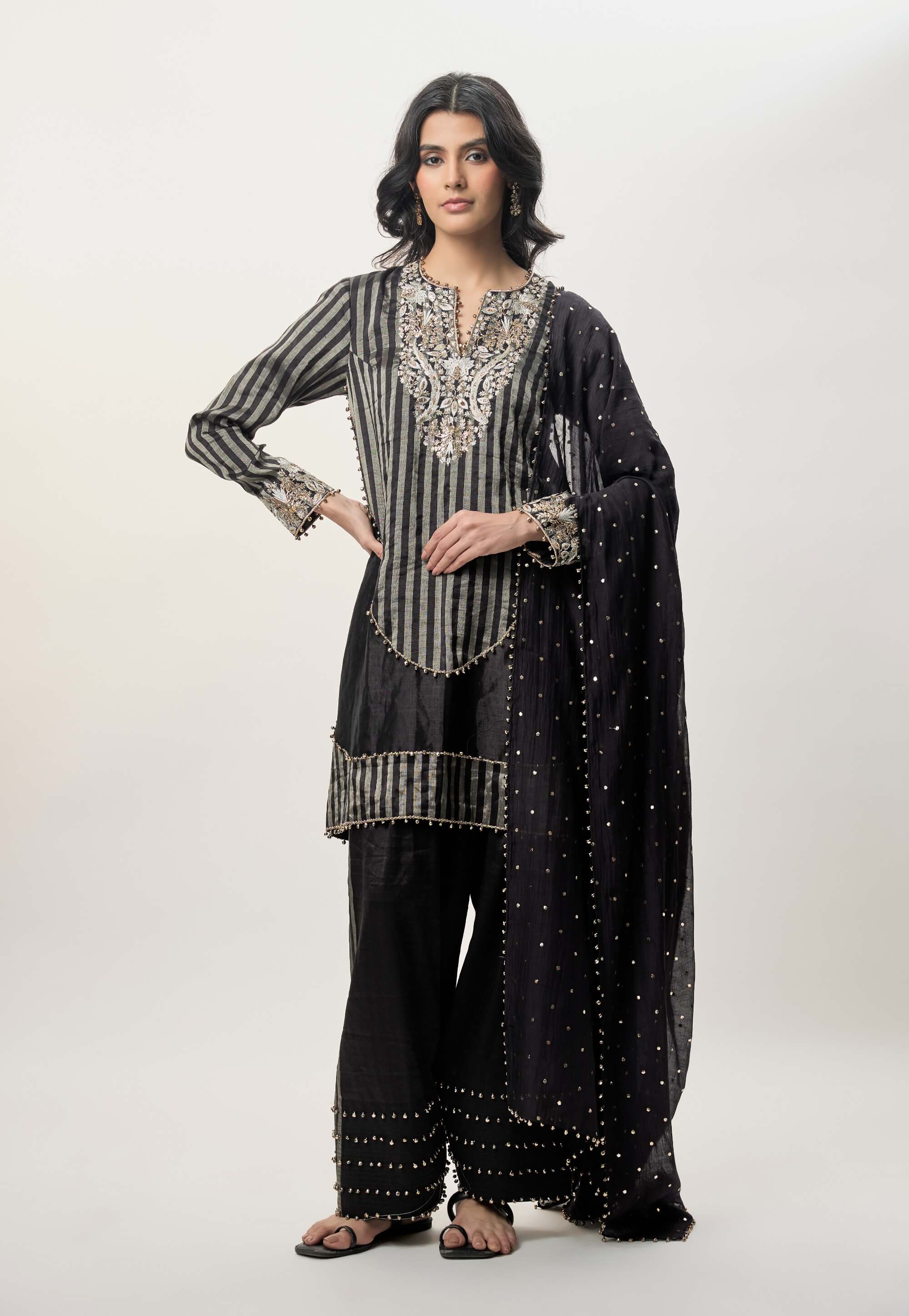 A striped tissue kurta highlighted with embroidery at the neckline and cuffs. Paired with a matching farshi salwar for traditional volume. The silhouette balances structure and softness. Finished with a silkmul dupatta accented with mukaish dots.
