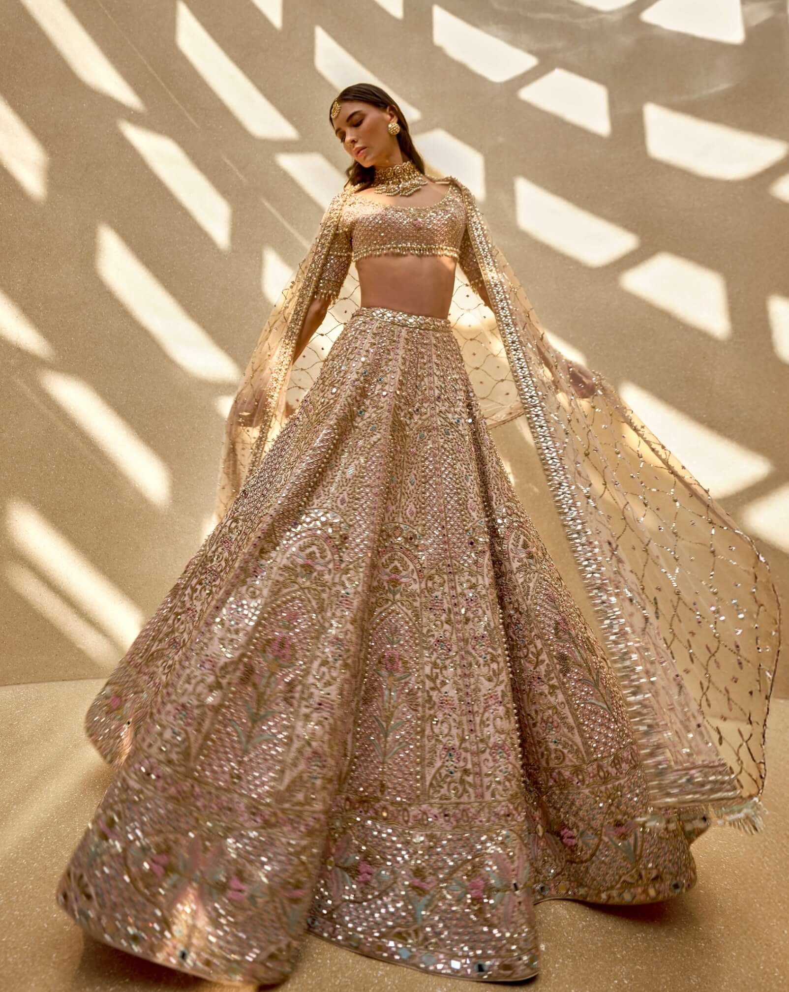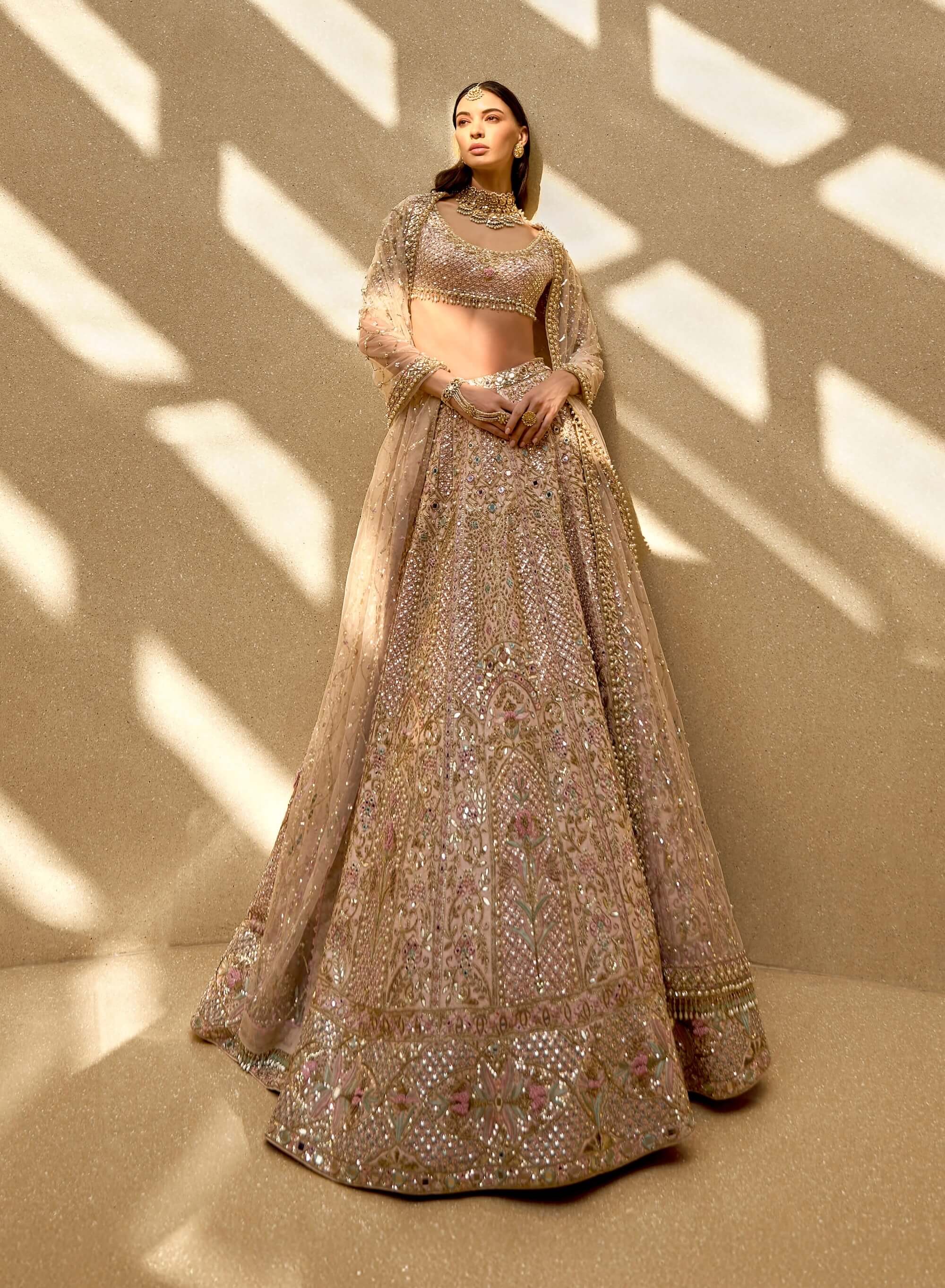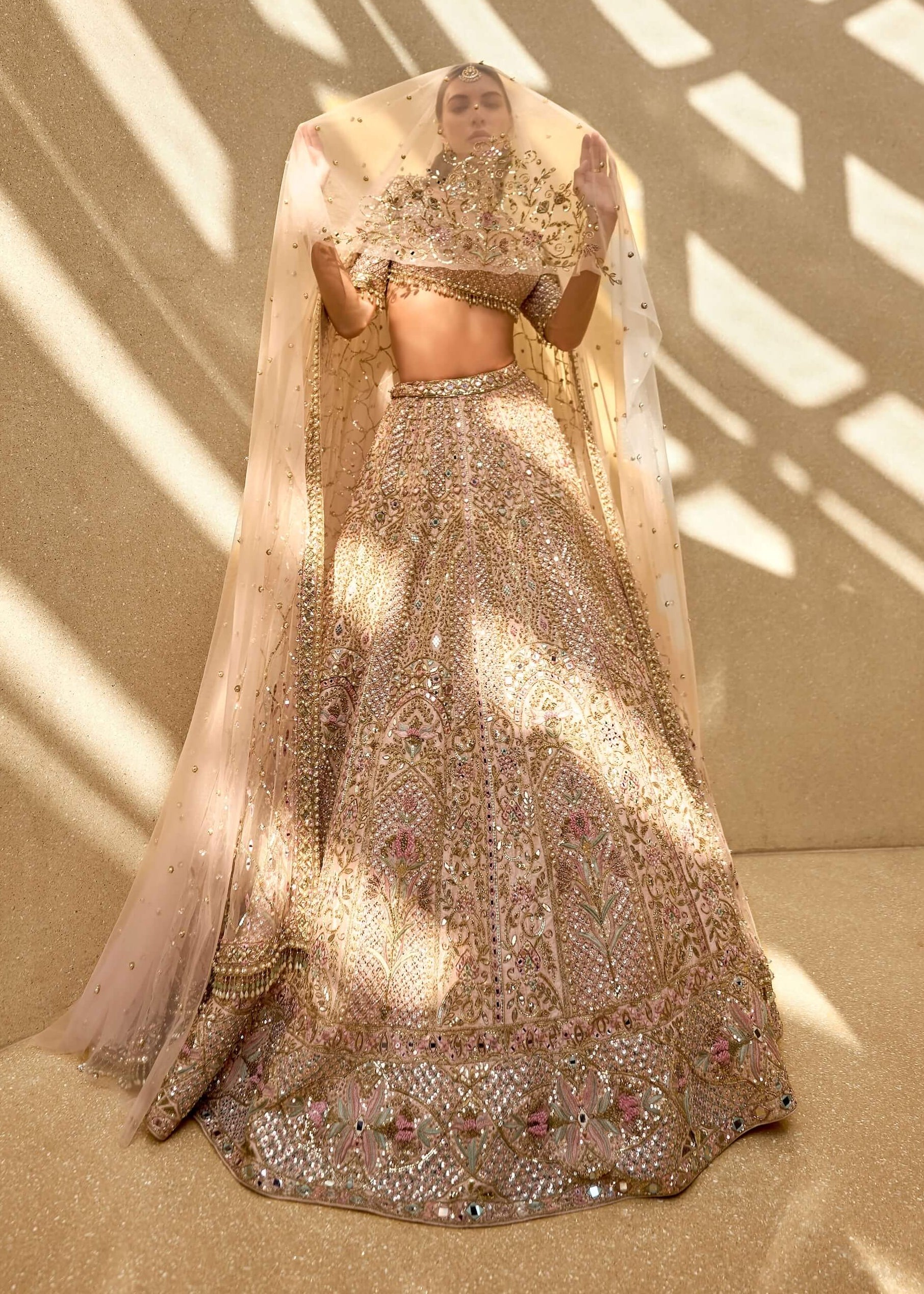 Embodying blush-toned grandeur, this masterpiece brings zardozi artistry to life. A refined baby pink couture zardozi lehenga set crafted in luxurious raw silk and adorned with resham, sequins, gota, sadi, mirror, pearl, and dori embroidery. A delicate yet opulent choice for contemporary bridal celebrations.