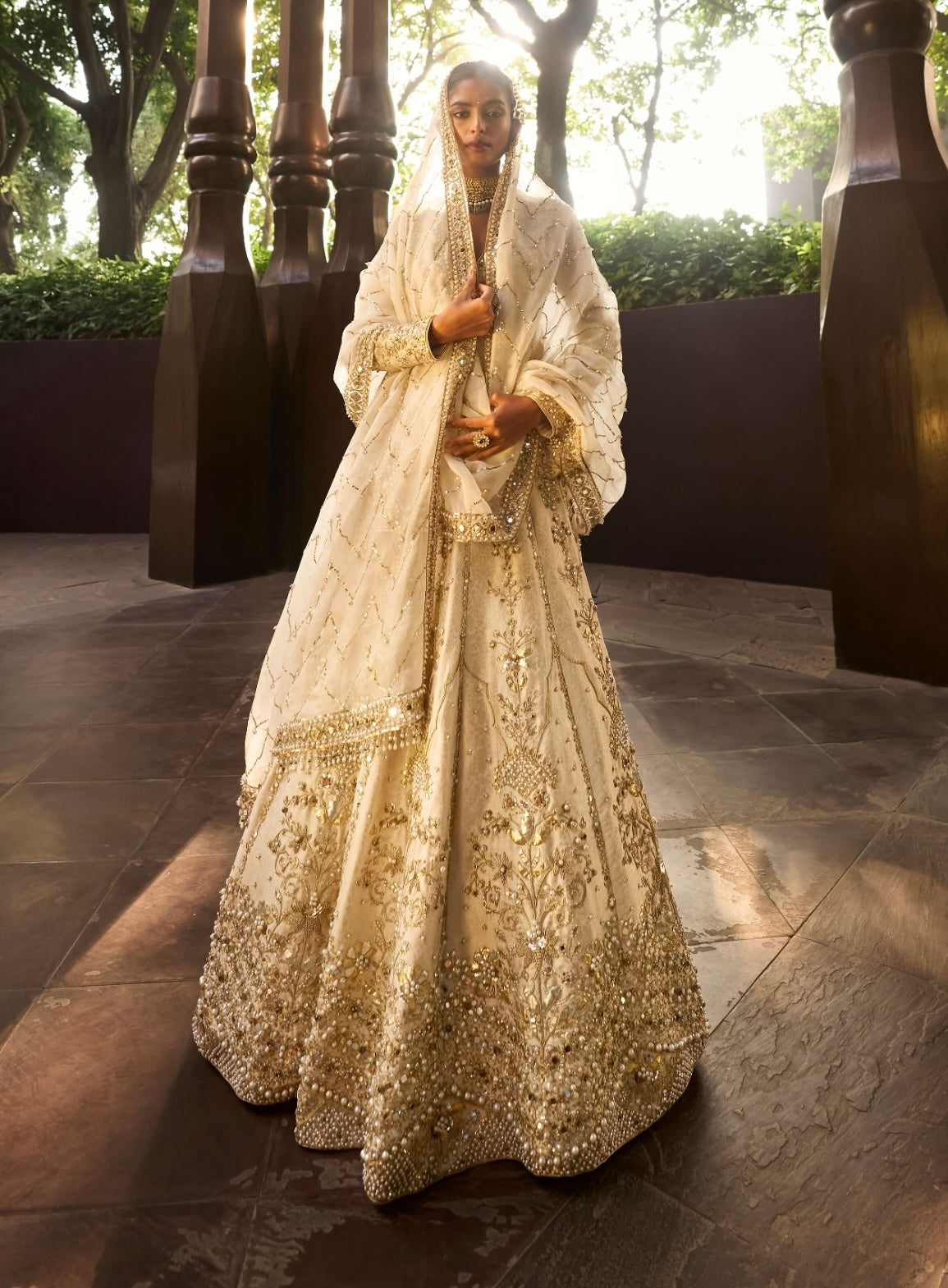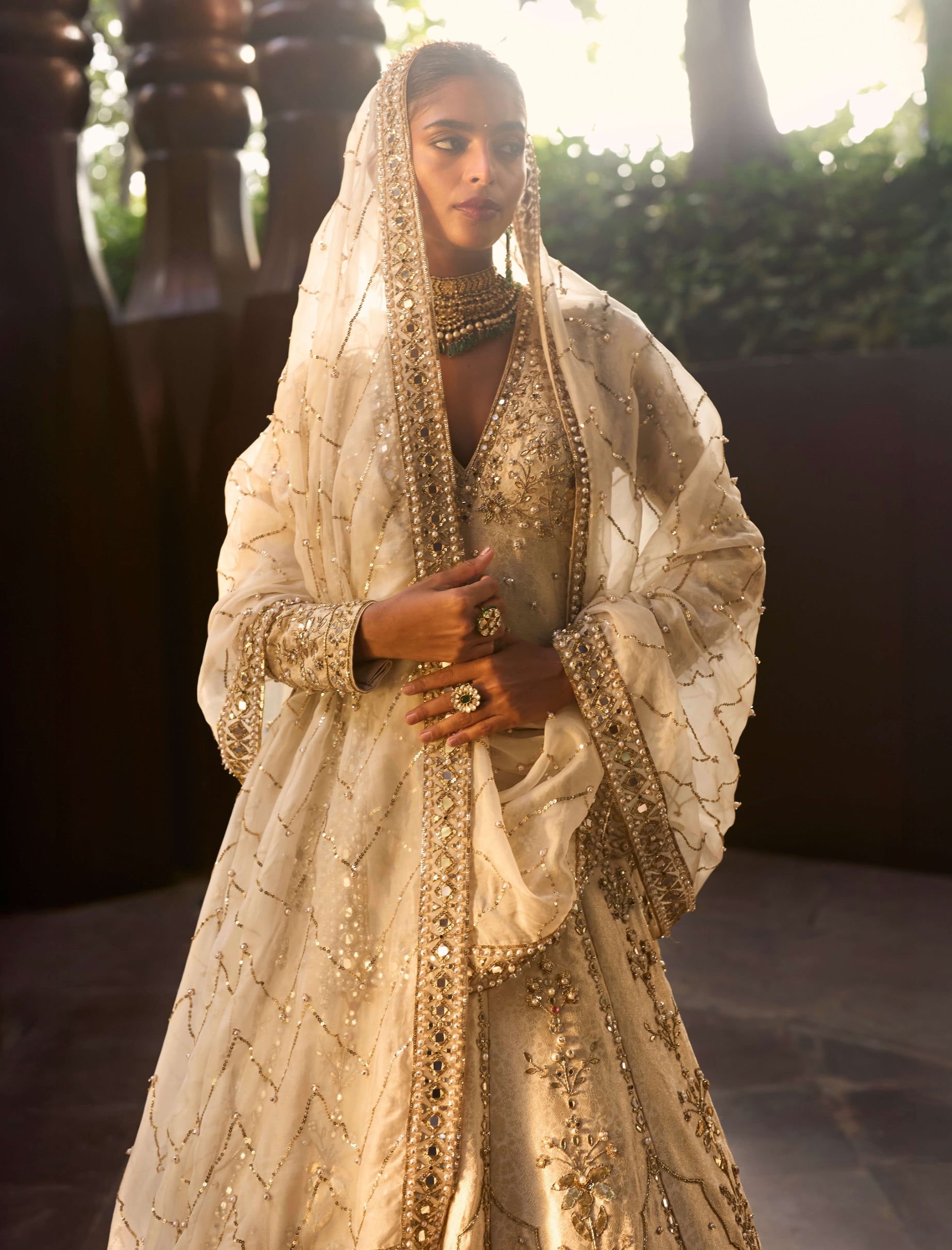 Crafted in the boldest crimson tones, this bridal look merges tradition with striking power. A crimson bridal lehenga set enriched with zari, zardozi, and dori embroidery across a voluminous skirt with floral motifs and a multi-layered gold border. Paired with a structured blouse and sheer dupatta.